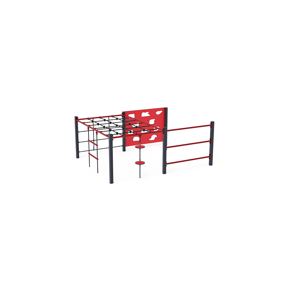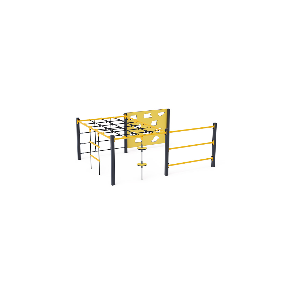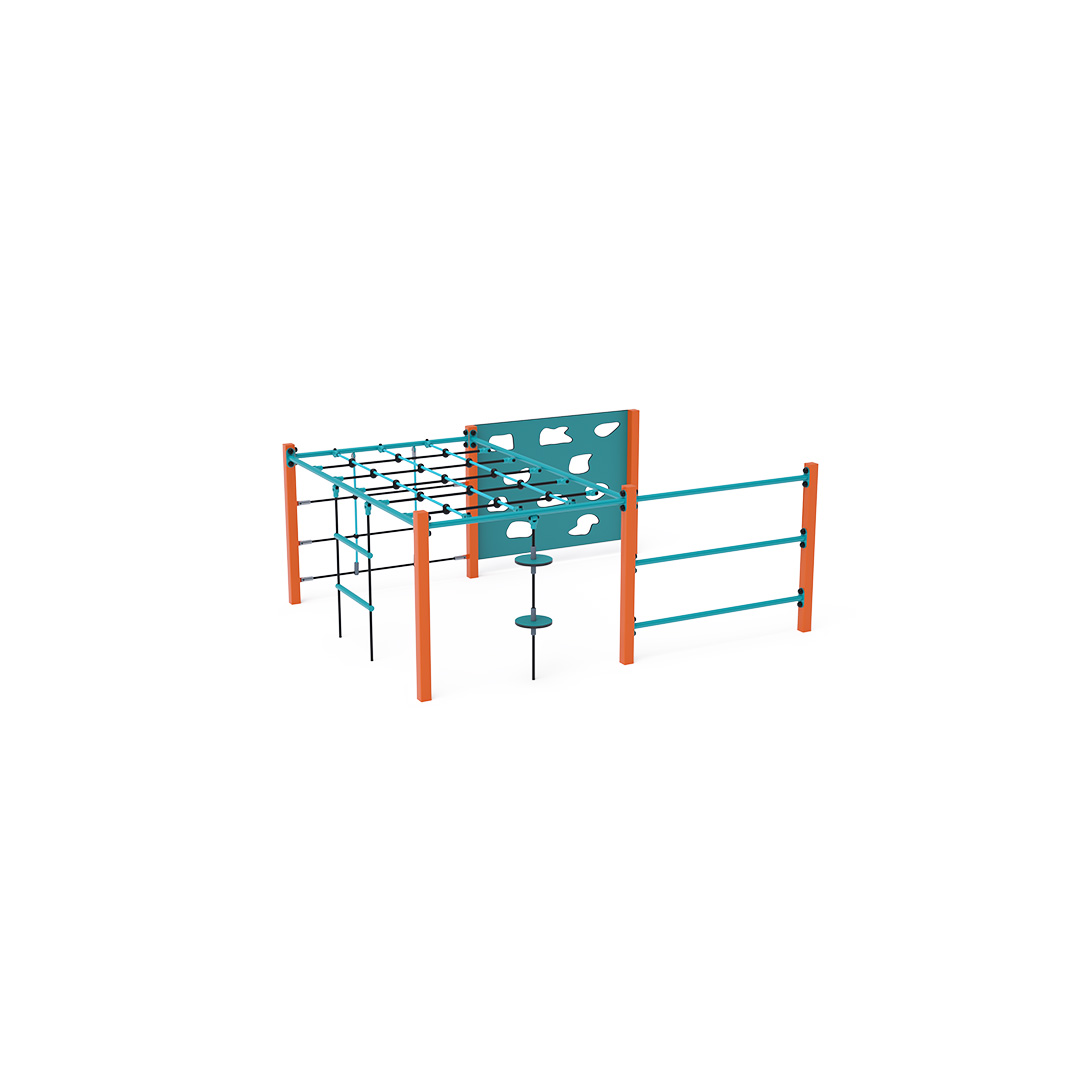 The Mini Gymcenter is a block structure composed of six segments: a climbing ladder, ropes with balancing discs, a rope wall, a ladder, and a climbing rope net. The play element is made of hot-dip galvanized steel with a high-quality surface finish. The joints are stainless steel and covered with plastic caps to enhance safety and the durability of the connections. The ropes are made from polyester fibers, which are twisted around the center. This rope construction increases its strength and resistance to mechanical stress. Polyester itself has many positive properties: it is resistant to microorganisms, weather conditions, dries quickly after rain, is colorfast, and has high strength. The Mini Gymcenter VVZ-MGYM006 is certified according to the STN EN 1176 standard.