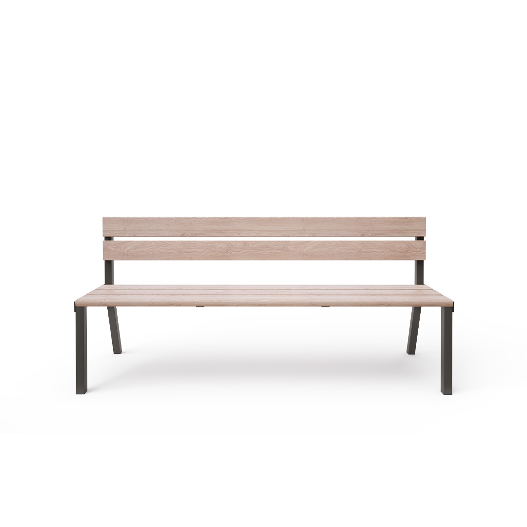 A designer park bench with a backrest, suitable not only for outdoor use—parks, playgrounds, squares—but also for indoor use—shopping centers, airport terminals, entrance halls, etc.