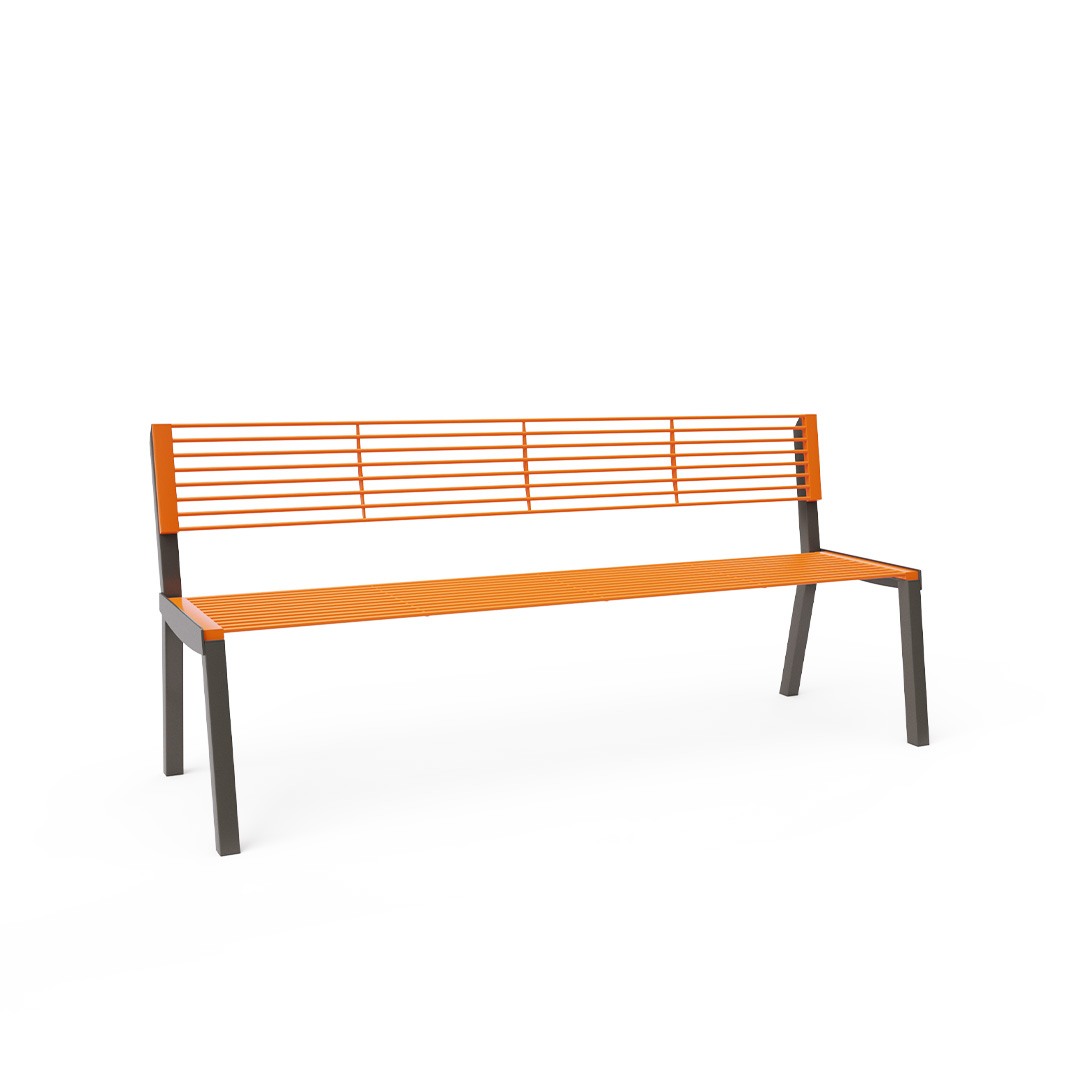 A designer park bench with a backrest, suitable not only for outdoor use - parks, playgrounds, squares but also for indoor use - shopping centers, airport terminals, entrance halls, etc.