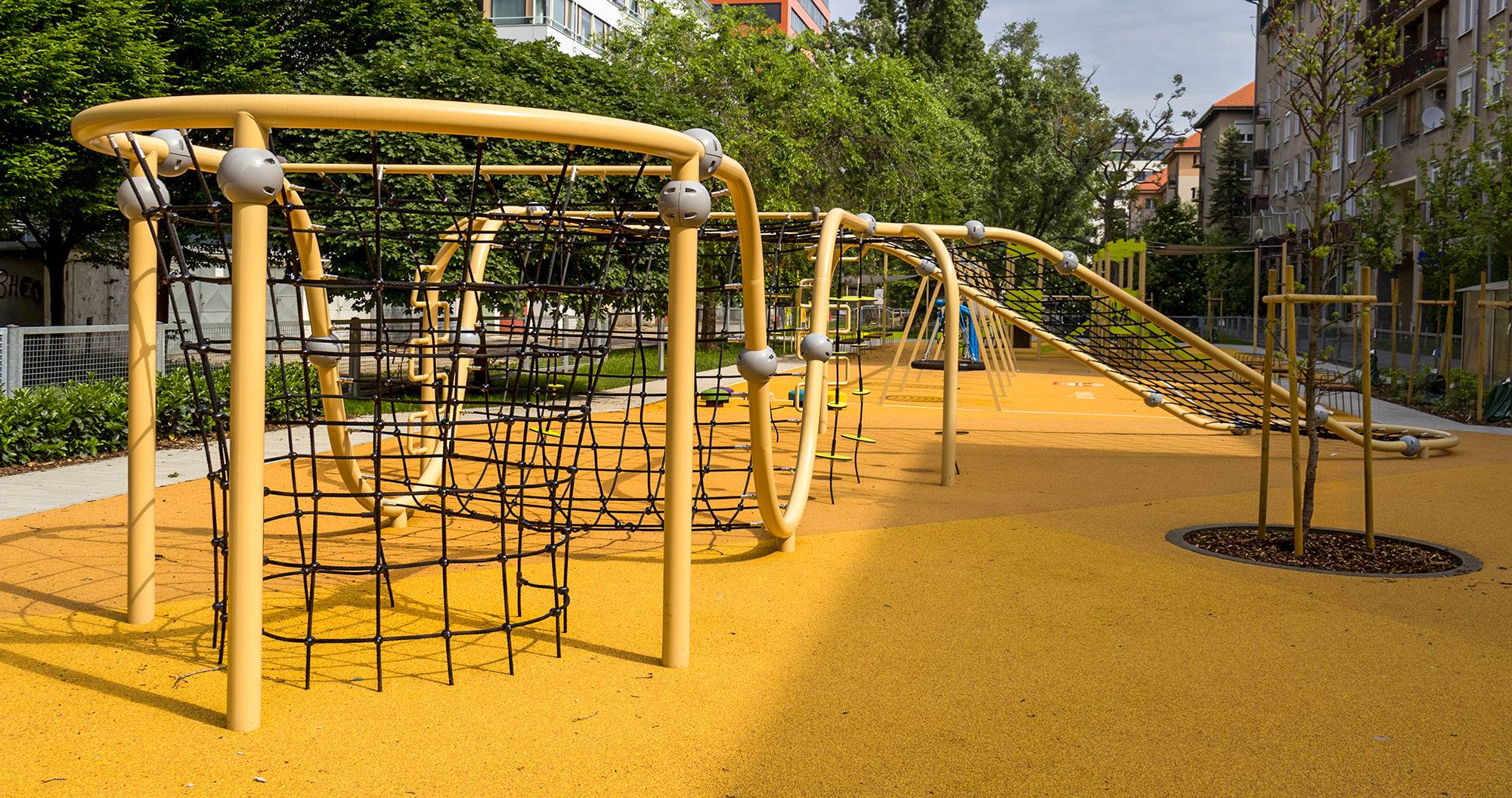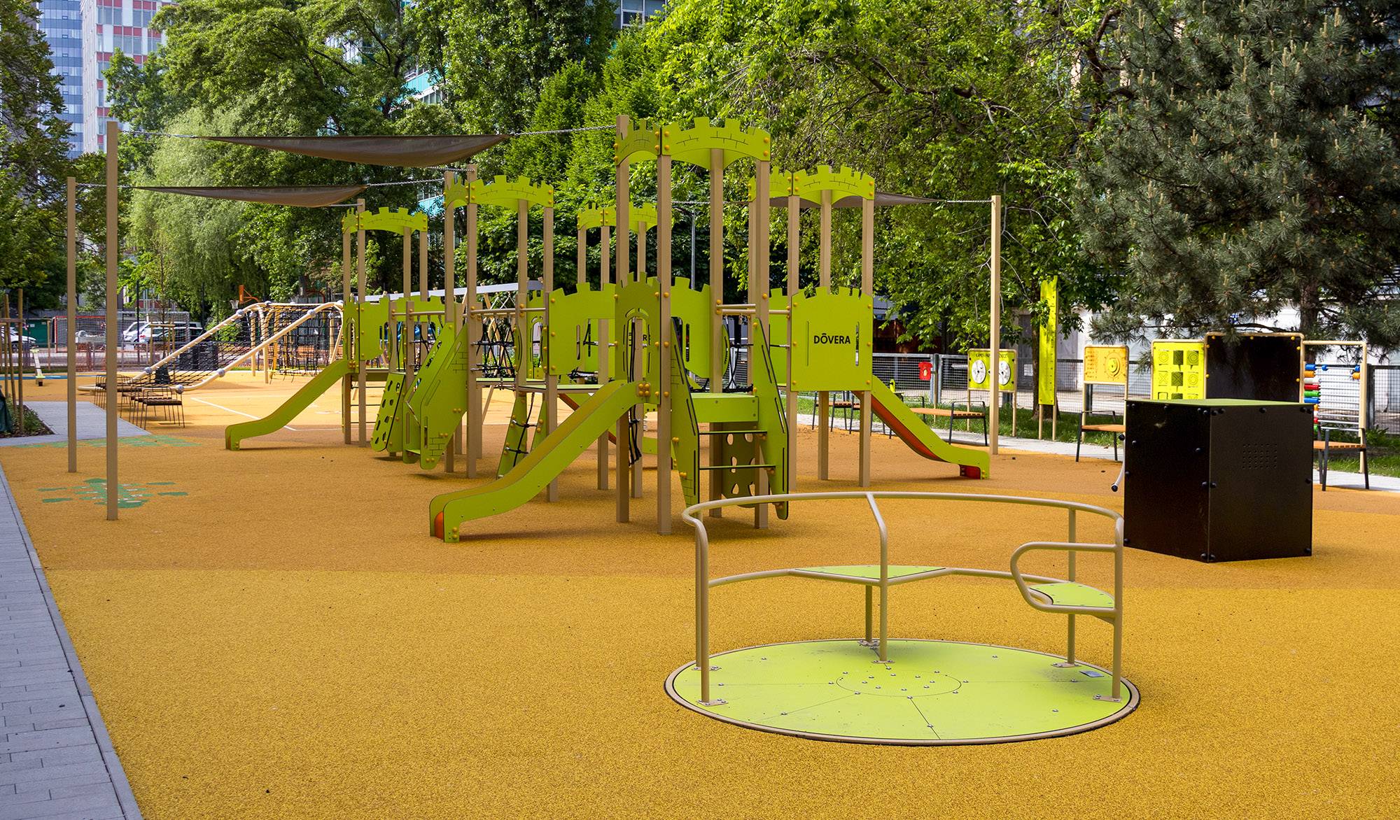 Accessibility is ensured by a combination of water-permeable EPDM surfaces, interlocking paving and landscaped greenery. The presence of multiple types of surfaces creates the possibility of smooth and safe movement even for children in wheelchairs or with mobility restrictions.