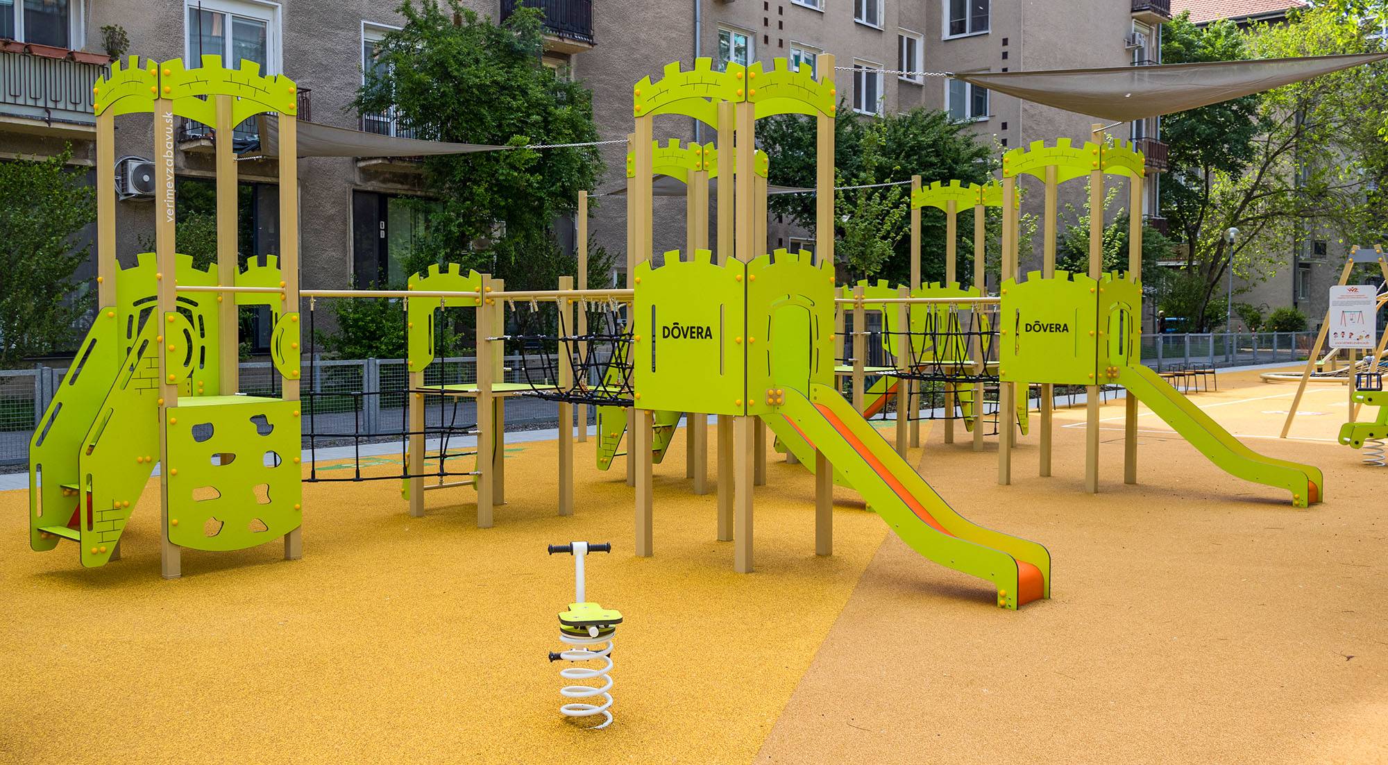 A renovated inclusive playground on Budovateľská Street in Ružinov. The playground is completely barrier-free and equipped with modern elements that take into account the needs of children with various forms of disability.