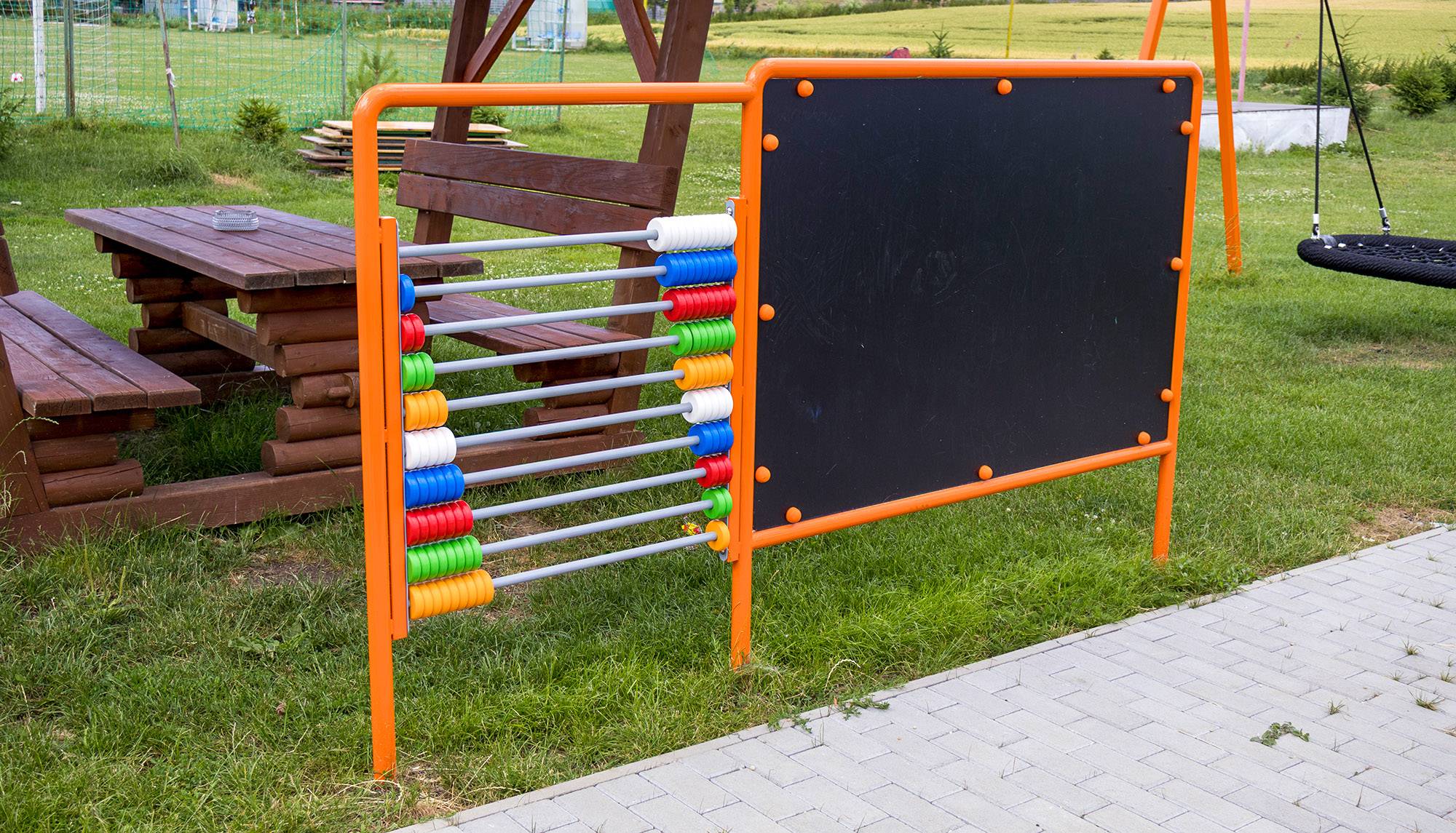 The third part of the playground is an educational panel that combines fun with learning. Children can draw and learn the basics of mathematics using our colorful abacus.