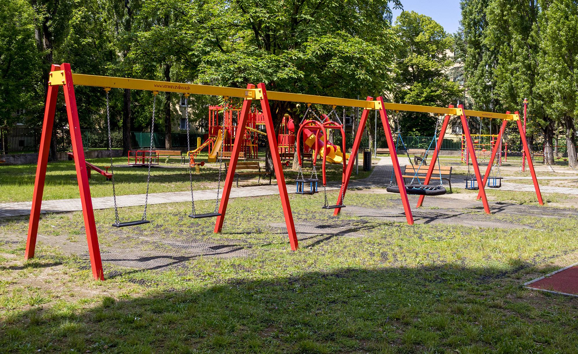 The original playground on Medzilaborecká Street in Bratislava had been in disrepair for almost 30 years and had to be completely removed, including hundreds of meters of weathered asphalt. Grassy areas and water-permeable surfaces were added in its place.