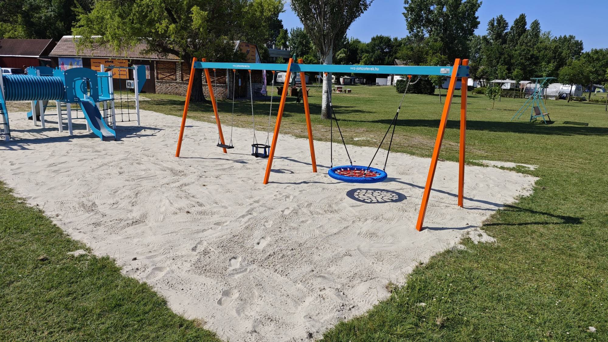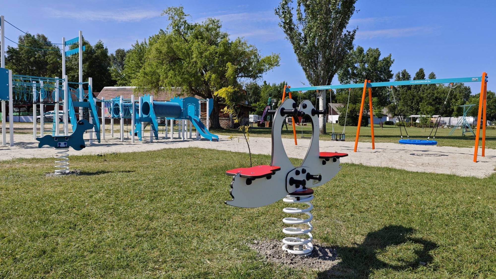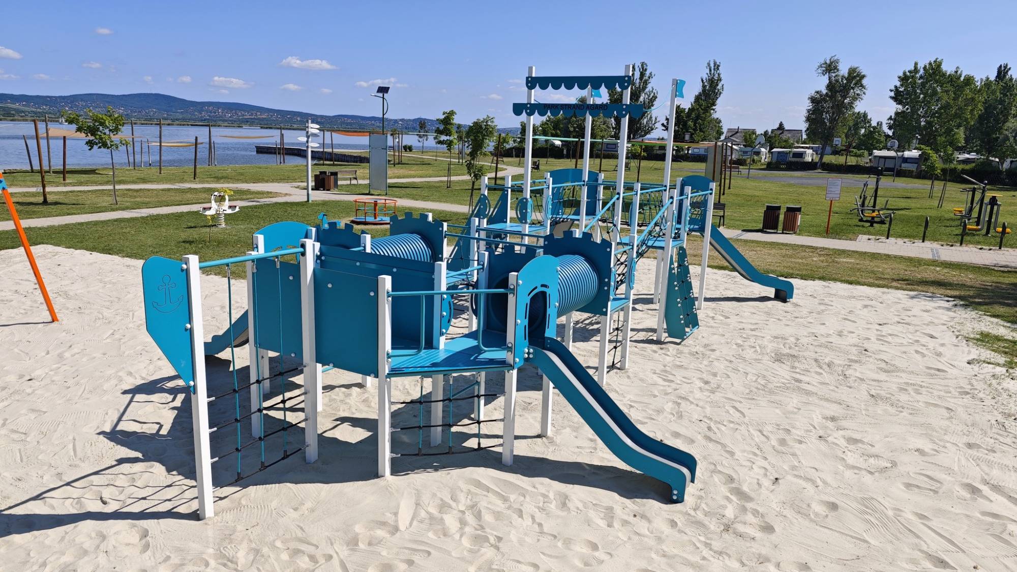 A new playground and fitness park has been created in the Agárd campsite on the shores of Lake Velence. The project includes several playground elements and modern fitness machines. Not only children, but also parents will find fun.