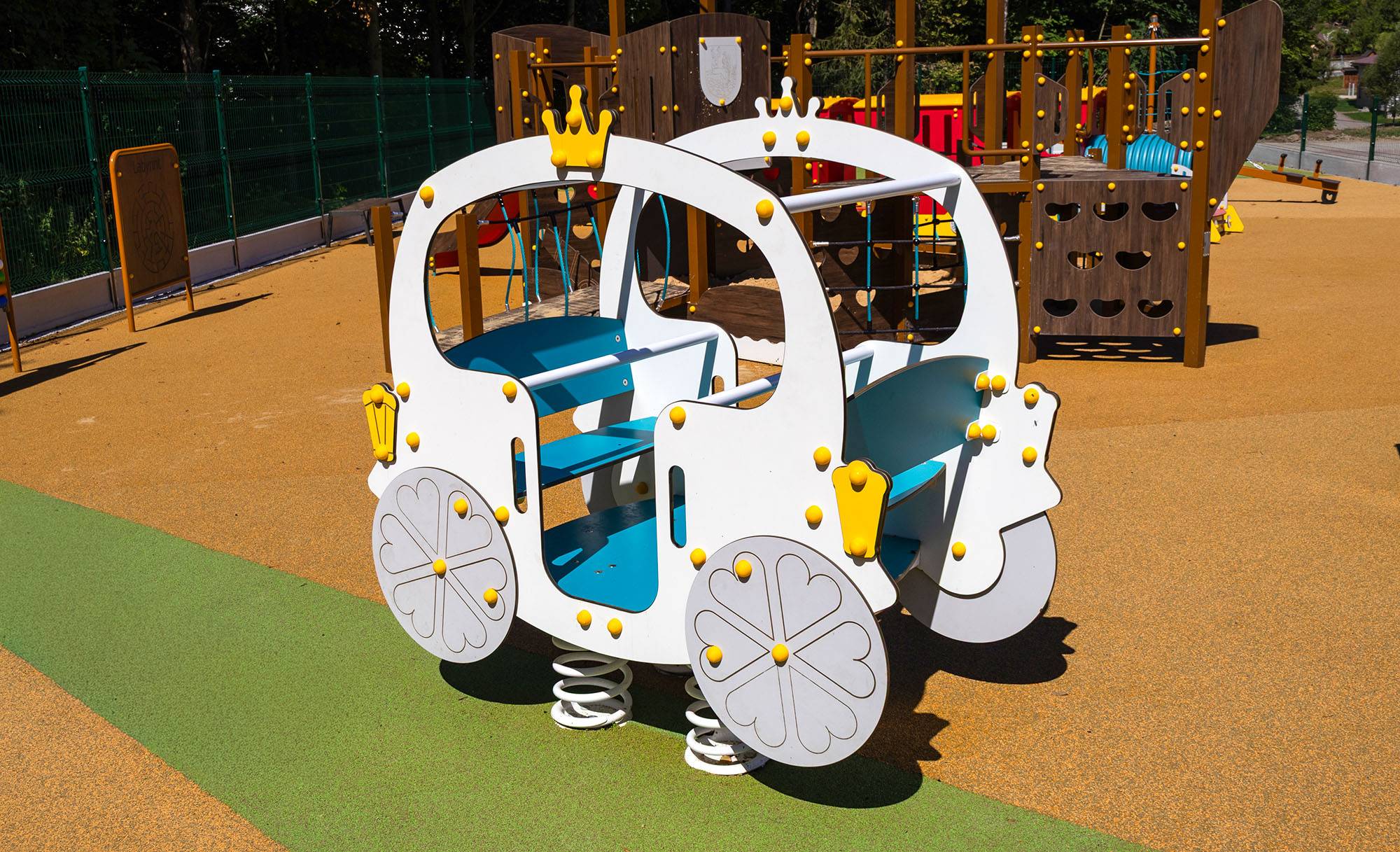 For smaller children, we have prepared a spring swing of a princess carriage with unicorns, a police car, a tractor with a trailer or a locomotive with wagons - these elements support imagination and play as princesses and princes, police officers, farmers or little travelers.