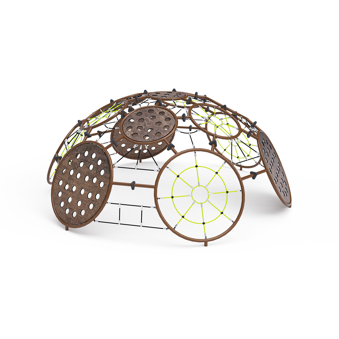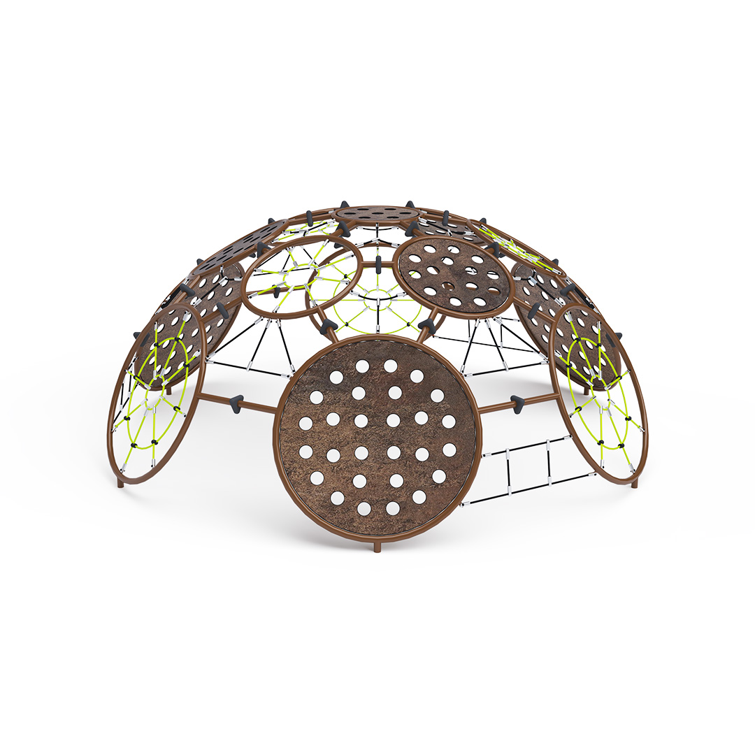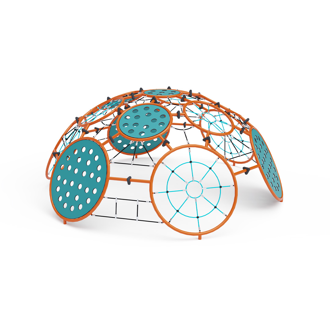 The large rope dome consists of various sized rope nets and plastic rings with textured grips, offering plenty of entertainment options. Children can climb its surface or enter the interior through free passages. They can create a bunker inside or simply hang and maneuver on the rope nets. The play element is made of hot-dip galvanized steel with a quality surface finish; joints are stainless steel and covered with plastic caps to enhance safety and durability. Ropes are made of polyester fibers wound around the core, increasing their strength and resistance to mechanical stress. Polyester itself has many positive properties: it is resistant to microorganisms and weather conditions, dries quickly after rain, is colorfast, and exhibits high strength.