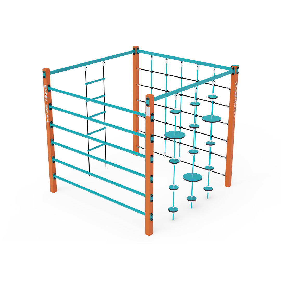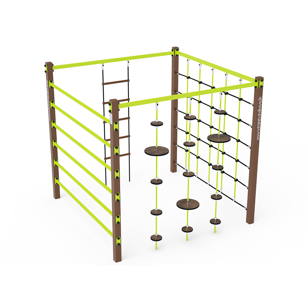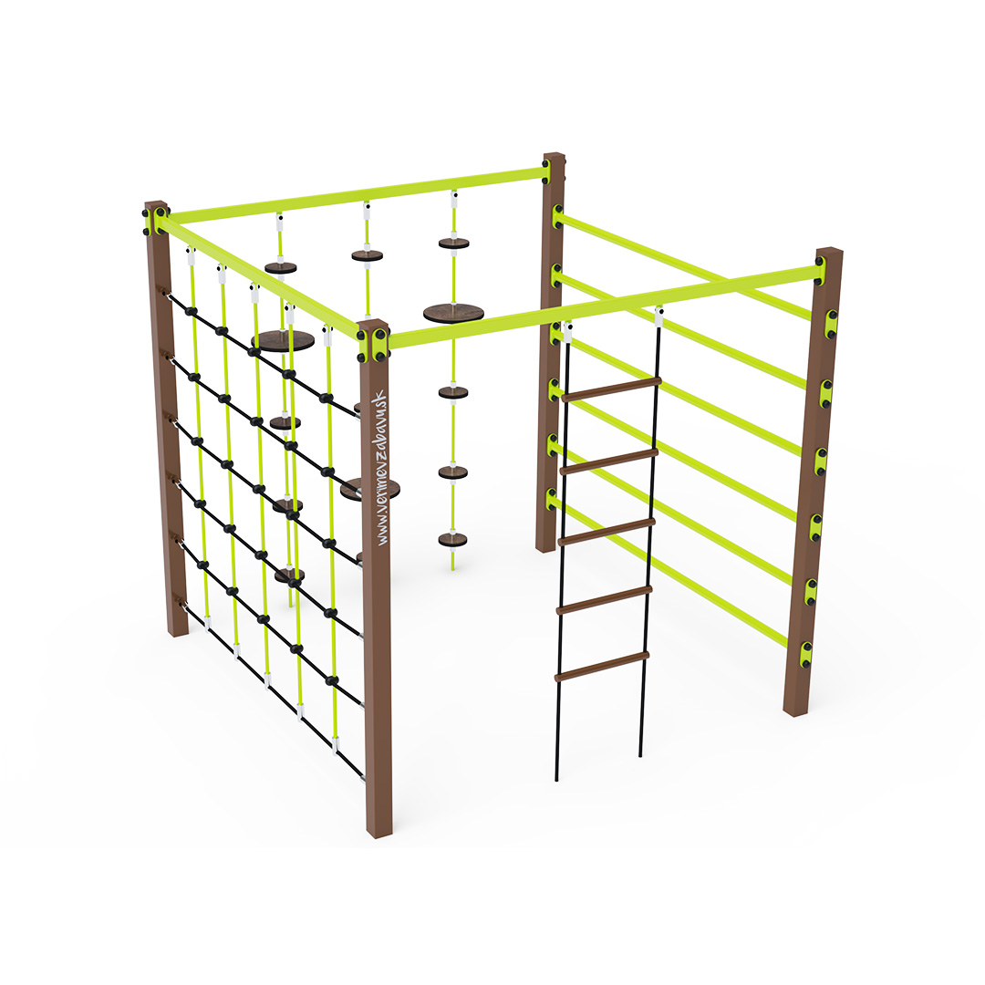 Rope Gymcenter is a cube featuring a rope net, ladder, long rungs, and ropes with balancing discs. The play element is made of hot-dip galvanized steel with a high-quality surface finish. Joints are stainless steel and covered with plastic caps to enhance safety and durability. Ropes are made of polyester fibers wound around a core, increasing their strength and resistance to mechanical stress. Polyester itself has many positive qualities: it is resistant to microorganisms, weather conditions, dries quickly after rain, retains its color, and is highly durable. Rope Gymcenter VVZ-GYM002 is certified according to the STN EN 1176 standard.