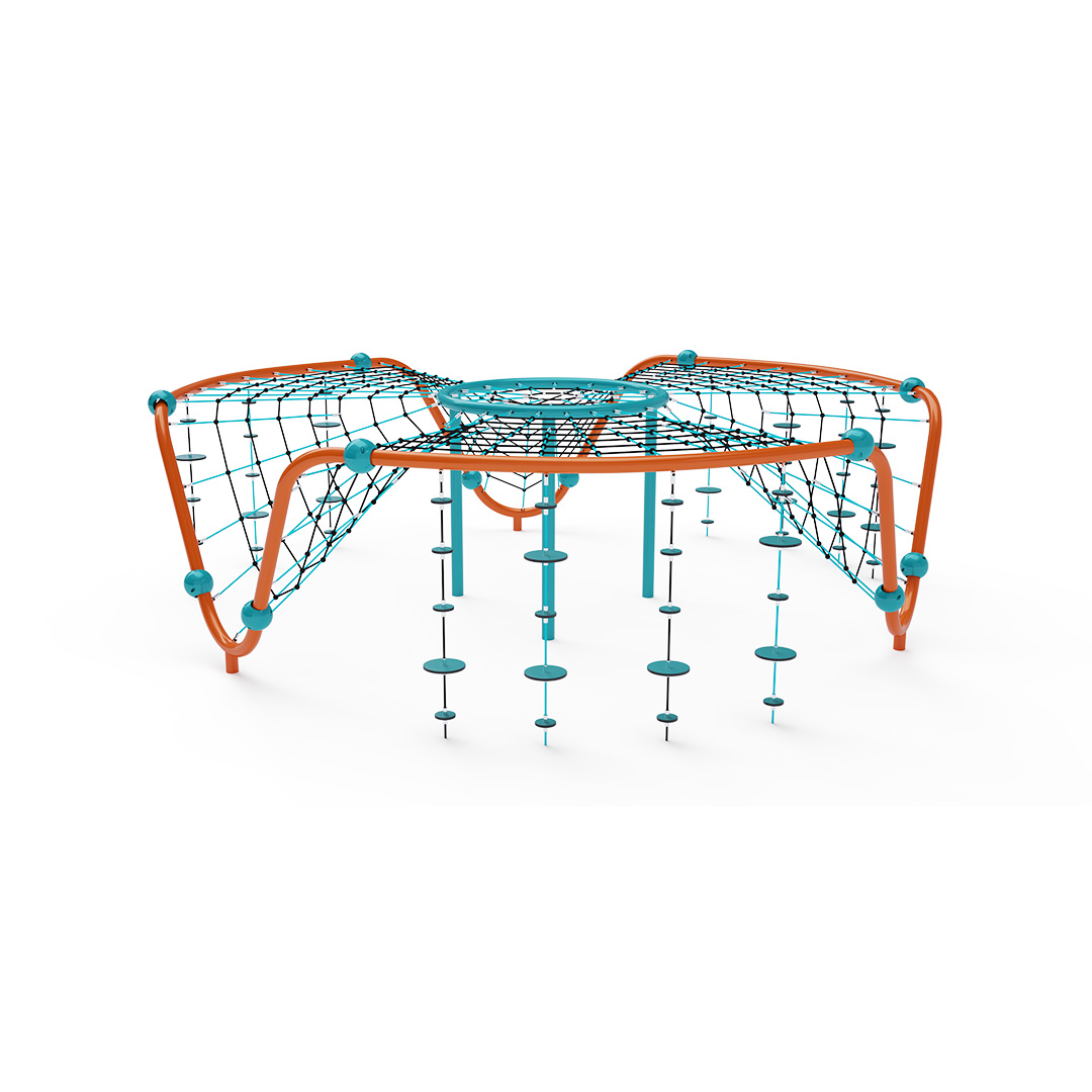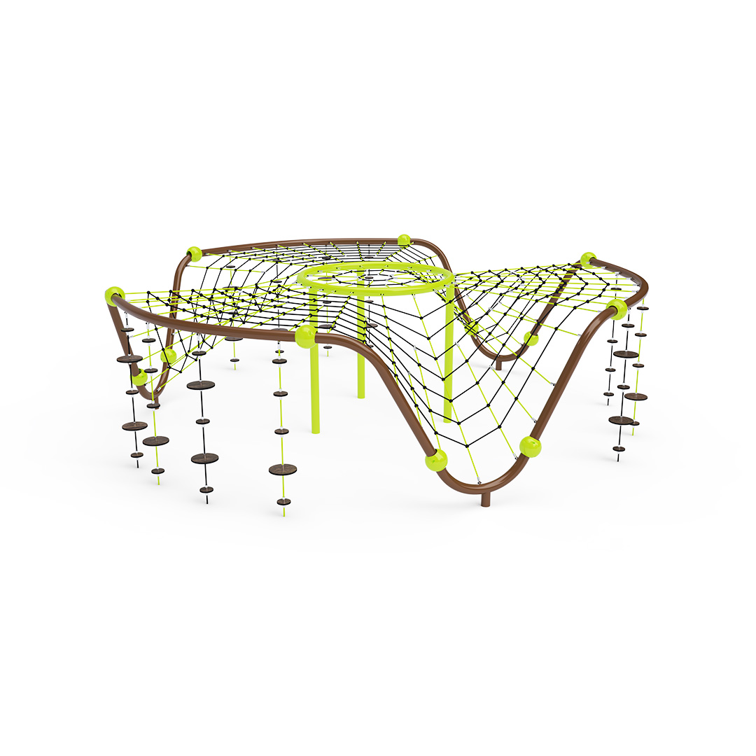 A large rope igloo with rope exits and a large upper rope net is complemented by twelve suspended balance stones. The structure is made of galvanized steel treated with a layer of baked-on KOMAXIT paint. All joints are stainless steel and covered with plastic caps to enhance safety and joint durability. The ropes are made of polyester fibers wound around the core, which increases their strength and resistance to mechanical stress. Polyester itself has numerous positive properties: it is resistant to microorganisms, weather conditions, dries quickly after rain, retains color stability, and exhibits high strength.