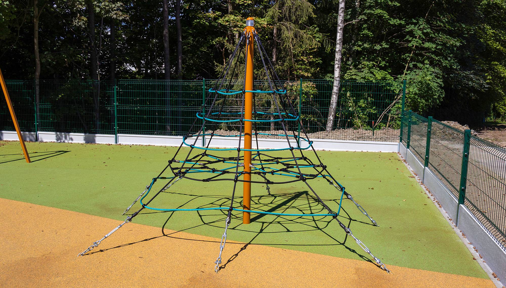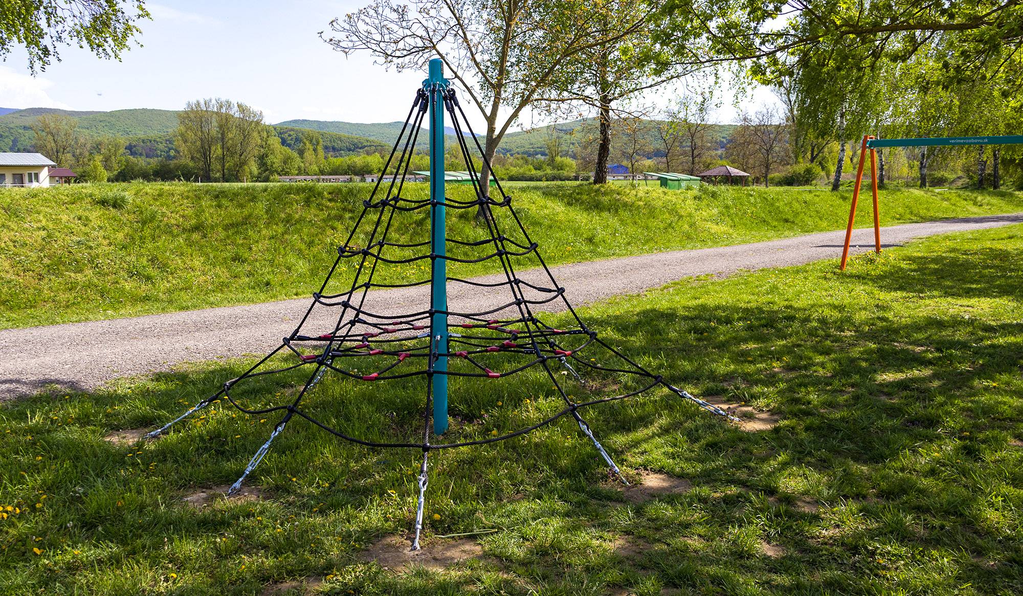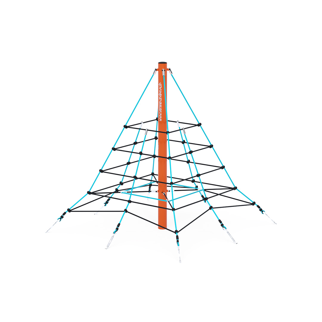 The two-meter rope pyramid is also suitable for smaller children, who will surely gain the courage to climb to the top. The play element is made from hot-dip galvanized steel with a high-quality surface finish. The joints are stainless steel and covered with plastic caps to enhance safety and prolong the joints' lifespan. The ropes are made from polyester fibers wound around a core. This rope construction increases its strength and resistance to mechanical stress. Polyester itself has many positive properties: it is resistant to microorganisms and weather conditions, dries quickly after rain, retains its color, and is highly durable.A grass surface can be used as the impact area, but we recommend using a grass reinforcement mat.