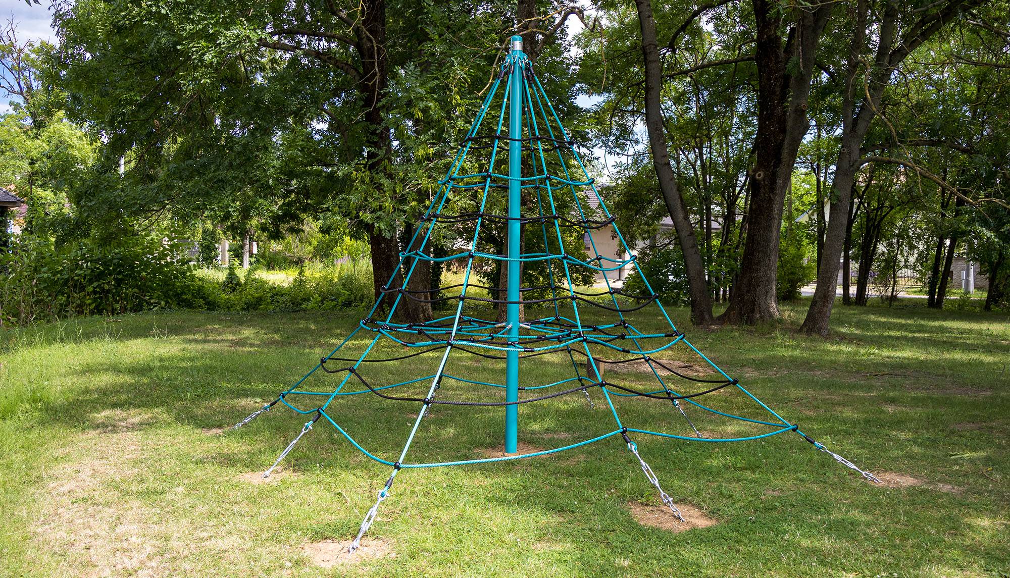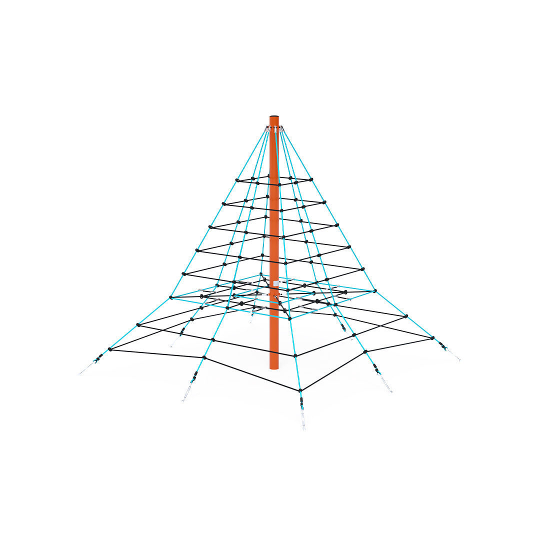 The three-meter rope pyramid is also suitable for smaller children, who, with the presence of a parent, will gain the courage to climb to the top. The play element is made from hot-dip galvanized steel with a high-quality surface finish. The joints are stainless steel and covered with plastic caps to enhance safety and prolong the joints' lifespan. The ropes are made from polyester fibers wound around a core. This rope construction increases its strength and resistance to mechanical stress. Polyester itself has many positive properties: it is resistant to microorganisms and weather conditions, dries quickly after rain, retains its color, and is highly durable.A grass surface can be used as the impact area, but we recommend using a grass reinforcement mat.