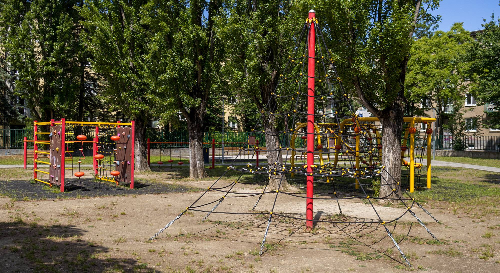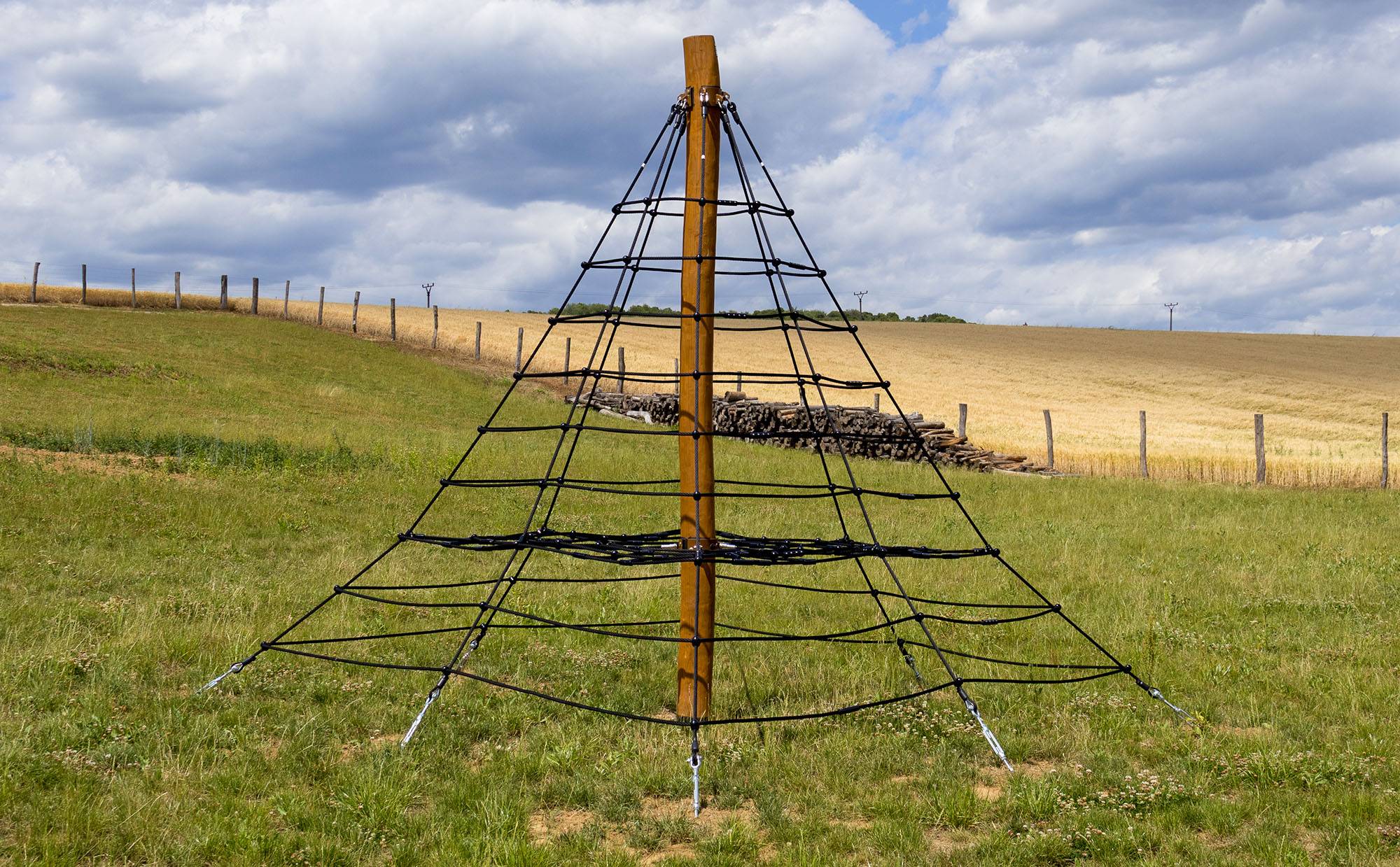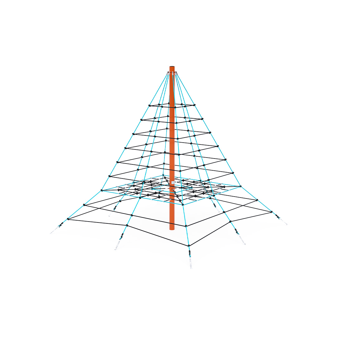 The three and a half meter rope pyramid is suitable for smaller children, who, with the presence of a parent, will gain the courage to climb to the top. The play element is made from galvanized and powder-coated steel with a high-quality surface finish. The joints are stainless steel and covered with plastic caps to enhance safety and prolong the joints' lifespan. The ropes are made from polyester fibers wound around a core. This rope construction increases its strength and resistance to mechanical stress. Polyester itself has many positive properties: it is resistant to microorganisms and weather conditions, dries quickly after rain, retains its color, and is highly durable.A grass surface can be used as the impact area, but we recommend using a grass reinforcement mat.