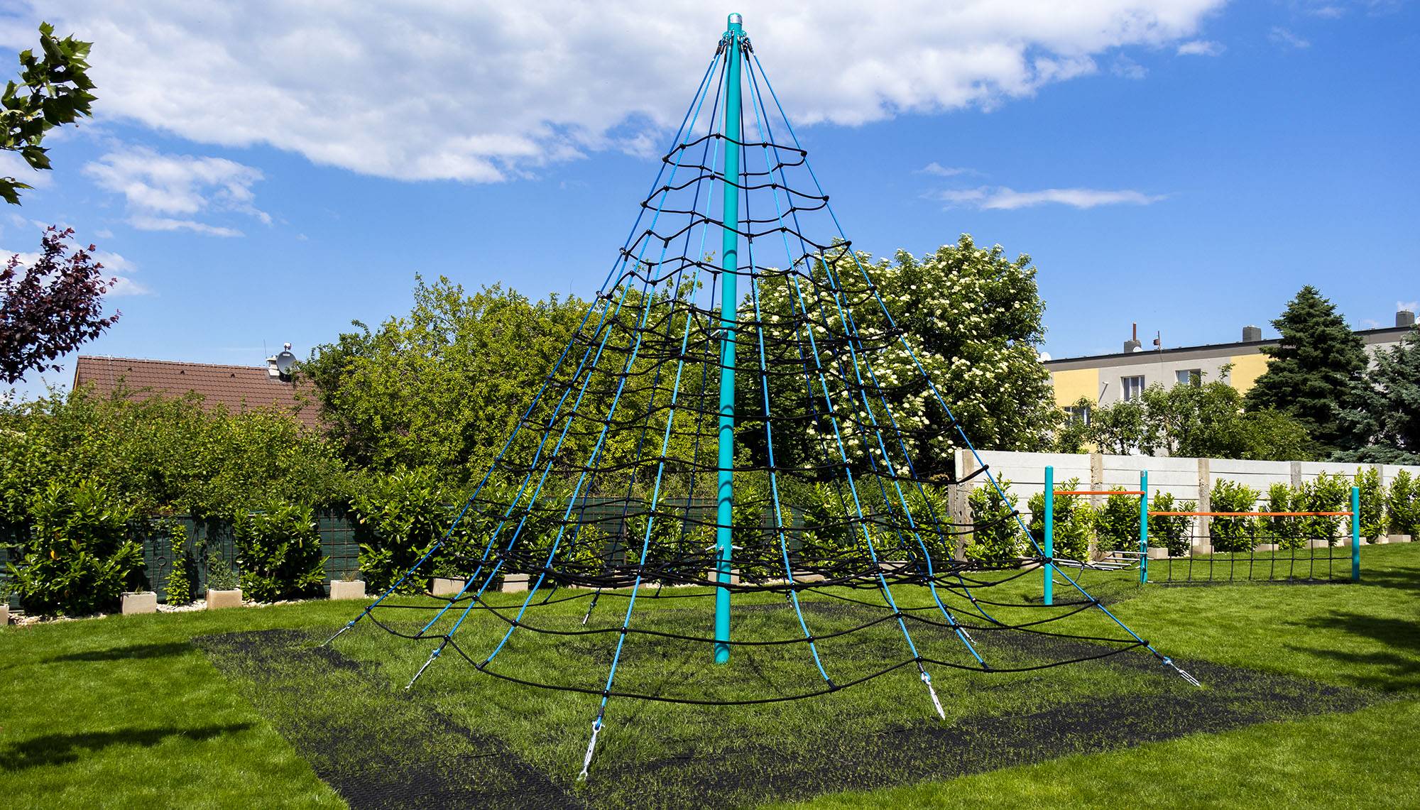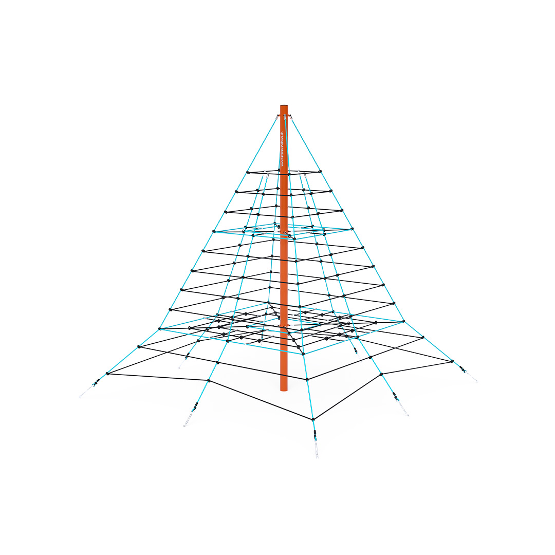 The four-meter rope pyramid is suitable for older children who have the courage to climb to the top. The play element is made from galvanized steel with a high-quality surface finish. The joints are stainless steel and covered with plastic caps to enhance safety and prolong the lifespan of the joints. The ropes are made from polyester fibers wound around a core, increasing their strength and resistance to mechanical stress. Polyester itself has many positive properties: it is resistant to microorganisms and weather conditions, dries quickly after rain, retains its color, and is highly durable.A grass surface can be used as the impact area, but we recommend using a grass reinforcement mat.