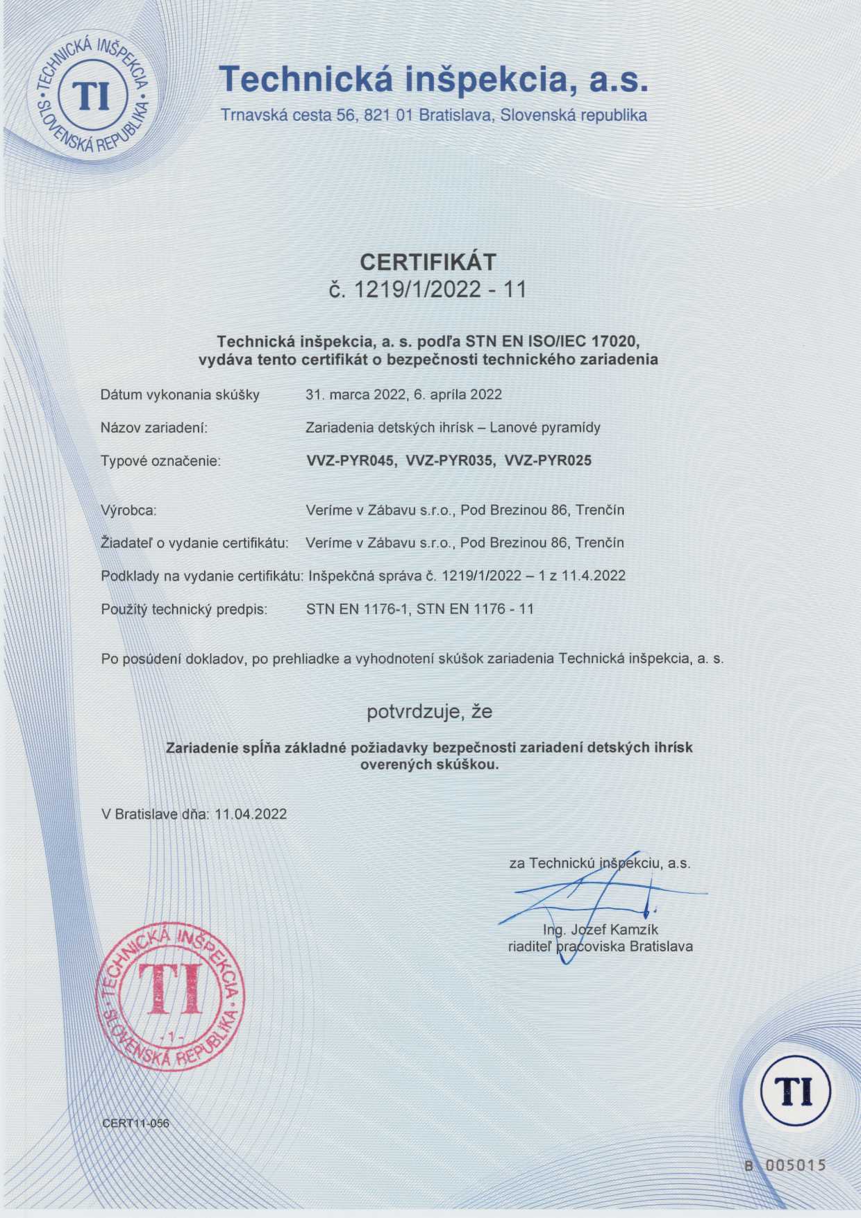 The VVZ-PYR045 Rope Pyramid is certified according to the STN EN 1176 standard.