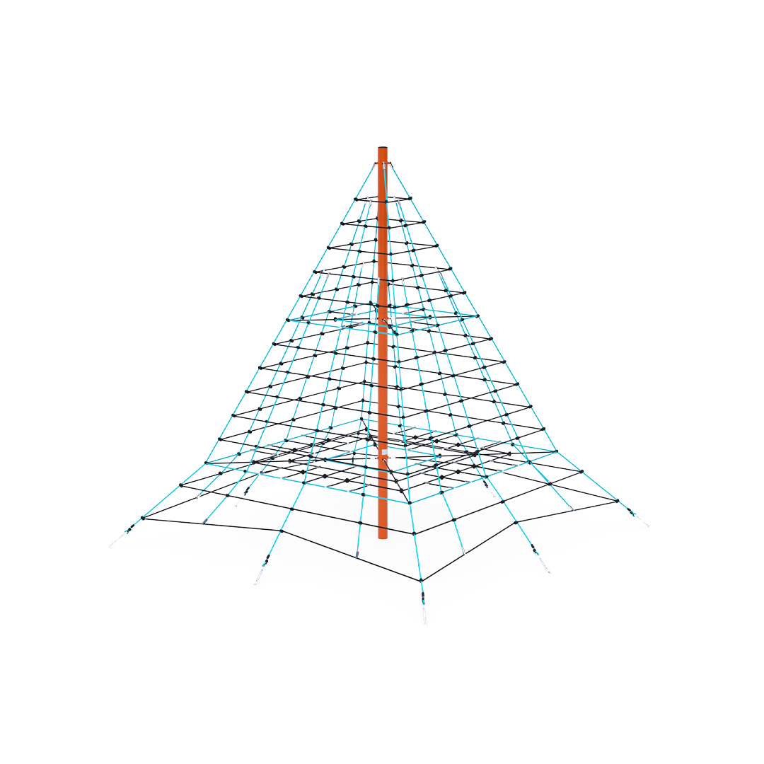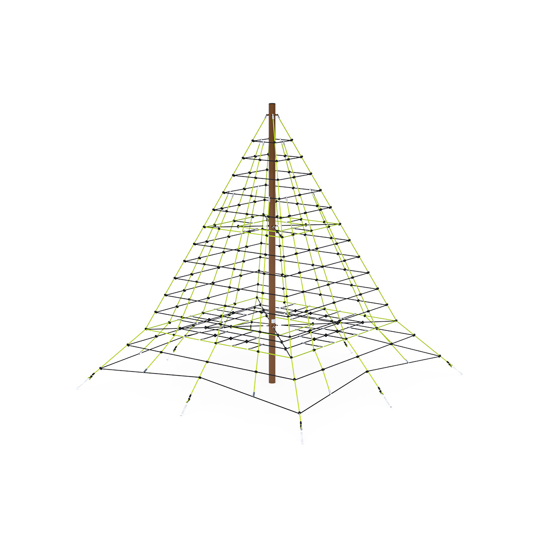 The four and a half meter rope pyramid is suitable for older children who have the courage to climb to the top. The play element is made from hot-dip galvanized steel with a high-quality surface finish. The joints are stainless steel and covered with plastic caps to enhance safety and prolong the lifespan of the joints. The ropes are made from polyester fibers wound around a core, increasing their strength and resistance to mechanical stress. Polyester itself has many positive properties: it is resistant to microorganisms and weather conditions, dries quickly after rain, retains its color, and is highly durable.A grass surface can be used as the impact area, but we recommend using a grass reinforcement mat.