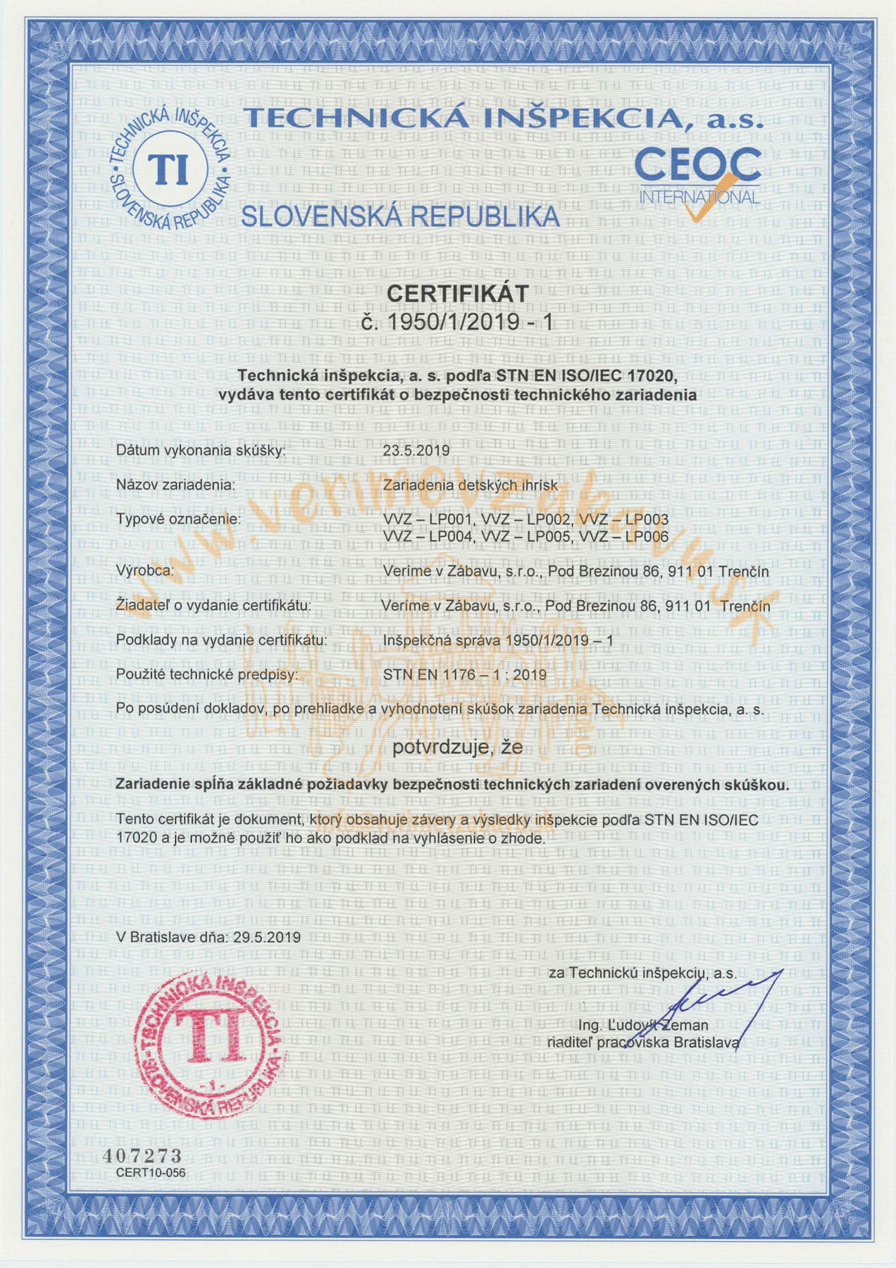 The VVZ-LP003 rope structure is certified according to STN EN 1176.