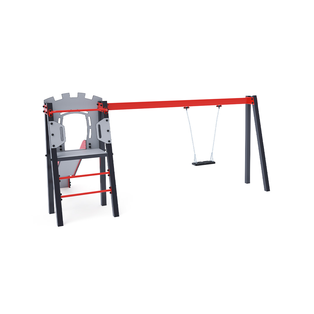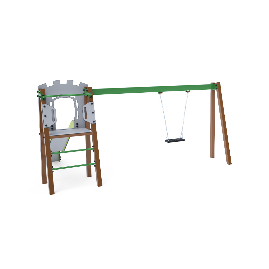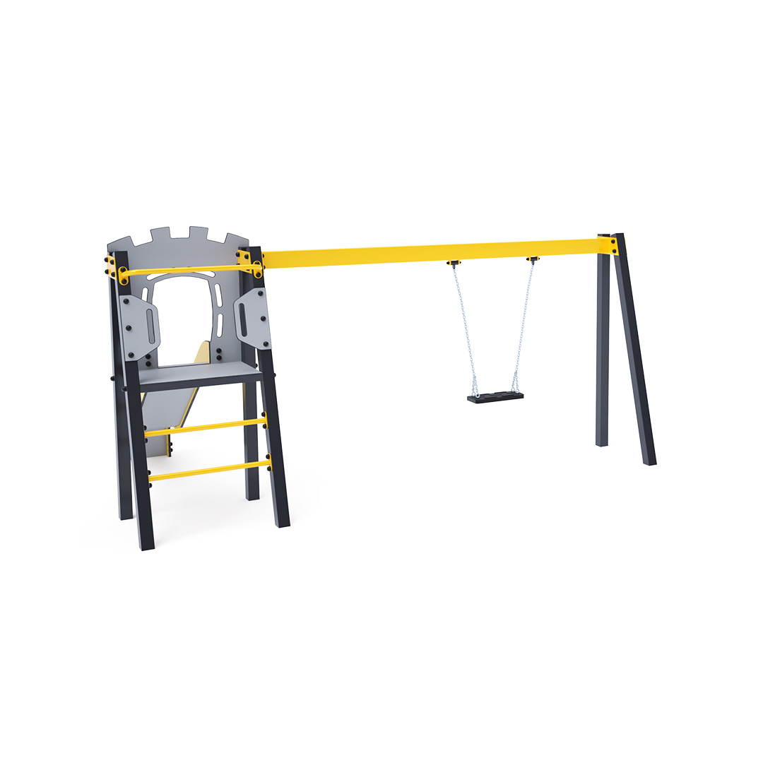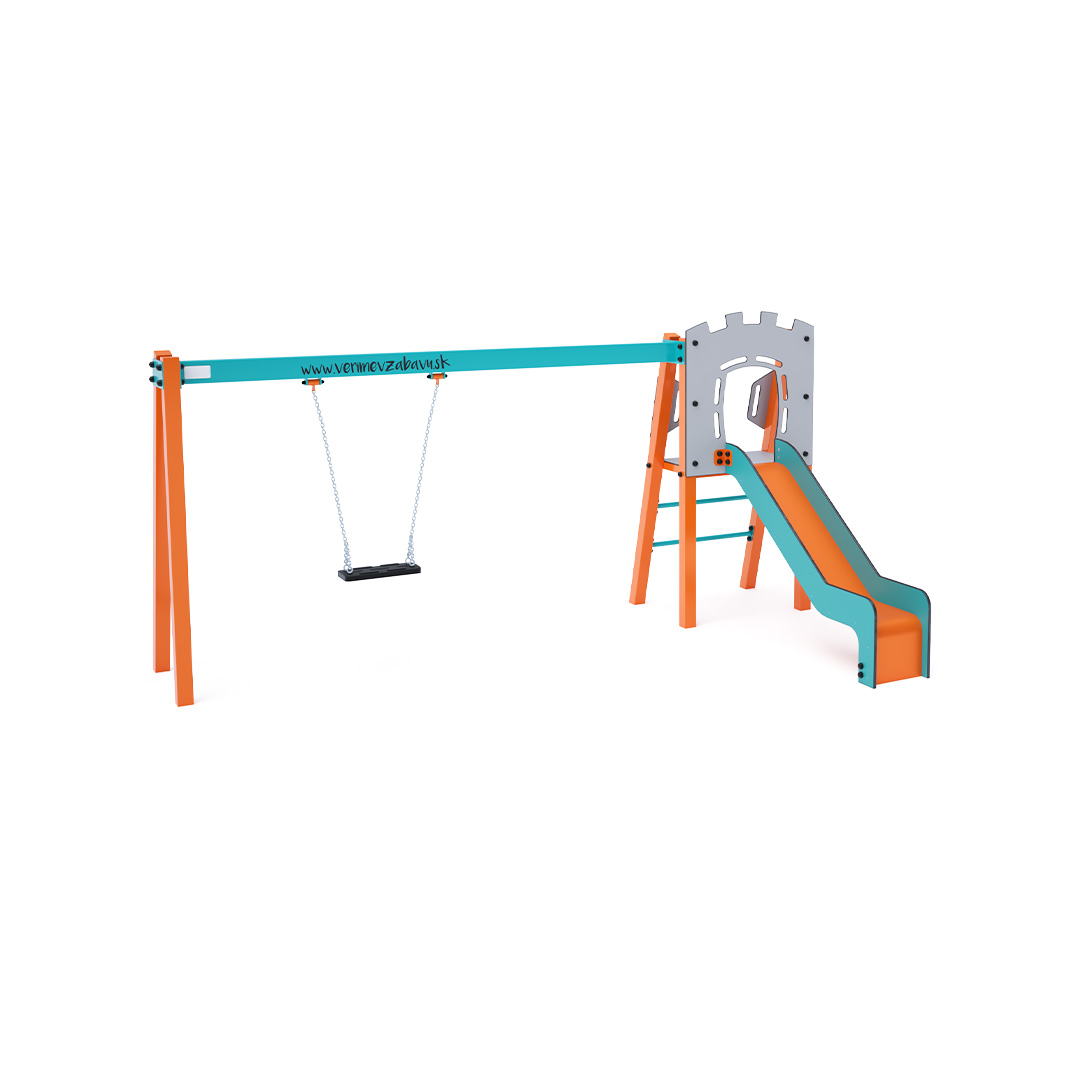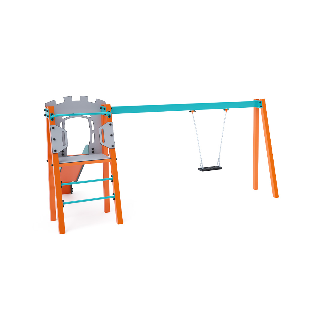 Certified maintenance-free A-shaped tower with ladder and slide, complemented by a hanging swing with a traditional seat. Its turquoise and orange design is inviting from a distance.The steel construction is weather-resistant thanks to hot-dip galvanization and powder-coated finish. The HPL and HDPE plastic used are chemically resistant, UV-stable, colorfast, non-toxic, recyclable, and shatterproof, ensuring no risk of injury from sharp edges or fragments for children. All joints are stainless steel and covered with plastic caps to enhance durability and safety.