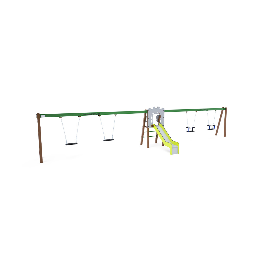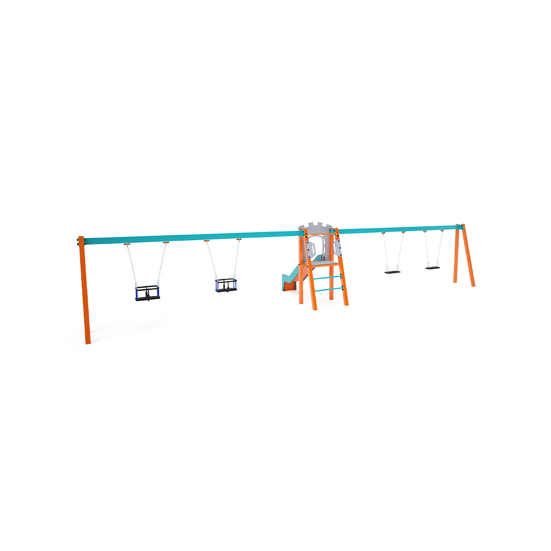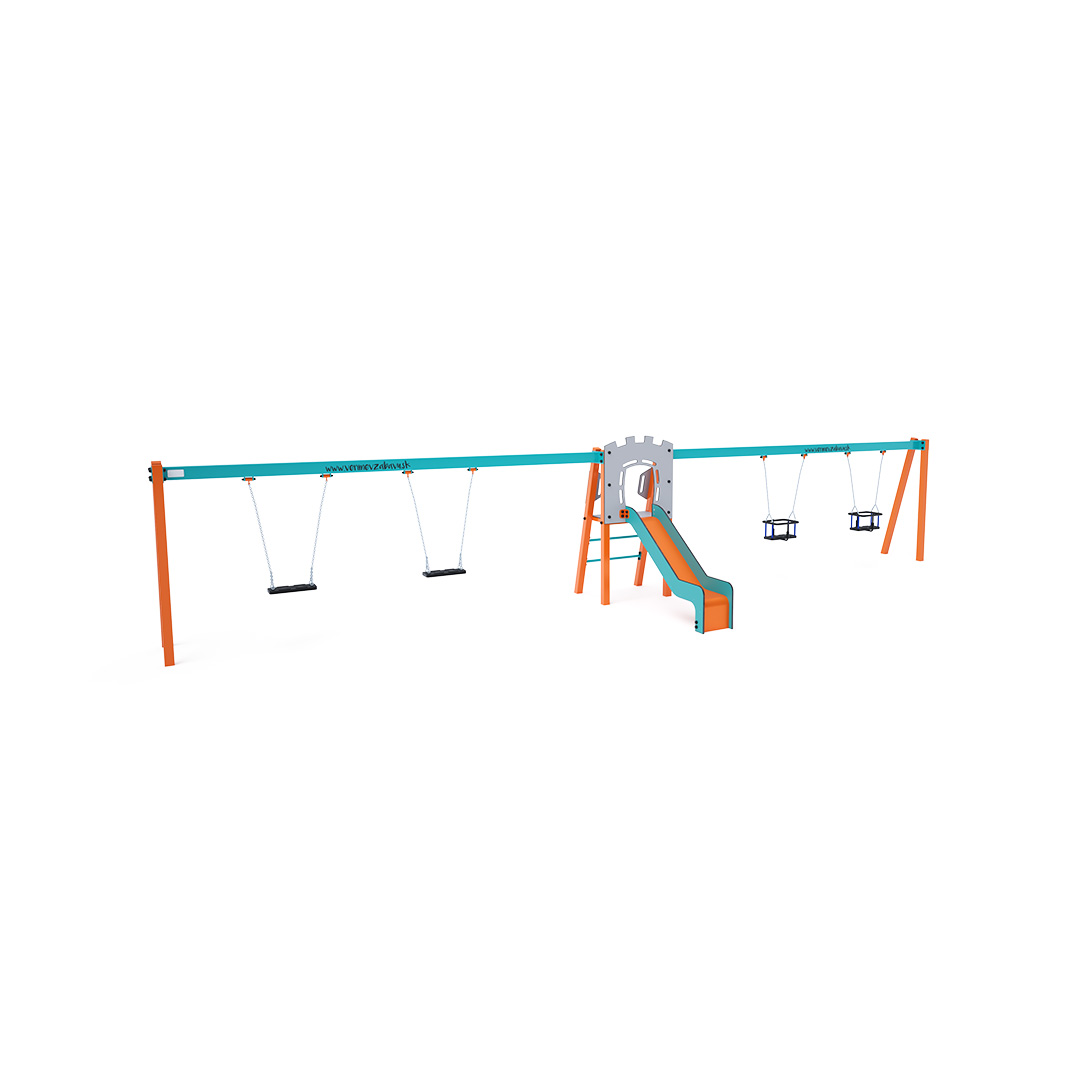 Certified maintenance-free A-shaped tower with ladder and slide, complemented by two hanging swings. On one side, there are two traditional seats, and on the other side, two baby seats. The baby seat includes a barrier with a partition between the child's legs, preventing sliding or falling during swinging while allowing the child to lean comfortably. Its turquoise and orange design is attractive from a distance.The steel construction is weather-resistant due to hot-dip galvanization and powder-coated finish. The HPL (High Pressure Laminate) material and HDPE (High-Density Polyethylene) plastic used are chemically resistant, UV-stable, colorfast, non-toxic, recyclable, and shatterproof, ensuring no risk of injury from sharp edges or fragments for children. All joints are stainless steel and covered with plastic caps to enhance durability and safety.