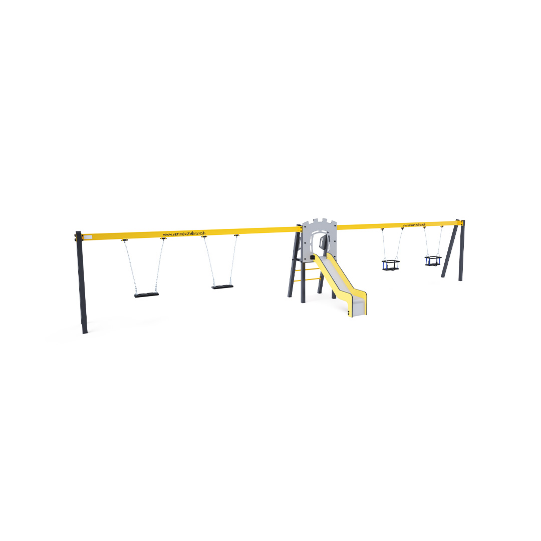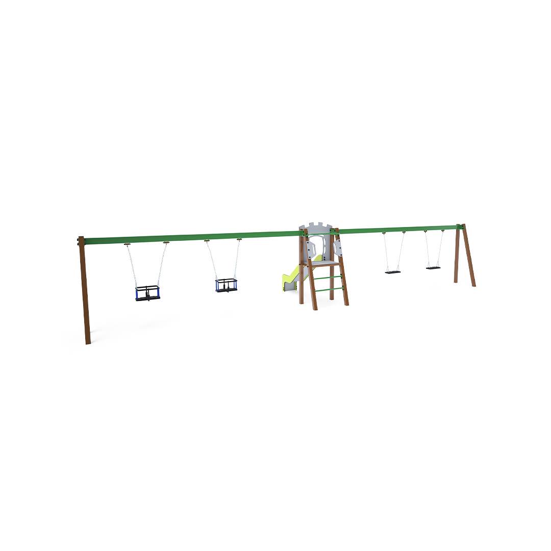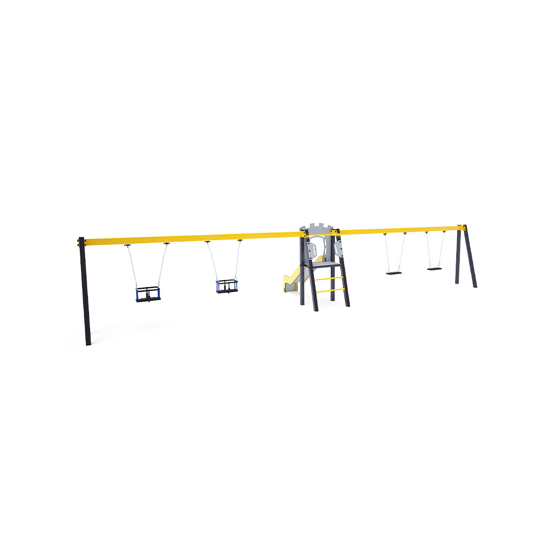 Certified maintenance-free A-shaped tower with ladder and slide, complemented by two hanging swings. On one side, there are two traditional seats, and on the other side, two baby seats. The baby seat includes a barrier with a partition between the child's legs, preventing sliding or falling during swinging while allowing the child to lean comfortably. Its turquoise and orange design is attractive from a distance.The steel construction is weather-resistant due to hot-dip galvanization and powder-coated finish. The HPL (High Pressure Laminate) material and HDPE (High-Density Polyethylene) plastic used are chemically resistant, UV-stable, colorfast, non-toxic, recyclable, and shatterproof, ensuring no risk of injury from sharp edges or fragments for children. All joints are stainless steel and covered with plastic caps to enhance durability and safety.