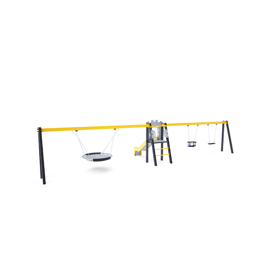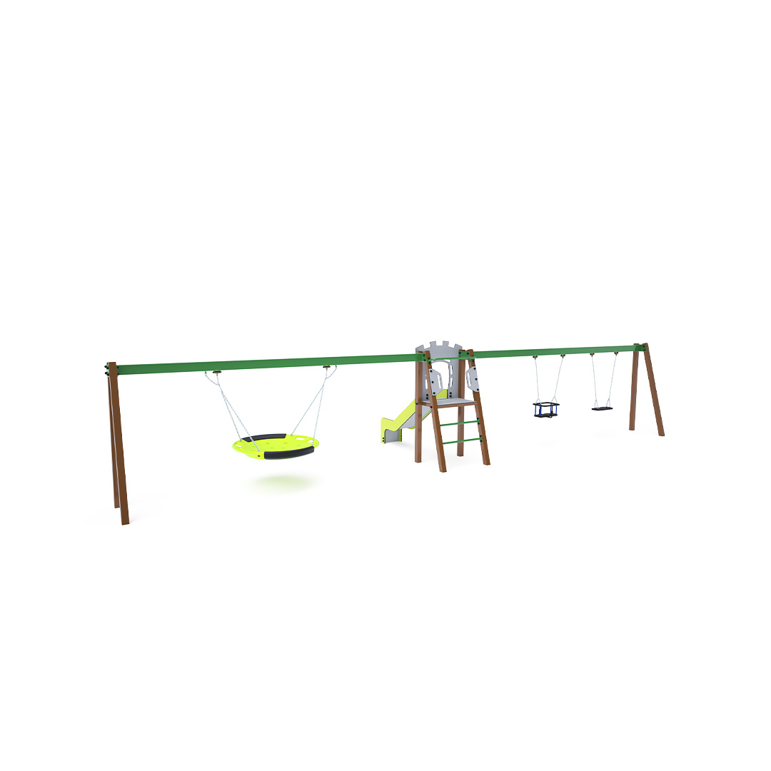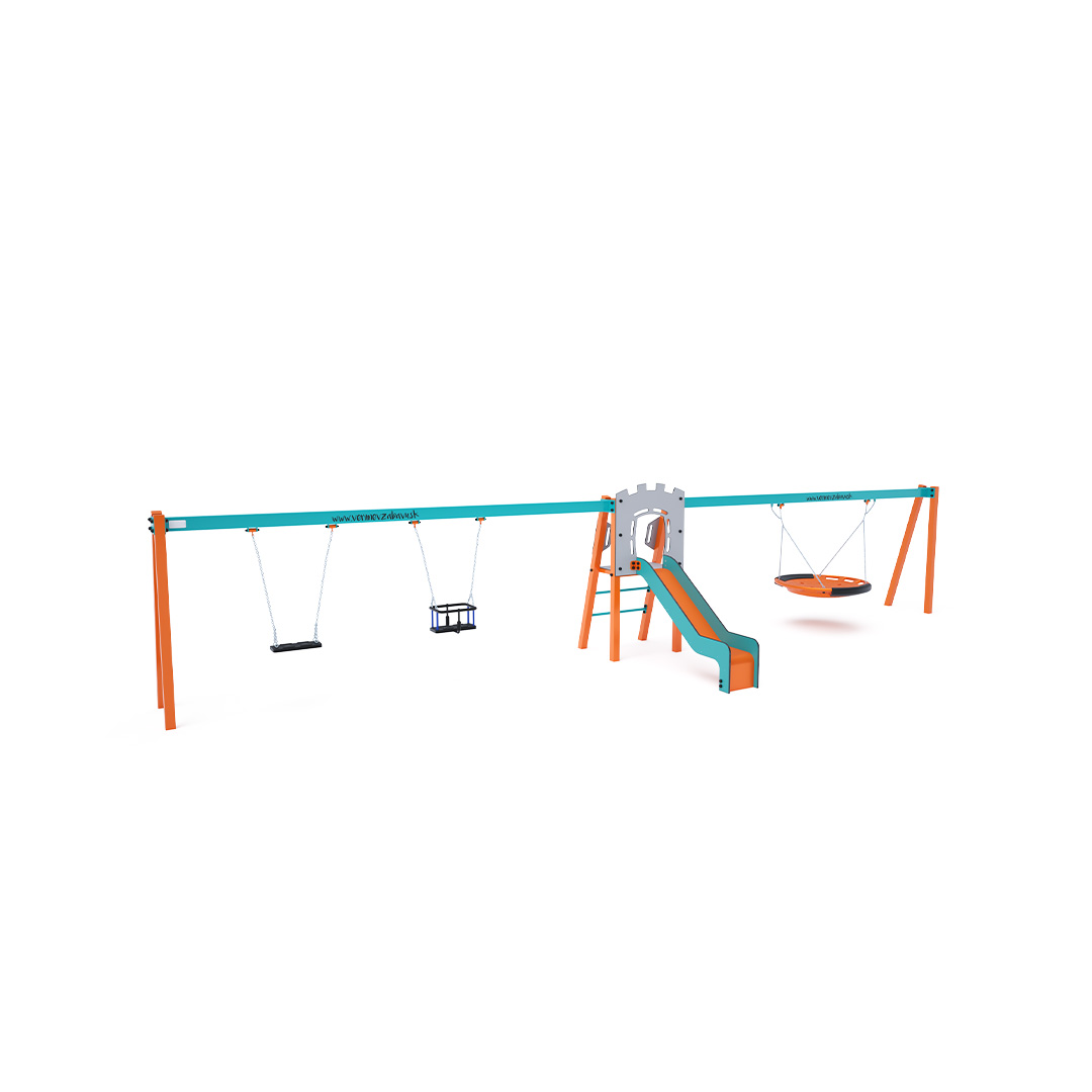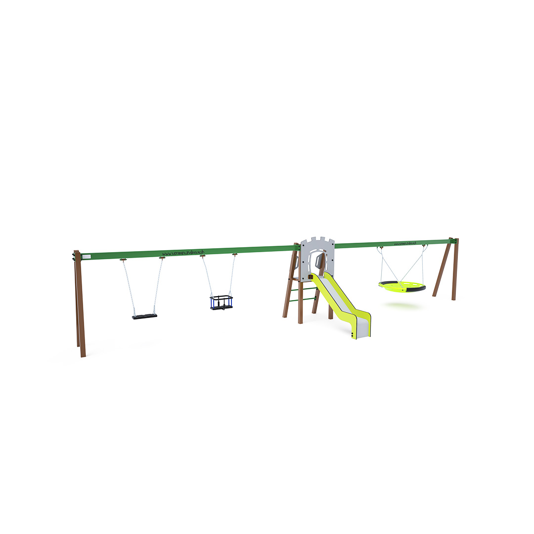 Certified maintenance-free A-shaped tower with ladder and slide, supplemented by two hanging swings. On one side, there are traditional and baby seats; on the other side, there is a swinging nest. The baby seat includes a barrier with a partition between the child's legs, preventing sliding or falling. The nest swing is suitable for swinging small children lying down or for multiple children at once, equipped with a safety suspension and securing chain.The steel construction is weather-resistant due to hot-dip galvanization and powder-coated finish. The HPL material and HDPE plastic used are chemically resistant, UV-stable, colorfast, non-toxic, recyclable, and shatterproof, ensuring no risk of injury from sharp edges or fragments for children.