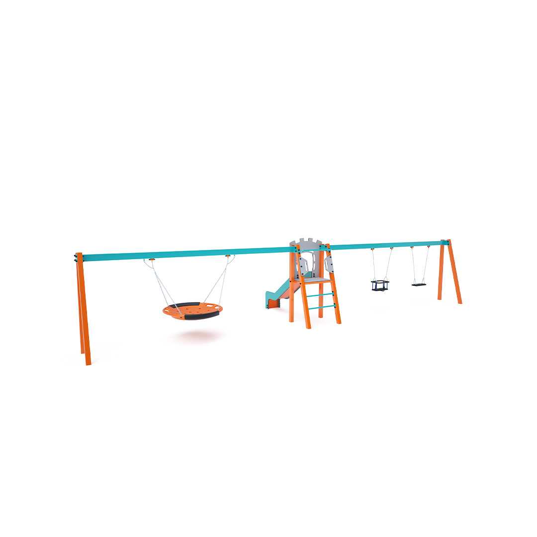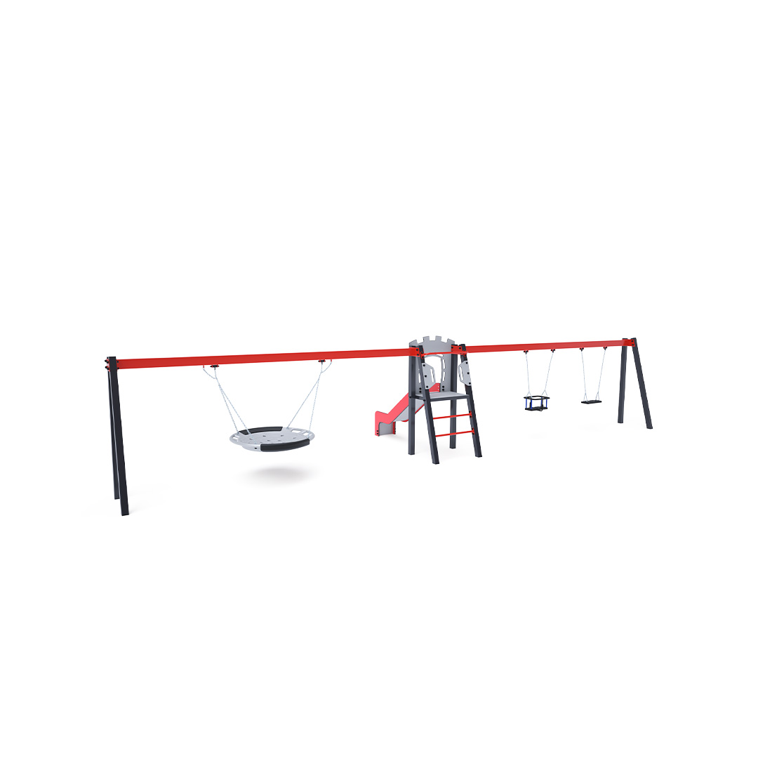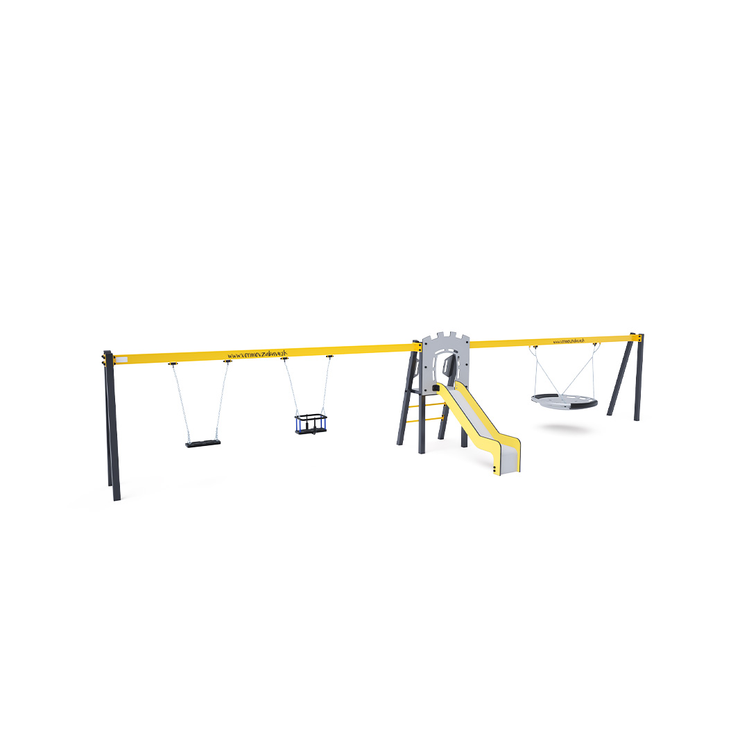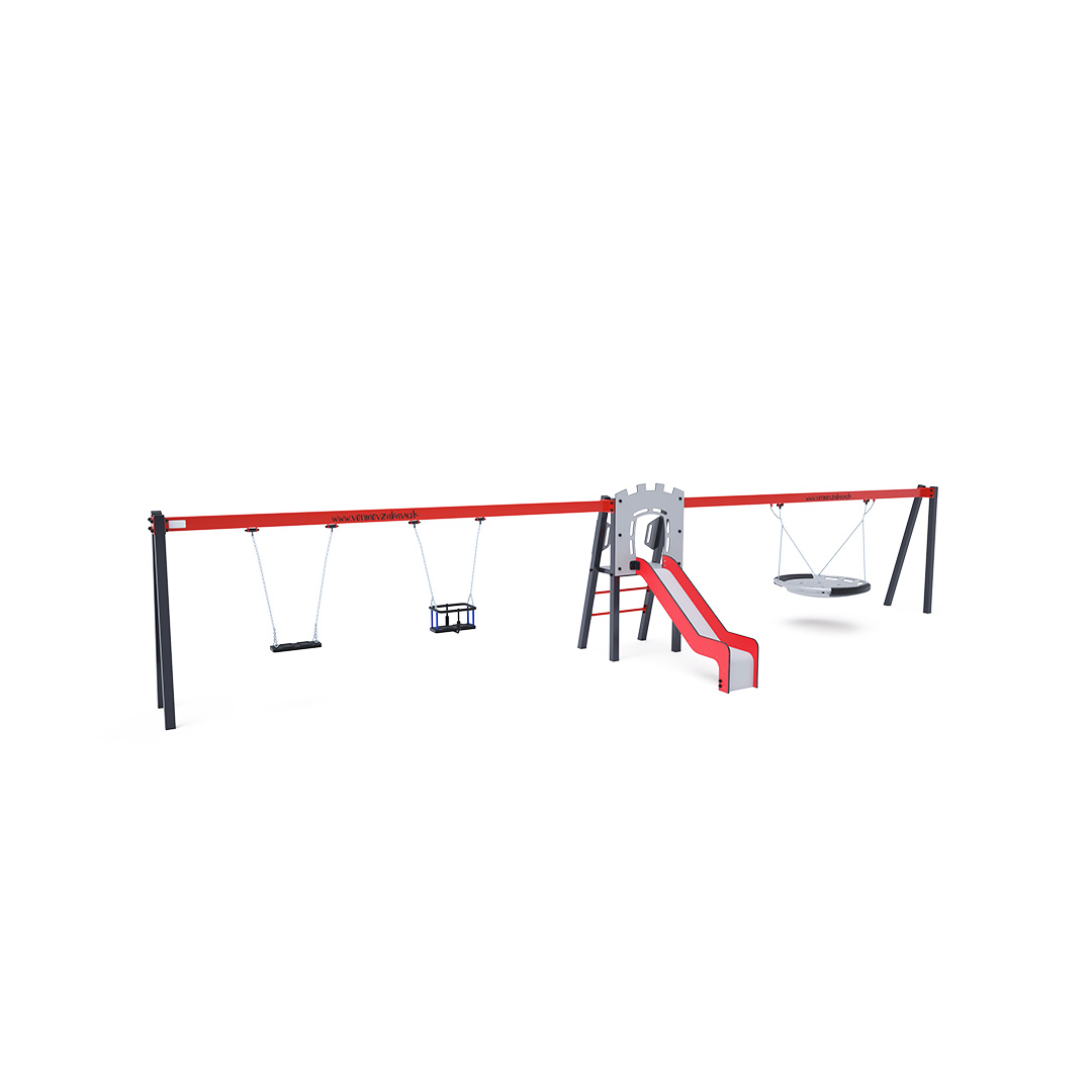 Certified maintenance-free A-shaped tower with ladder and slide, supplemented by two hanging swings. On one side, there are traditional and baby seats; on the other side, there is a swinging nest. The baby seat includes a barrier with a partition between the child's legs, preventing sliding or falling. The nest swing is suitable for swinging small children lying down or for multiple children at once, equipped with a safety suspension and securing chain.The steel construction is weather-resistant due to hot-dip galvanization and powder-coated finish. The HPL material and HDPE plastic used are chemically resistant, UV-stable, colorfast, non-toxic, recyclable, and shatterproof, ensuring no risk of injury from sharp edges or fragments for children.