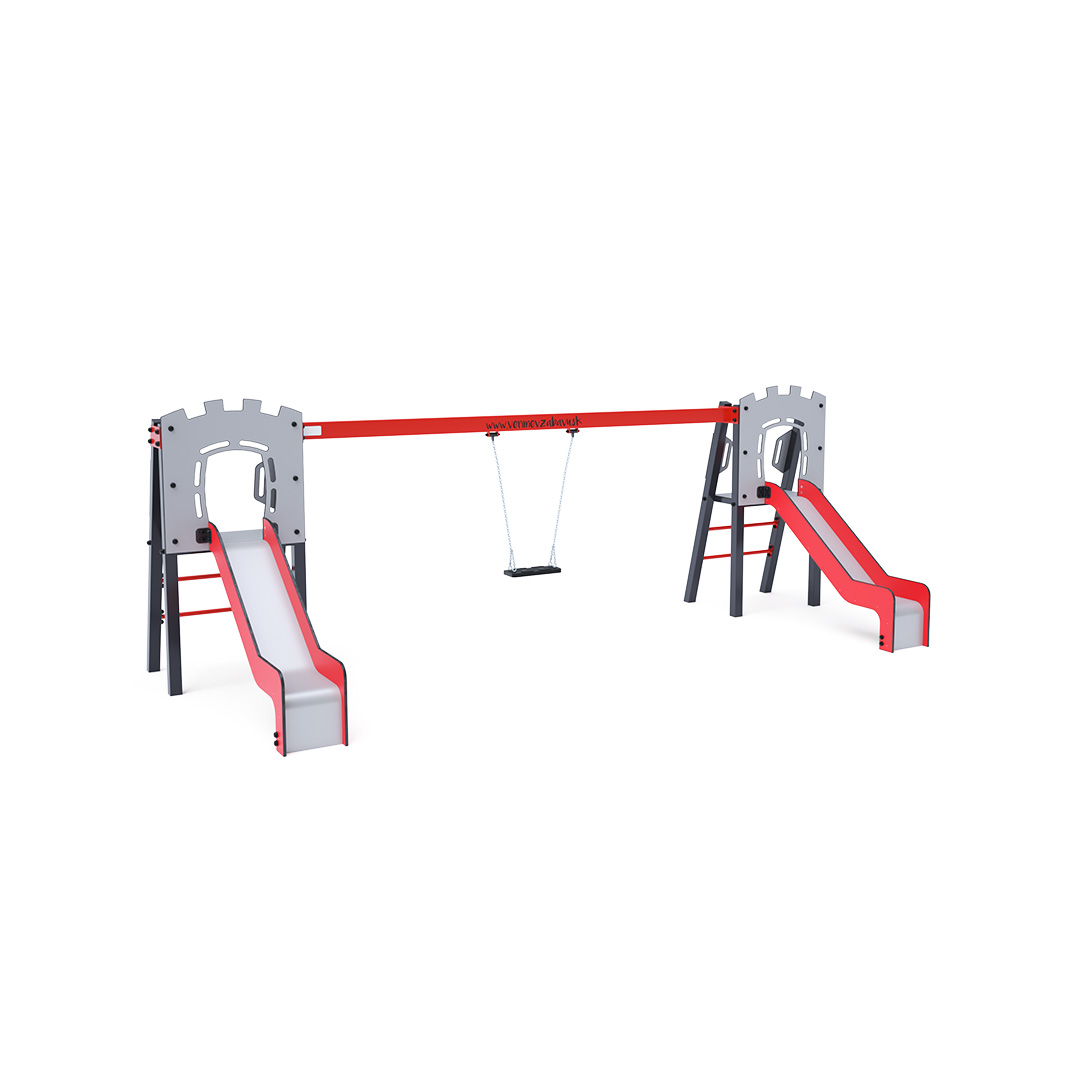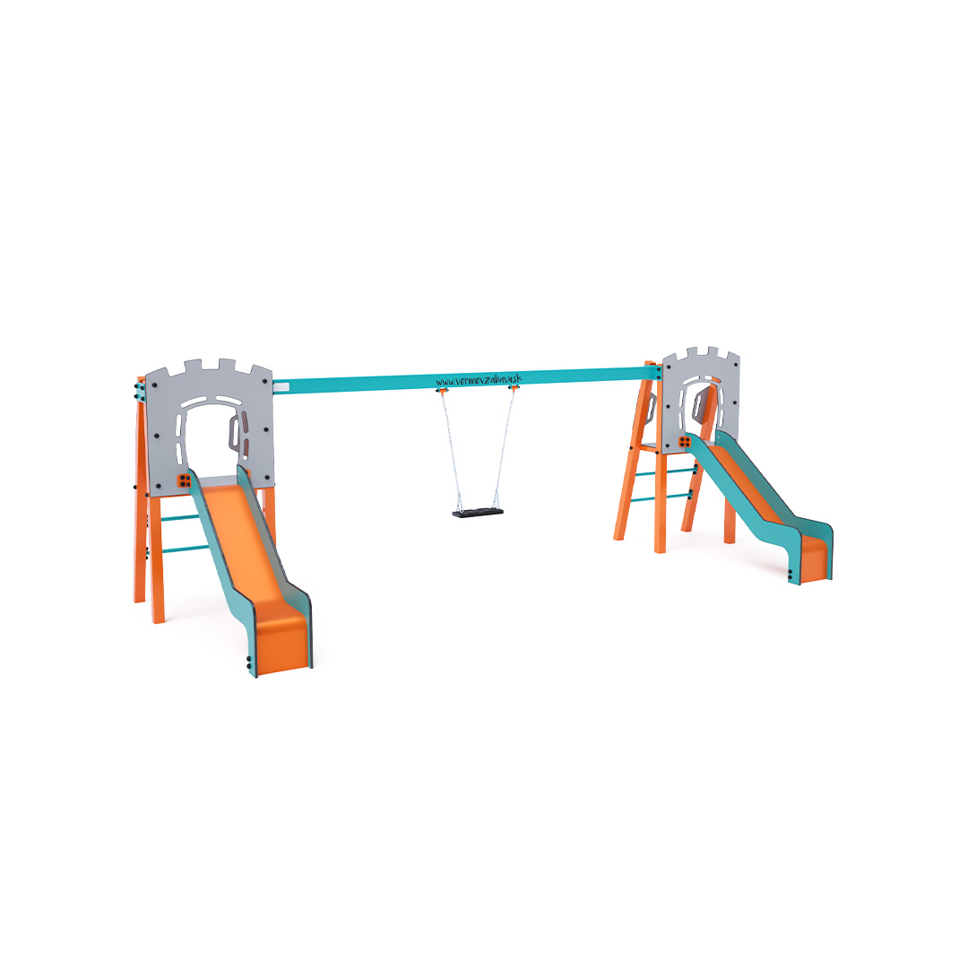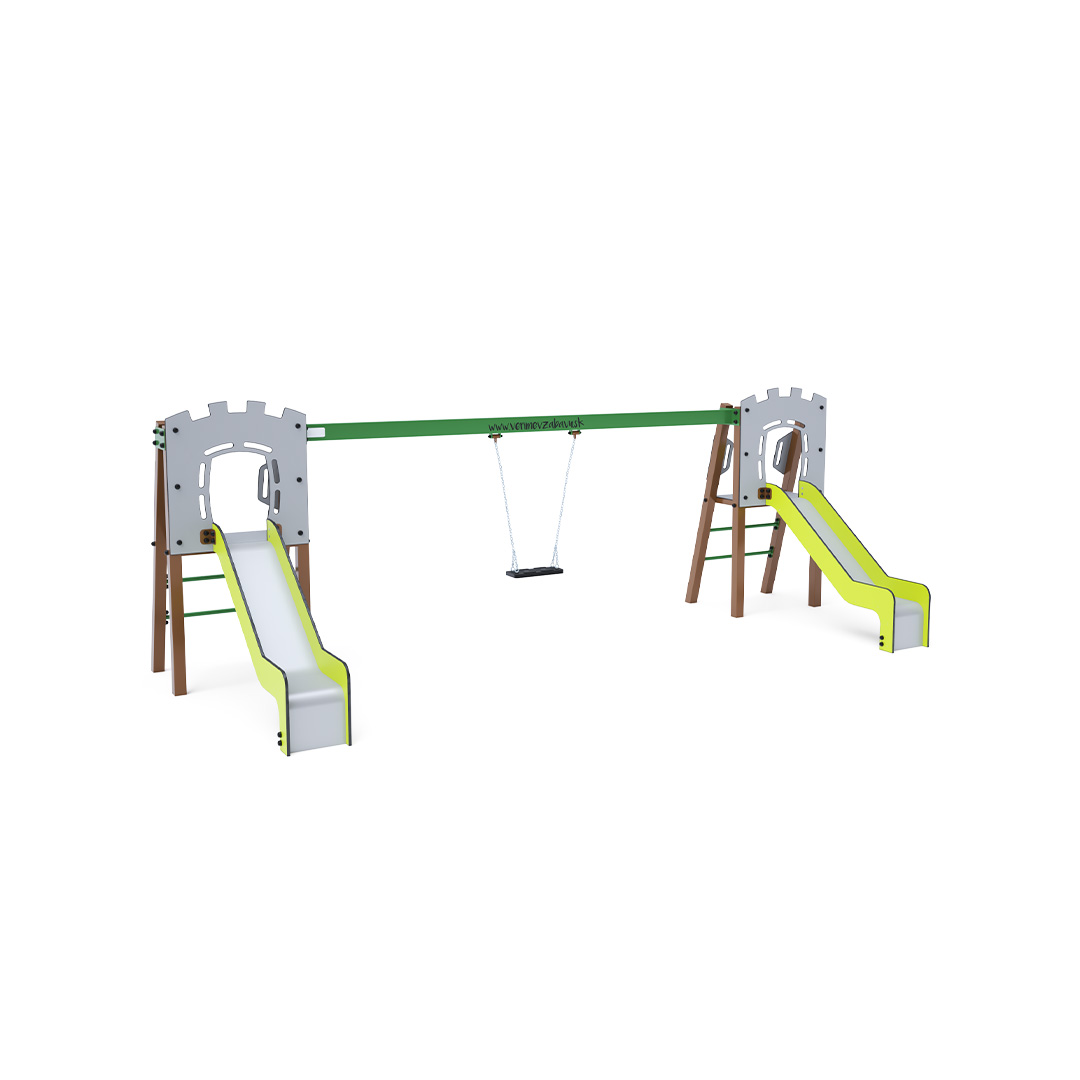 Two certified maintenance-free A-shaped towers with ladder and slide, complemented by a hanging swing. You can choose between a traditional seat or a baby seat. The baby seat includes a barrier with a partition between the child's legs, preventing sliding or falling. It also allows the child to lean comfortably.The steel construction is weather-resistant due to hot-dip galvanization and powder-coated finish. The HPL material and HDPE plastic used are chemically resistant, UV-stable, colorfast, non-toxic, recyclable, and shatterproof, ensuring no risk of injury from sharp edges or fragments for children.