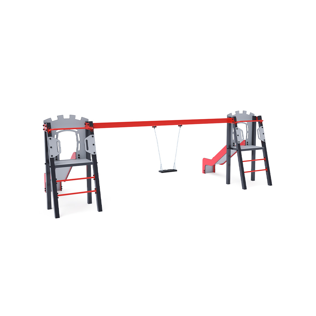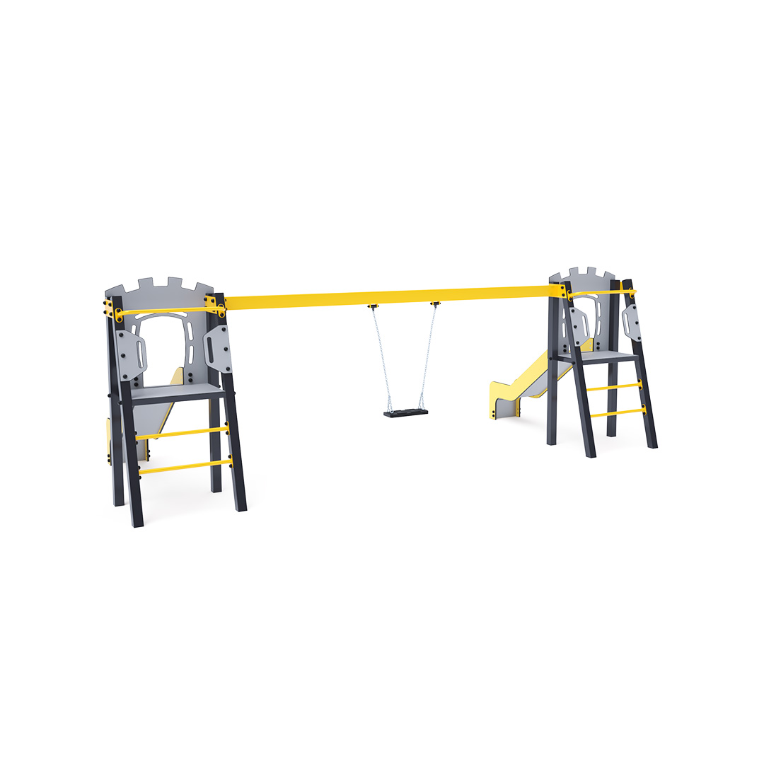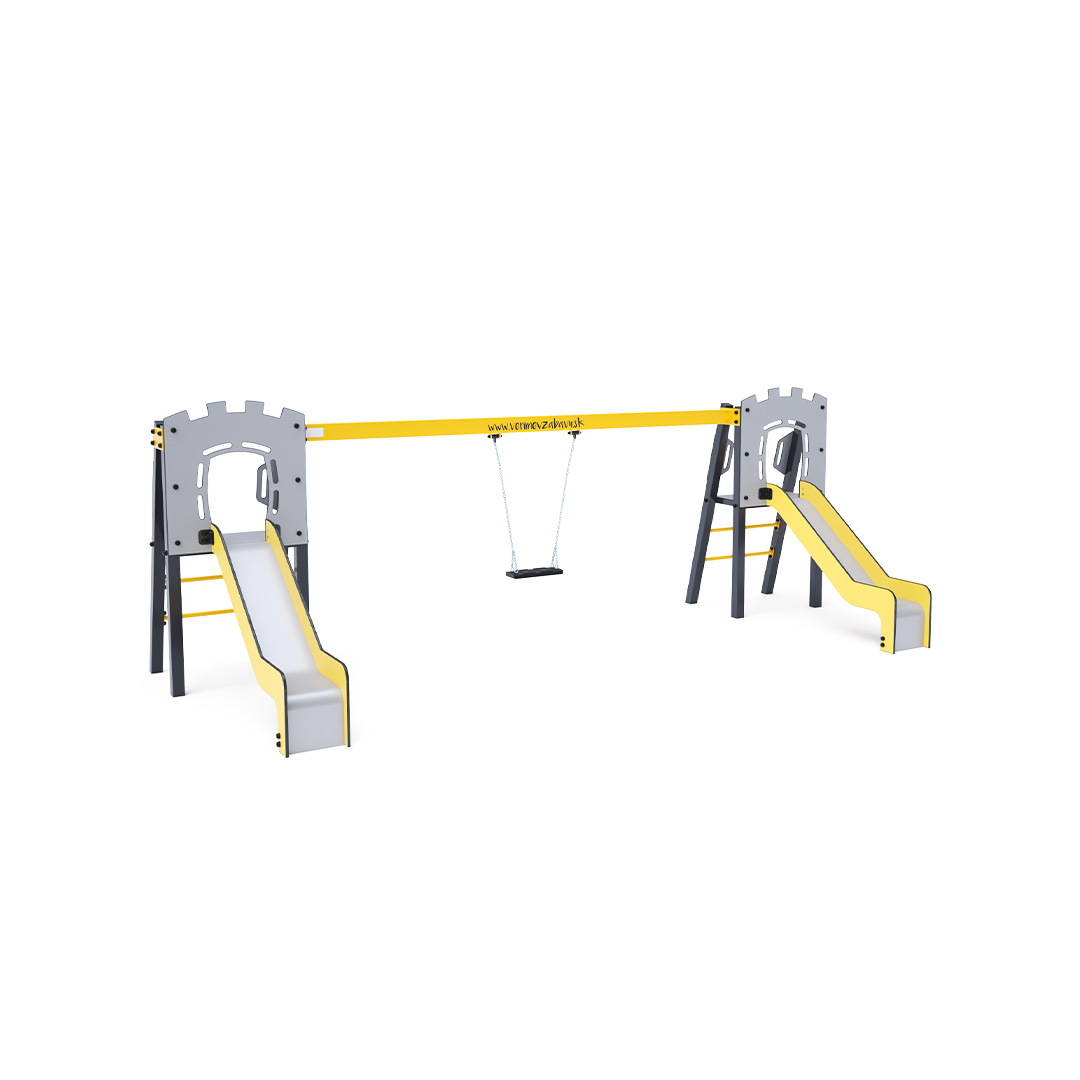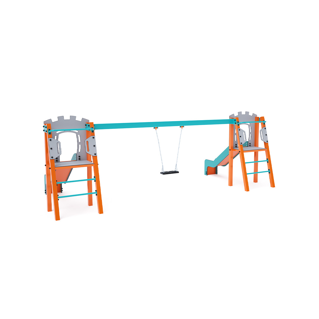 Two certified maintenance-free A-shaped towers with ladder and slide, complemented by a hanging swing. You can choose between a traditional seat or a baby seat. The baby seat includes a barrier with a partition between the child's legs, preventing sliding or falling. It also allows the child to lean comfortably.The steel construction is weather-resistant due to hot-dip galvanization and powder-coated finish. The HPL material and HDPE plastic used are chemically resistant, UV-stable, colorfast, non-toxic, recyclable, and shatterproof, ensuring no risk of injury from sharp edges or fragments for children.