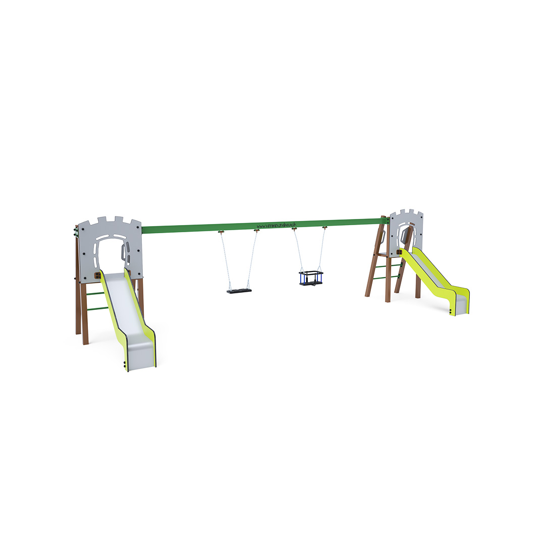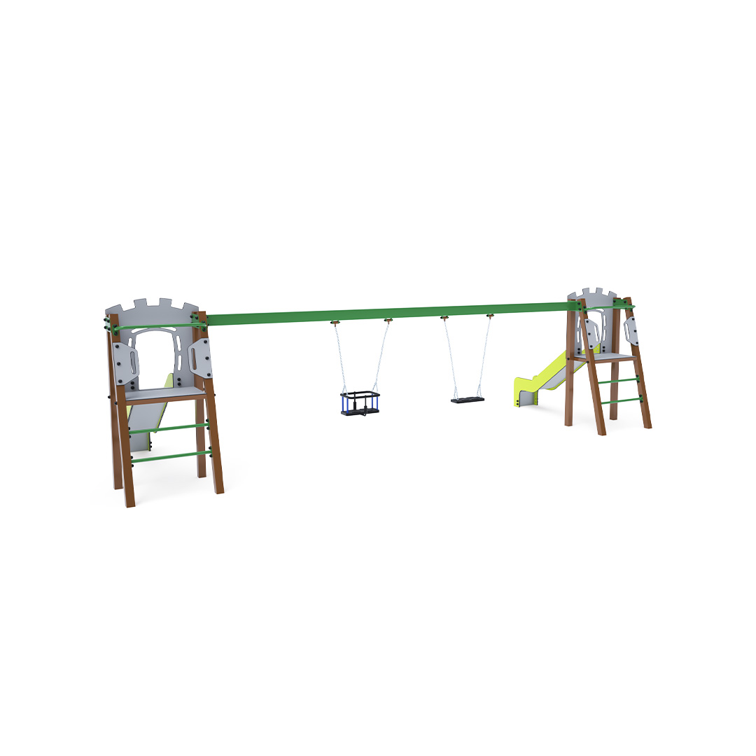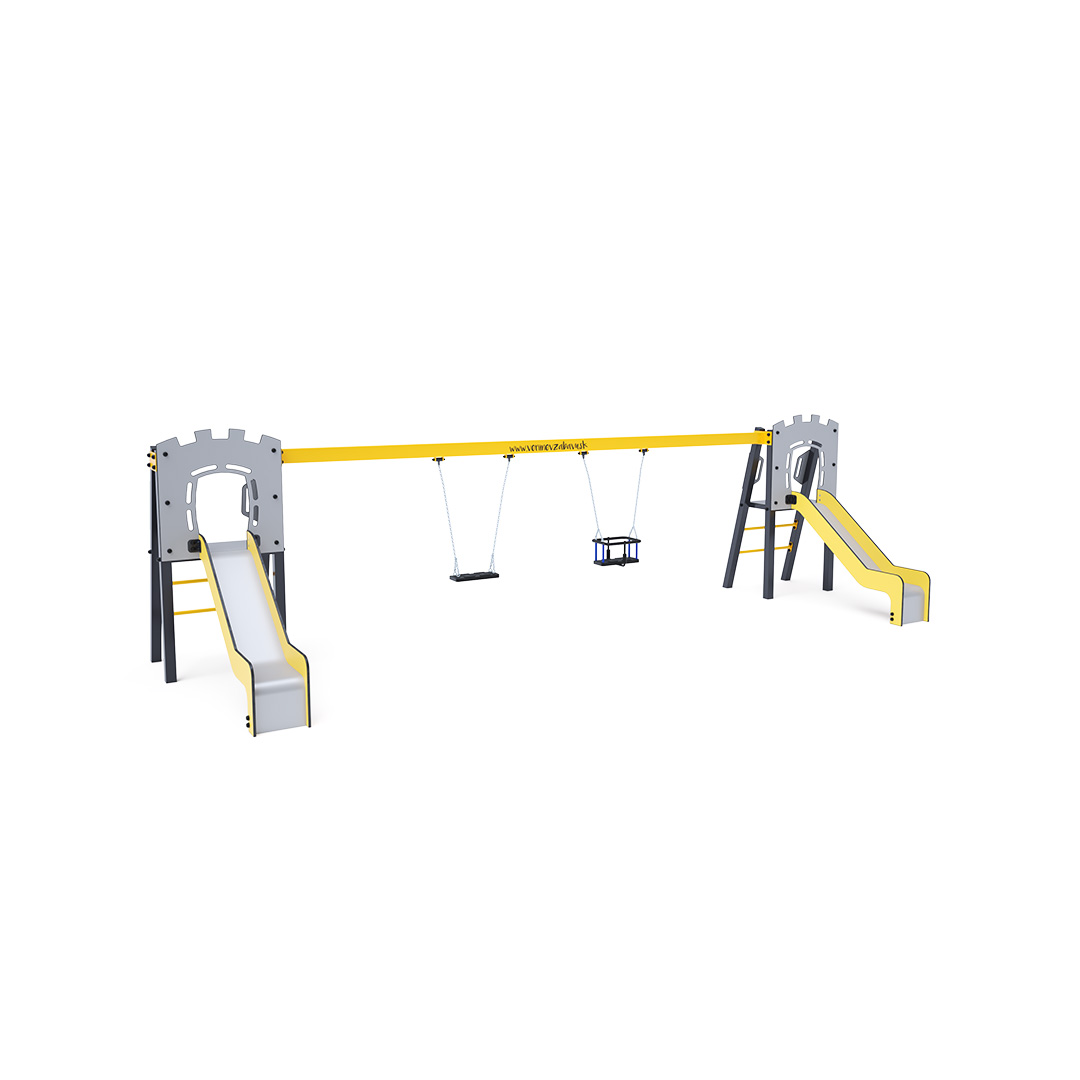Two certified maintenance-free A-shaped towers with ladder access and a slide, complemented by a hanging swing. You can choose either a classic or a baby seat. The baby seat for children includes a partition with a bar between the child's legs, preventing slipping or falling. At the same time, the child can lean back. The steel construction is weather-resistant due to hot-dip galvanizing and durable powder coating. The HPL material and HDPE plastic used are chemically resistant, UV-resistant - colorfast, non-toxic, recyclable, and unbreakable. There is no risk of injury to children from sharp edges or fragments.