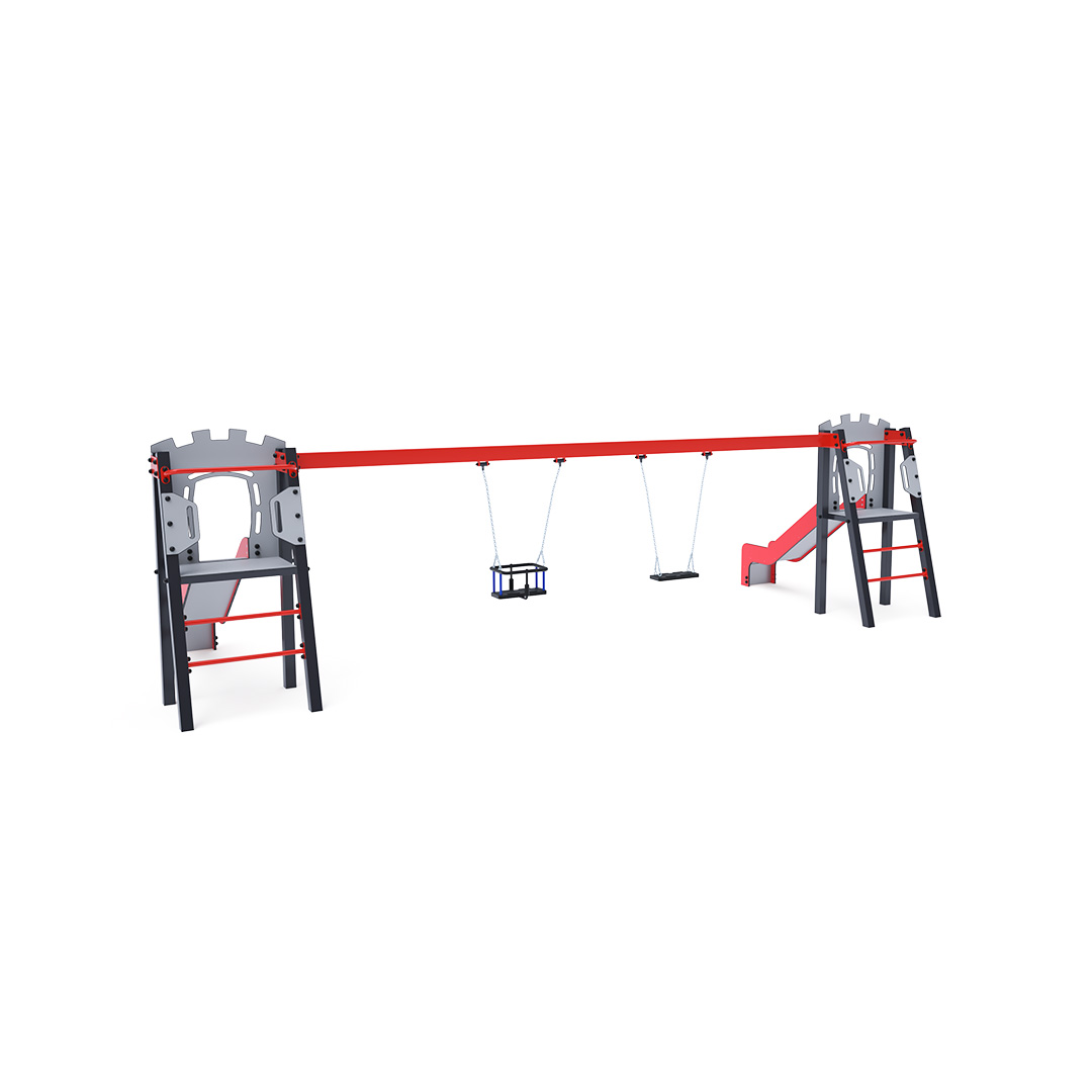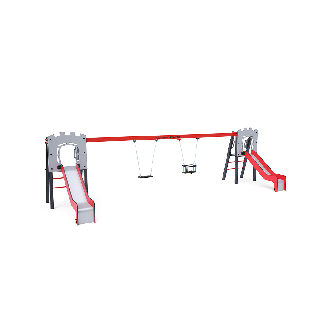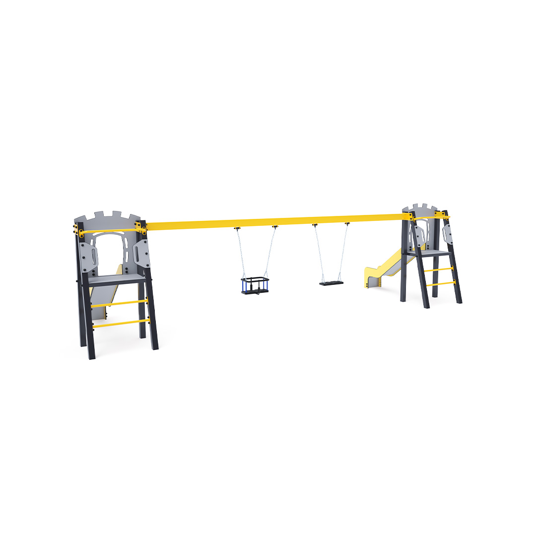 Two certified maintenance-free A-shaped towers with ladder access and a slide, complemented by a hanging swing. You can choose either a classic or a baby seat. The baby seat for children includes a partition with a bar between the child's legs, preventing slipping or falling. At the same time, the child can lean back. The steel construction is weather-resistant due to hot-dip galvanizing and durable powder coating. The HPL material and HDPE plastic used are chemically resistant, UV-resistant - colorfast, non-toxic, recyclable, and unbreakable. There is no risk of injury to children from sharp edges or fragments.