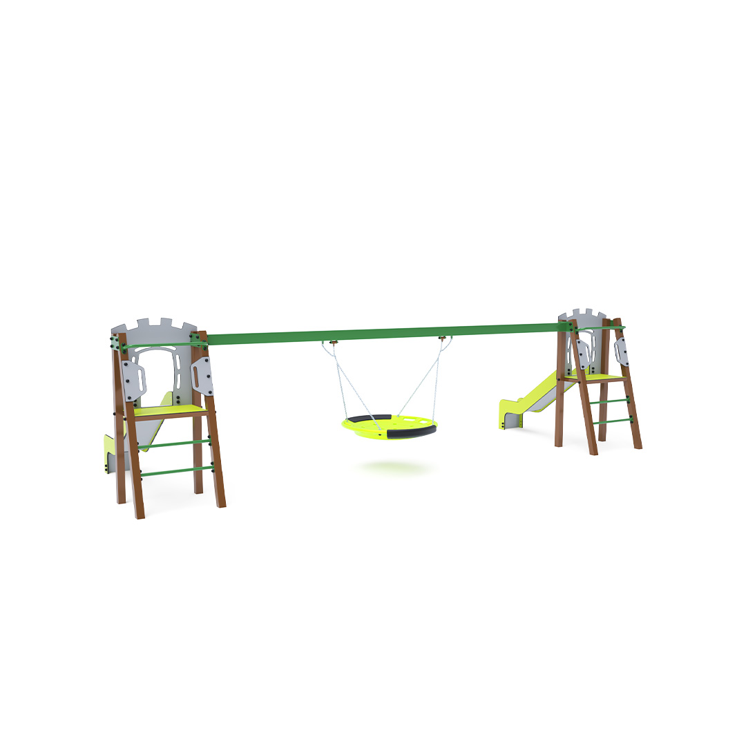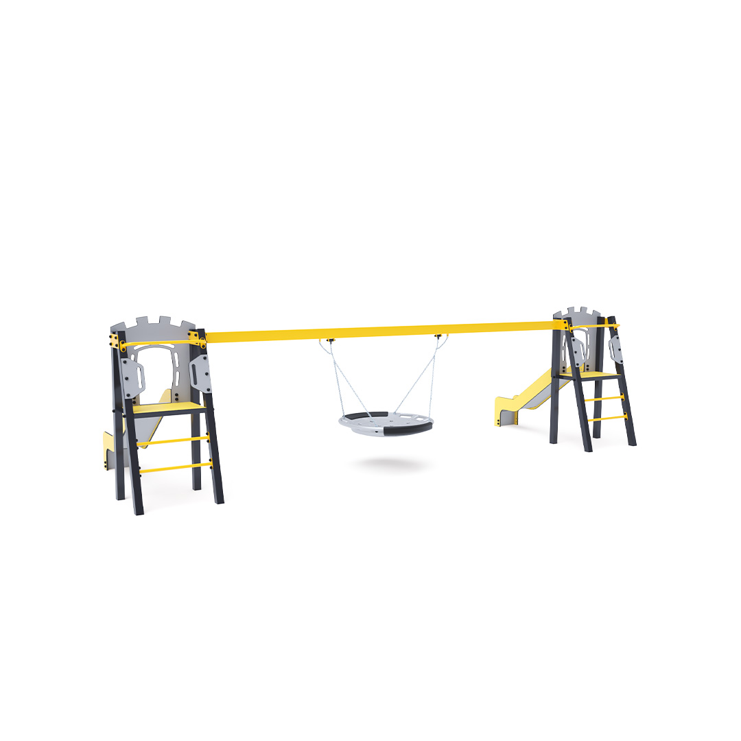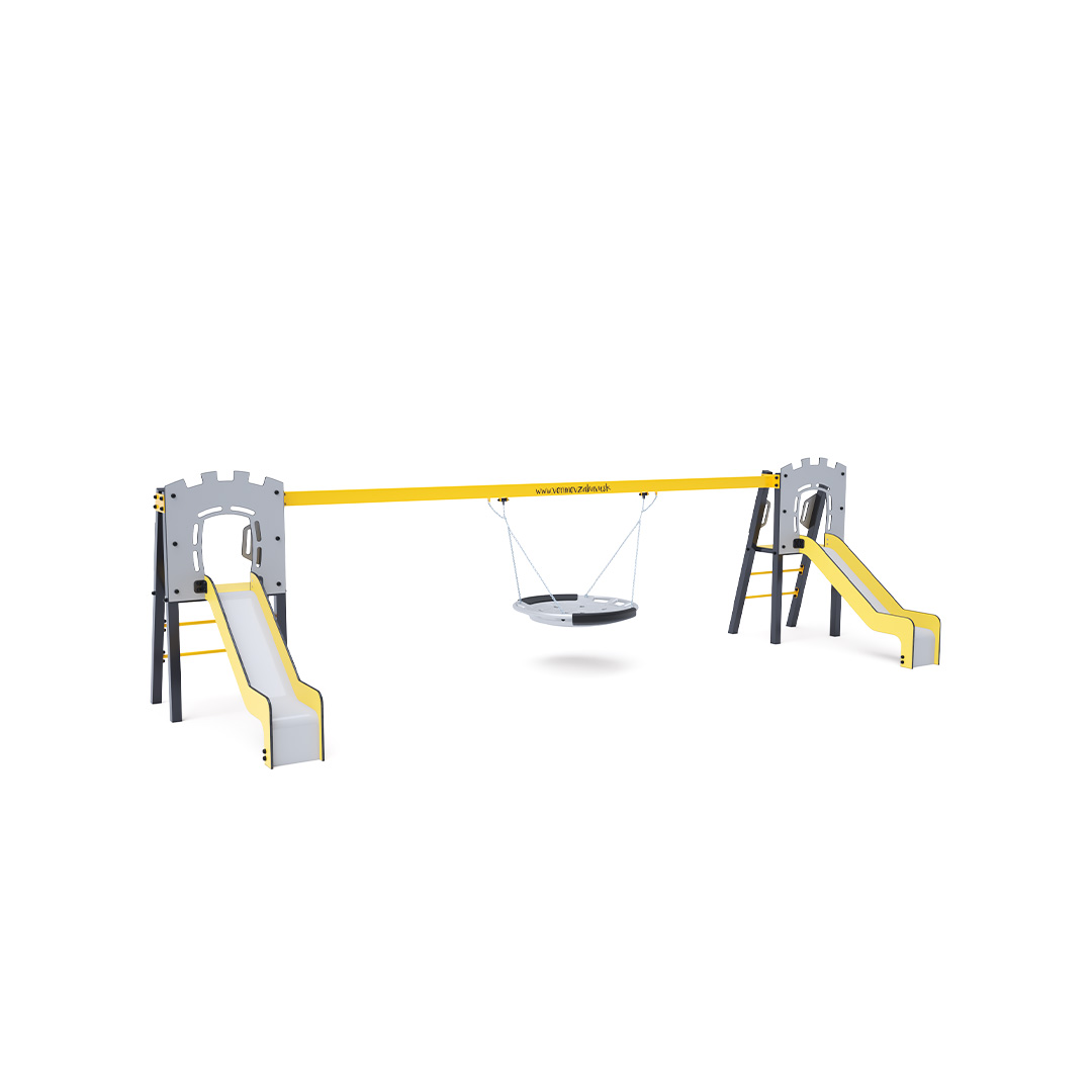 Two certified maintenance-free A-shaped towers with ladder access and a slide, complemented by a swing with a nest swing. The nest swing is suitable for rocking small children while lying down or for several children at once. The nest features a safety suspension with a locking chain. The steel construction is weather-resistant due to hot-dip galvanizing and durable powder coating. The HPL material and HDPE plastic used are chemically resistant, UV-resistant - colorfast, non-toxic, recyclable, and unbreakable. This ensures that there is no risk of injury to children from sharp edges or fragments.