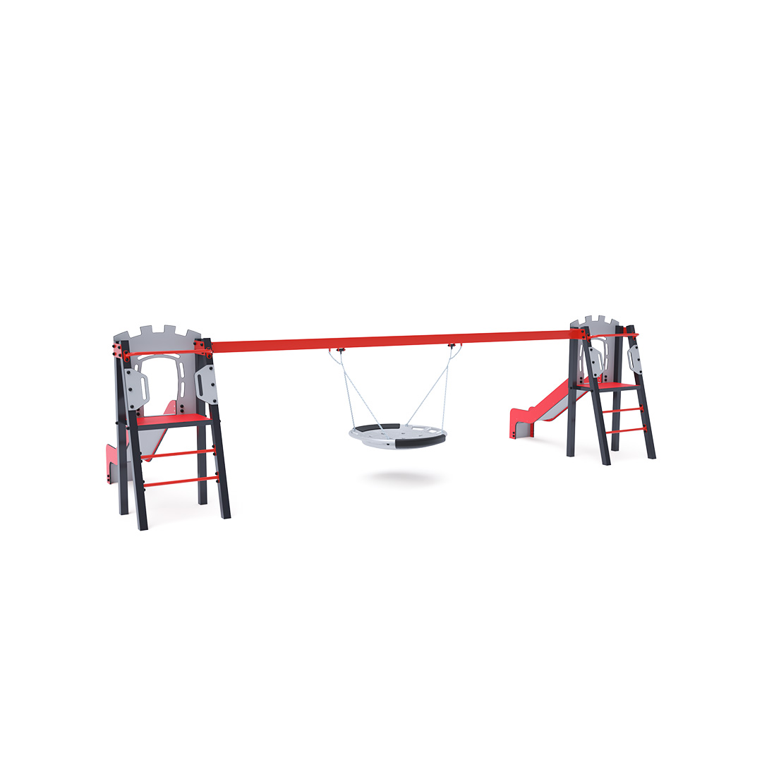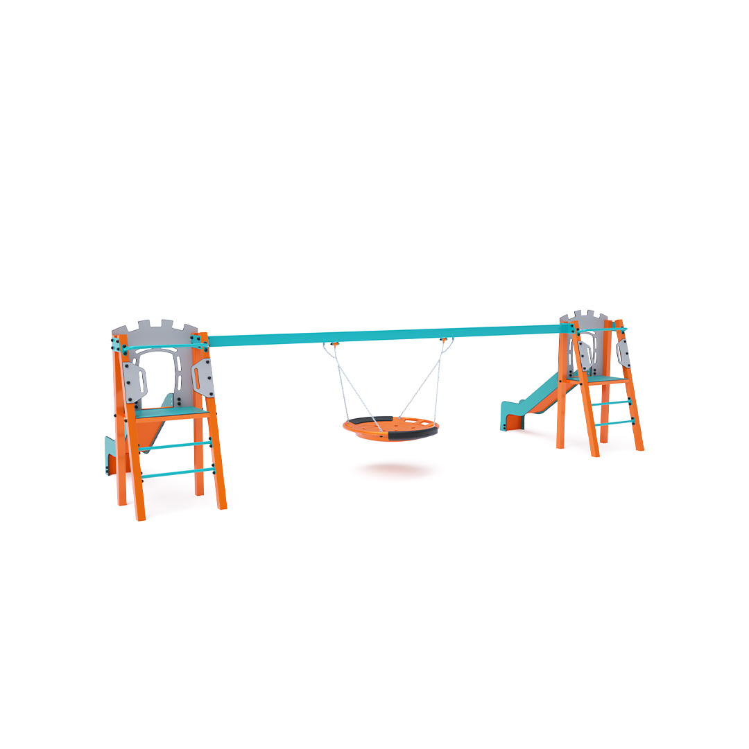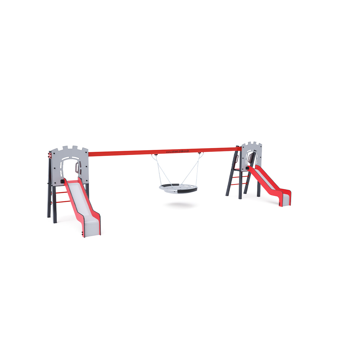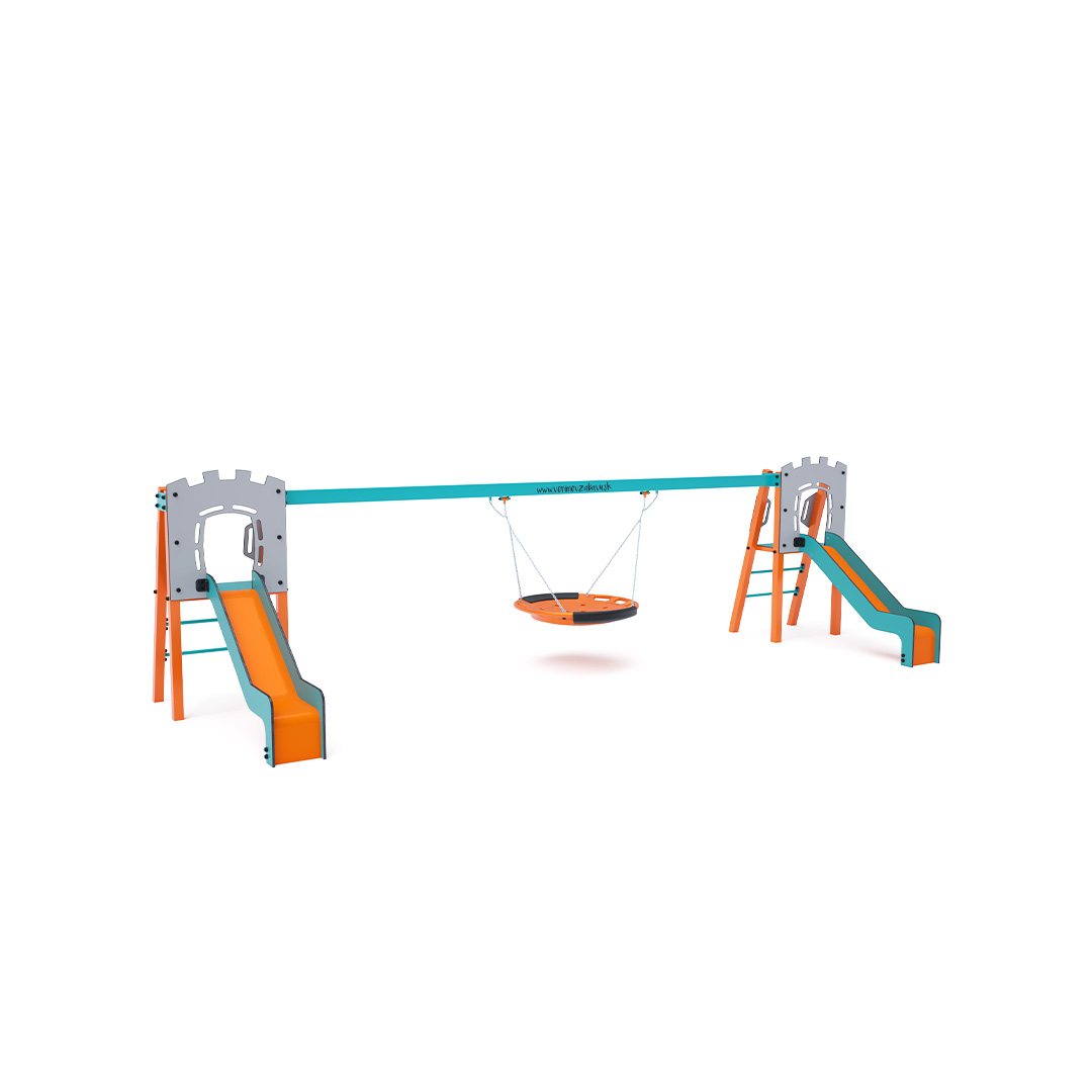 Two certified maintenance-free A-shaped towers with ladder access and a slide, complemented by a swing with a nest swing. The nest swing is suitable for rocking small children while lying down or for several children at once. The nest features a safety suspension with a locking chain. The steel construction is weather-resistant due to hot-dip galvanizing and durable powder coating. The HPL material and HDPE plastic used are chemically resistant, UV-resistant - colorfast, non-toxic, recyclable, and unbreakable. This ensures that there is no risk of injury to children from sharp edges or fragments.