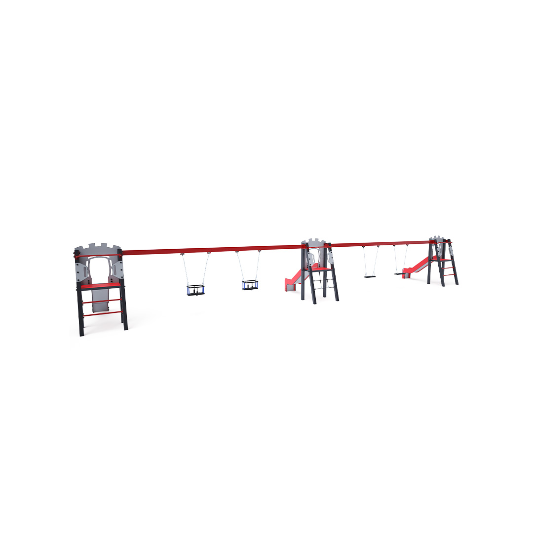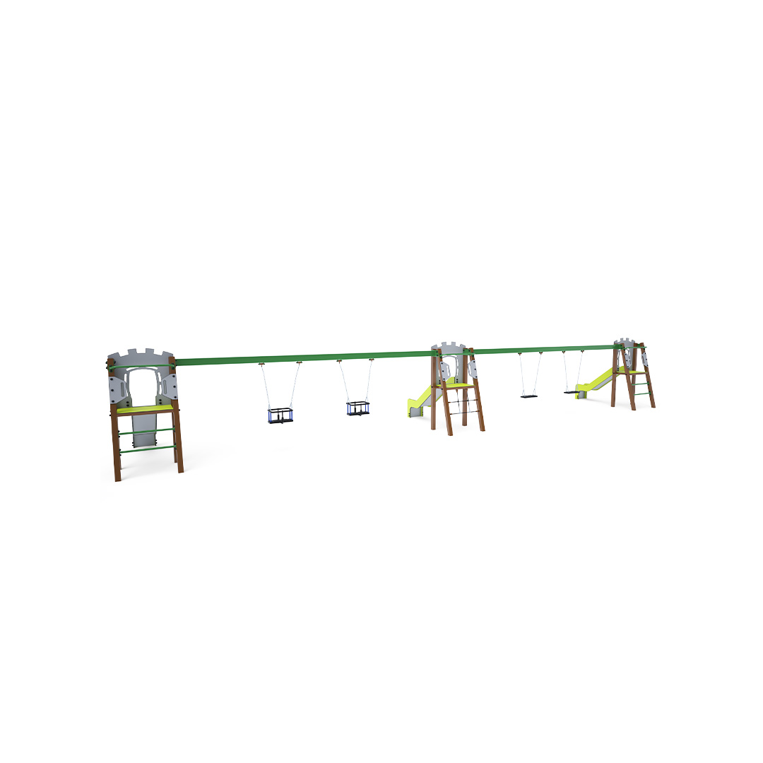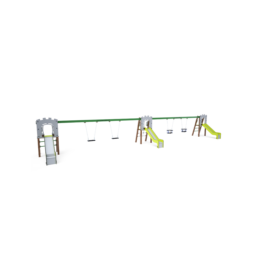 Three certified maintenance-free A-shaped towers. Two with ladder access and slides, and one with a rope net and slide, connected by two double hanging chain swings. One swing has two classic seats, and the other has two baby seats. The baby seat for children includes a partition with a bar between the child's legs, preventing slipping or falling. At the same time, the child can lean back.The steel construction is weather-resistant due to hot-dip galvanizing and durable powder coating. The HPL material and HDPE plastic used are chemically resistant, UV-resistant - colorfast, non-toxic, recyclable, and unbreakable. This ensures there is no risk of injury to children from sharp edges or fragments.