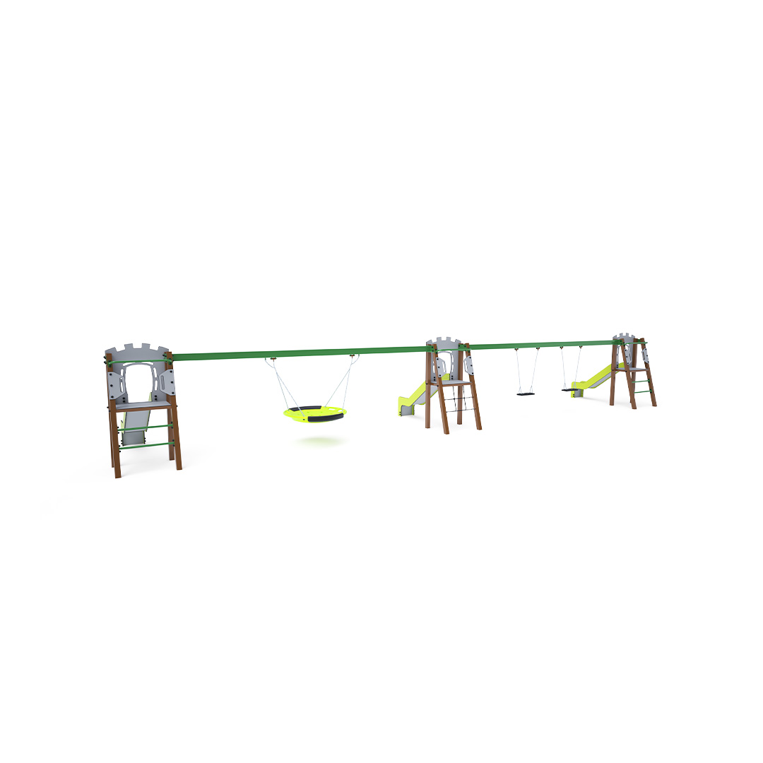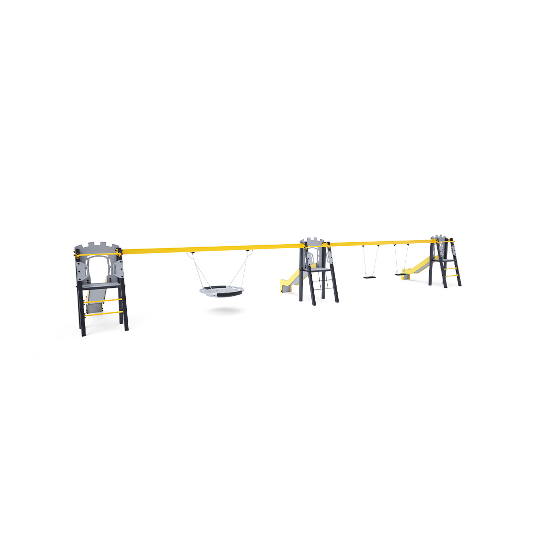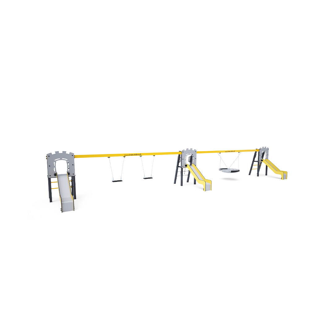 Three certified maintenance-free A-shaped towers. Two with ladder access and slides, and one with a rope net and slide, connected by two hanging swings. One double swing can contain two classic seats, two baby seats, or a combination of both. The second swing is a nest swing. The baby seat for children includes a partition with a bar between the child's legs, preventing slipping or falling. At the same time, the child can lean back. The nest swing is suitable for rocking small children while lying down or for several children at once. The nest features a safety suspension with a locking chain.The steel construction is weather-resistant due to hot-dip galvanizing and durable powder coating. The HPL material and HDPE plastic used are chemically resistant, UV-resistant - colorfast, non-toxic, recyclable, and unbreakable. This ensures there is no risk of injury to children from sharp edges or fragments.