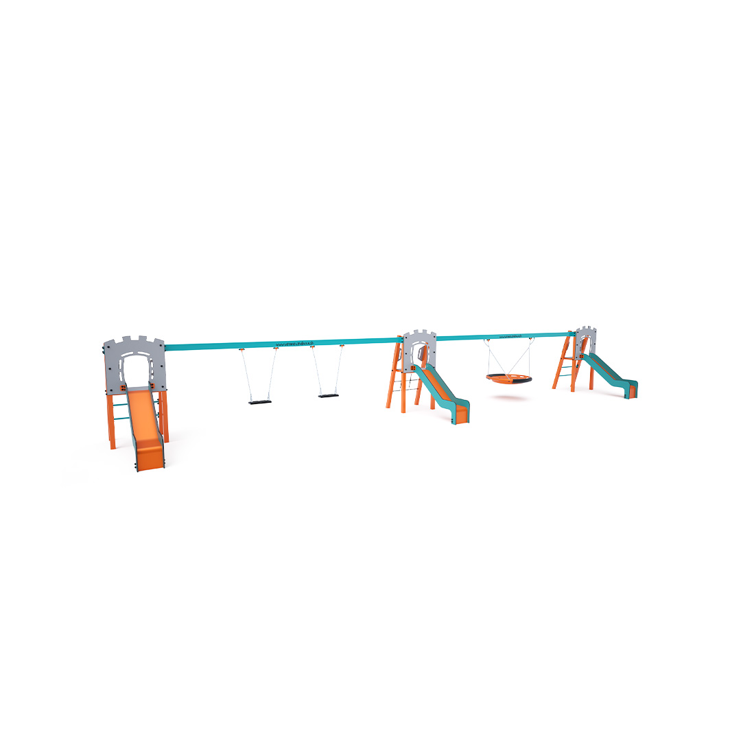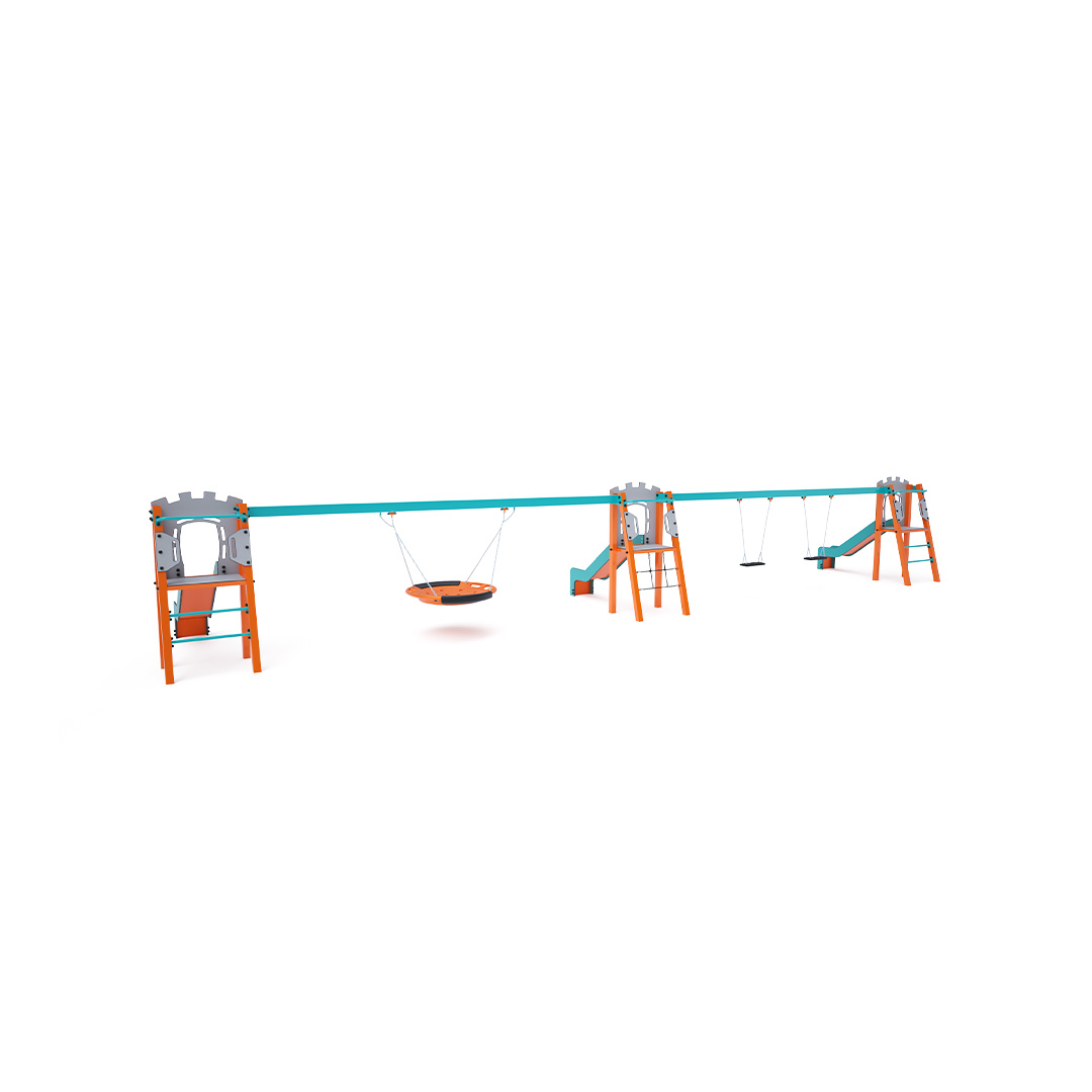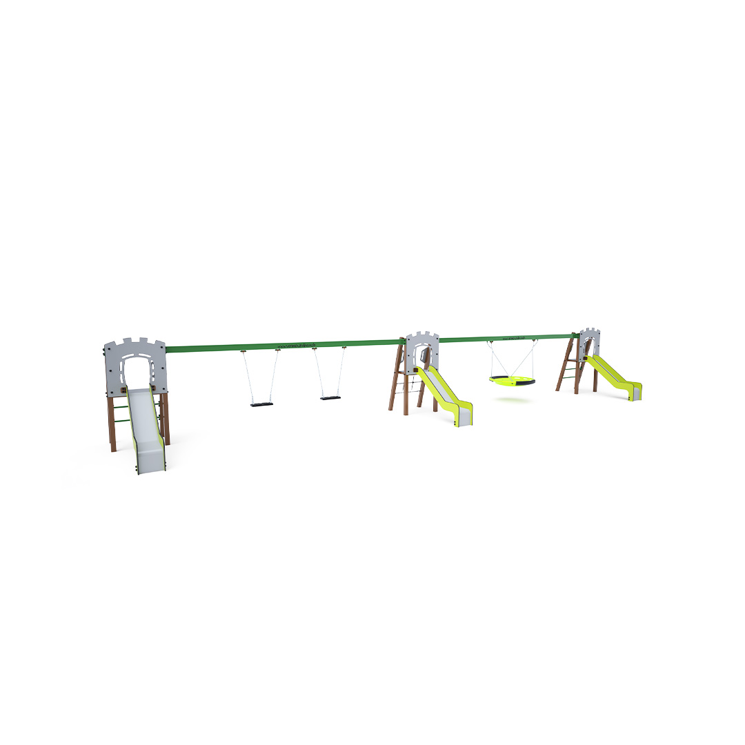 Three certified maintenance-free A-shaped towers. Two with ladder access and slides, and one with a rope net and slide, connected by two hanging swings. One double swing can contain two classic seats, two baby seats, or a combination of both. The second swing is a nest swing. The baby seat for children includes a partition with a bar between the child's legs, preventing slipping or falling. At the same time, the child can lean back. The nest swing is suitable for rocking small children while lying down or for several children at once. The nest features a safety suspension with a locking chain.The steel construction is weather-resistant due to hot-dip galvanizing and durable powder coating. The HPL material and HDPE plastic used are chemically resistant, UV-resistant - colorfast, non-toxic, recyclable, and unbreakable. This ensures there is no risk of injury to children from sharp edges or fragments.
