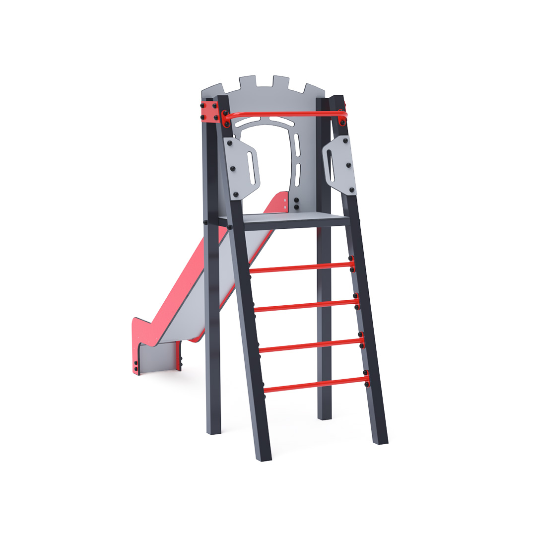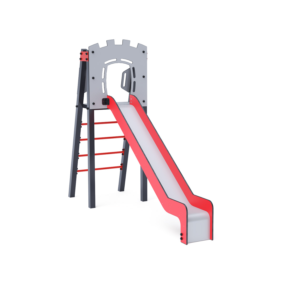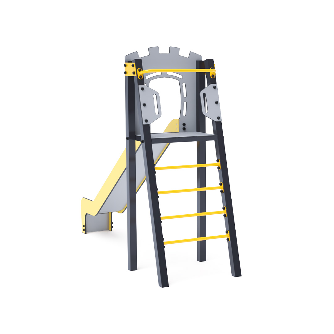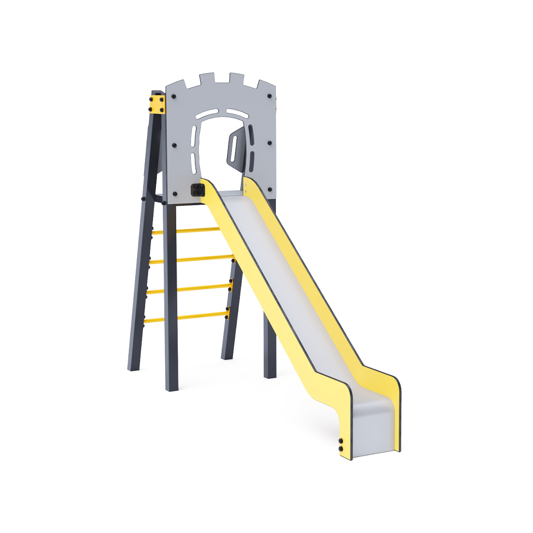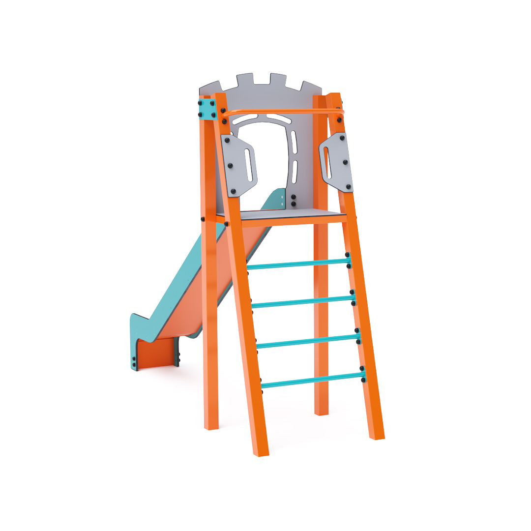 Certified maintenance-free A-shaped tower with ladder and slide. This basic setup fits even in small spaces, offering a full-fledged play element. Its turquoise and orange design is inviting from afar. The steel construction is weather-resistant due to hot-dip galvanization and powder-coated finish. The HDPE plastic (High-Density Polyethylene) used is chemically resistant, UV-stable, non-toxic, recyclable, and shatterproof, ensuring no sharp edges or fragments that could harm children. All joints are stainless steel and covered with plastic caps to enhance durability and safety.