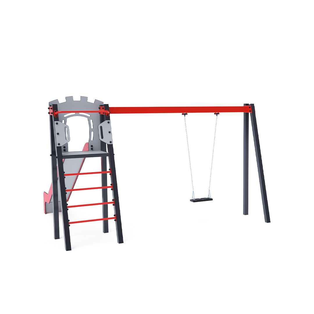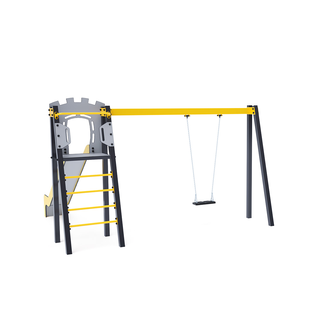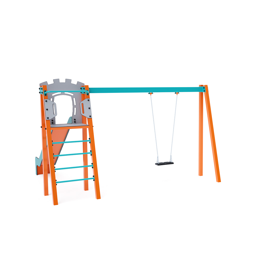 Certified maintenance-free A-shaped tower with ladder and slide, complemented by a hanging swing with a traditional seat. Its turquoise and orange design is inviting from a distance.The steel construction is weather-resistant thanks to hot-dip galvanization and powder-coated finish. The HPL and HDPE plastic used are chemically resistant, UV-stable, colorfast, non-toxic, recyclable, and shatterproof, ensuring no risk of injury from sharp edges or fragments for children. All joints are stainless steel and covered with plastic caps to enhance durability and safety.