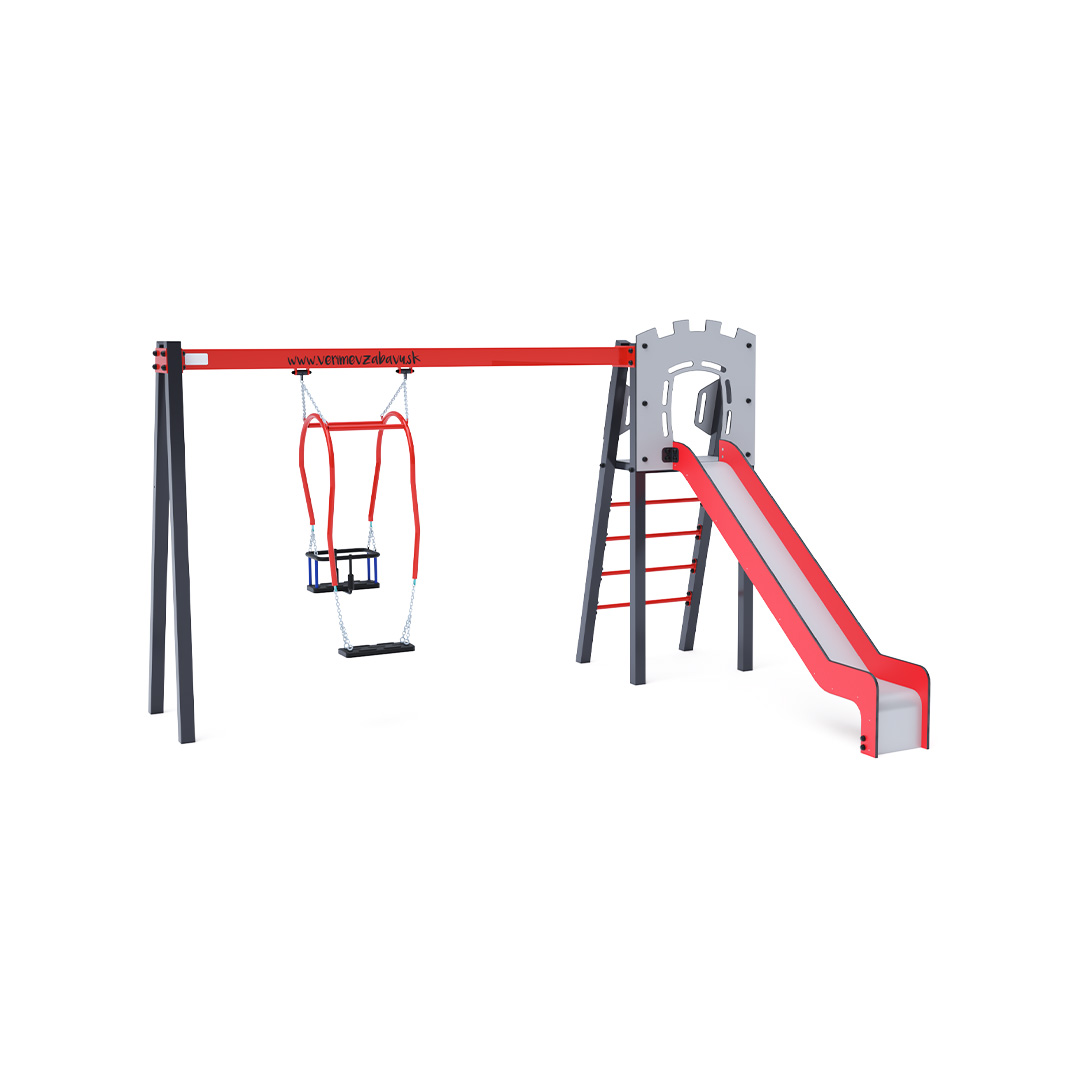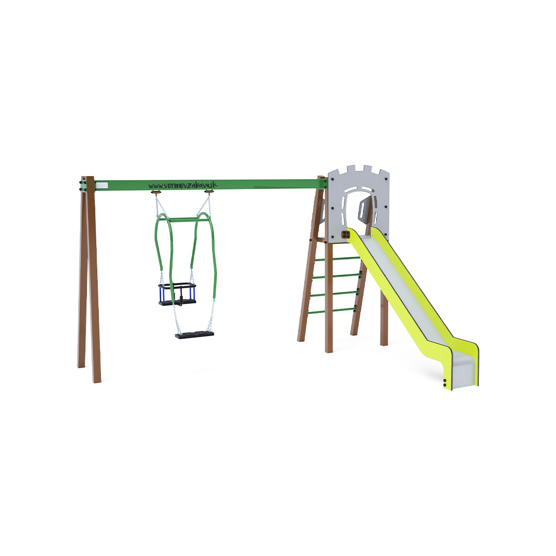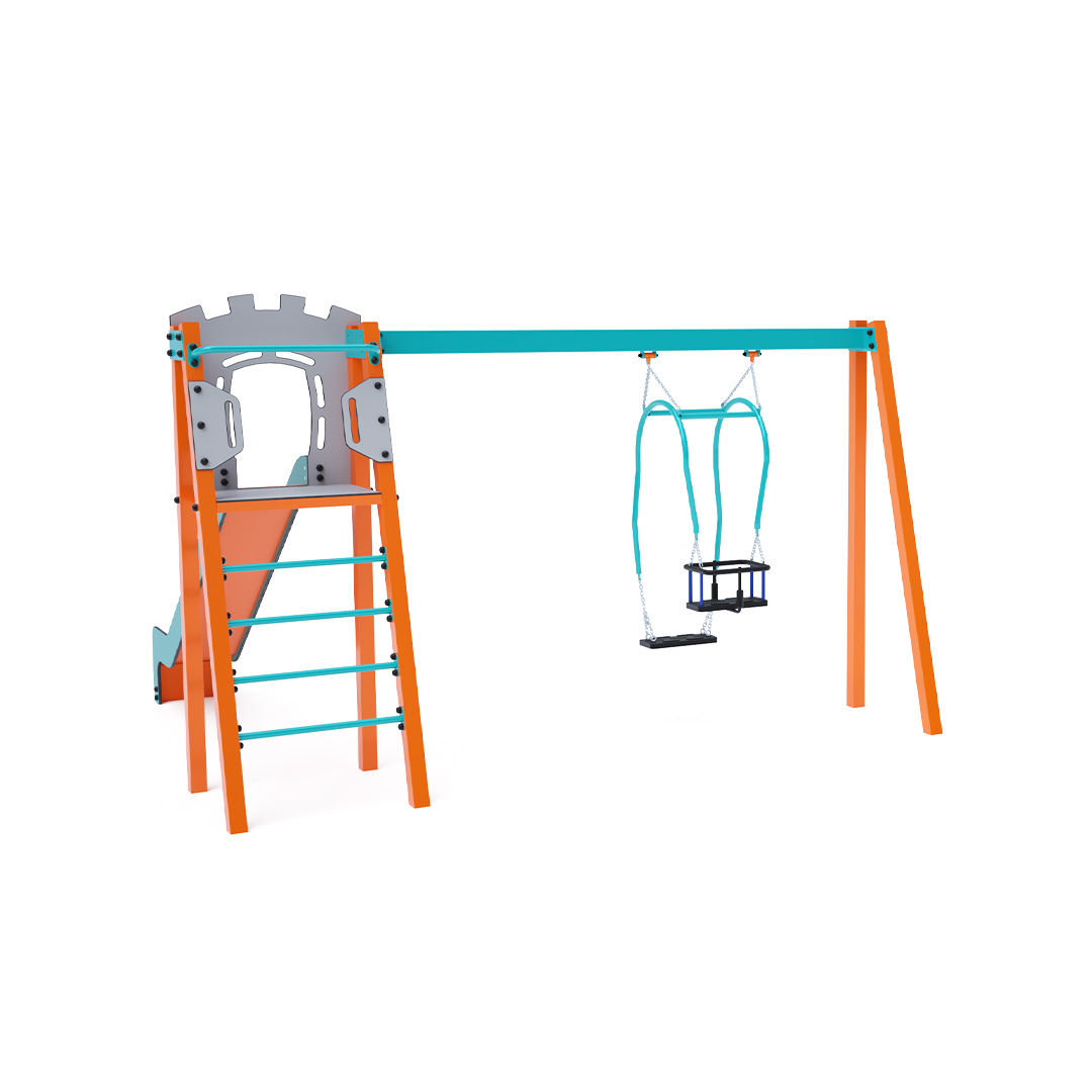 Certified maintenance-free A-shaped tower with ladder and slide, complemented by a hanging swing with a mother and child seat. Its turquoise and orange design is enticing from afar.The steel construction is weather-resistant due to hot-dip galvanization and powder-coated finish. The HPL (High Pressure Laminate) material and HDPE plastic used are chemically resistant, UV-stable, colorfast, non-toxic, recyclable, and shatterproof, ensuring no risk of injury from sharp edges or fragments for children. All joints are stainless steel and covered with plastic caps to enhance durability and safety.