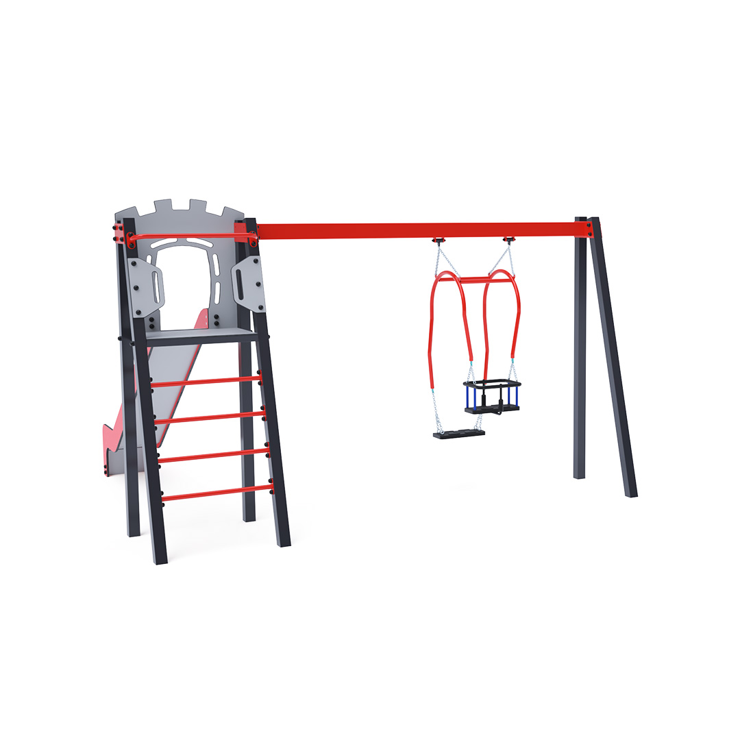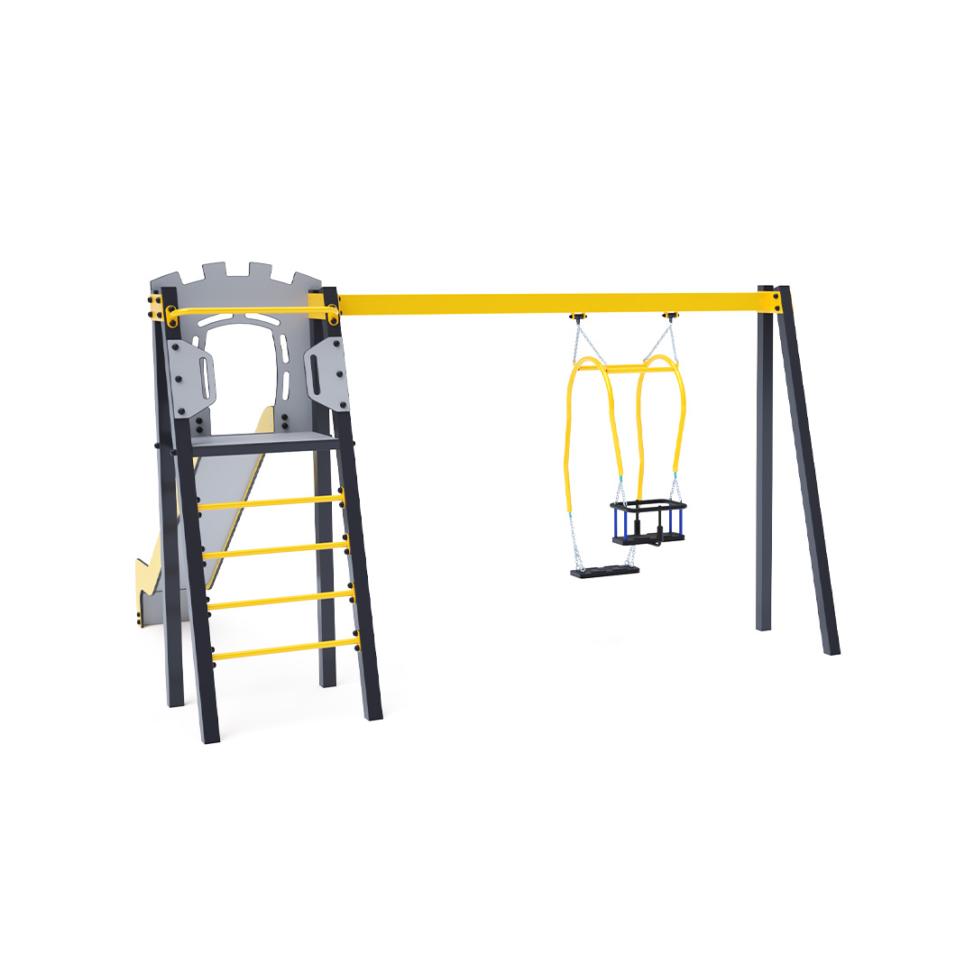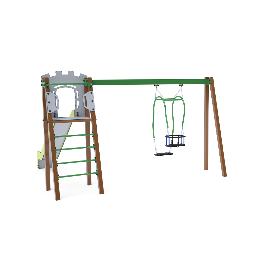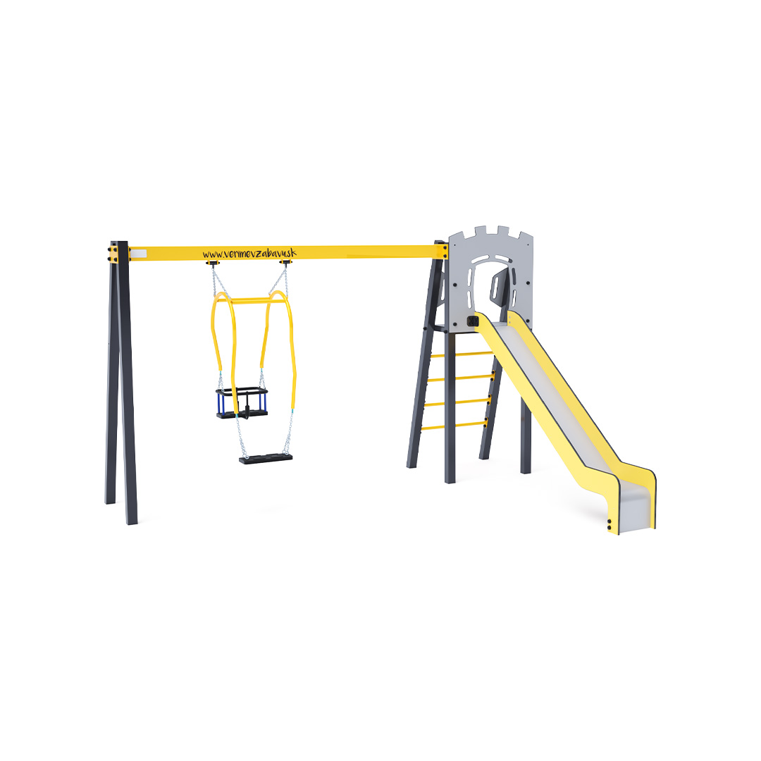 Certified maintenance-free A-shaped tower with ladder and slide, complemented by a hanging swing with a mother and child seat. Its turquoise and orange design is enticing from afar.The steel construction is weather-resistant due to hot-dip galvanization and powder-coated finish. The HPL (High Pressure Laminate) material and HDPE plastic used are chemically resistant, UV-stable, colorfast, non-toxic, recyclable, and shatterproof, ensuring no risk of injury from sharp edges or fragments for children. All joints are stainless steel and covered with plastic caps to enhance durability and safety.