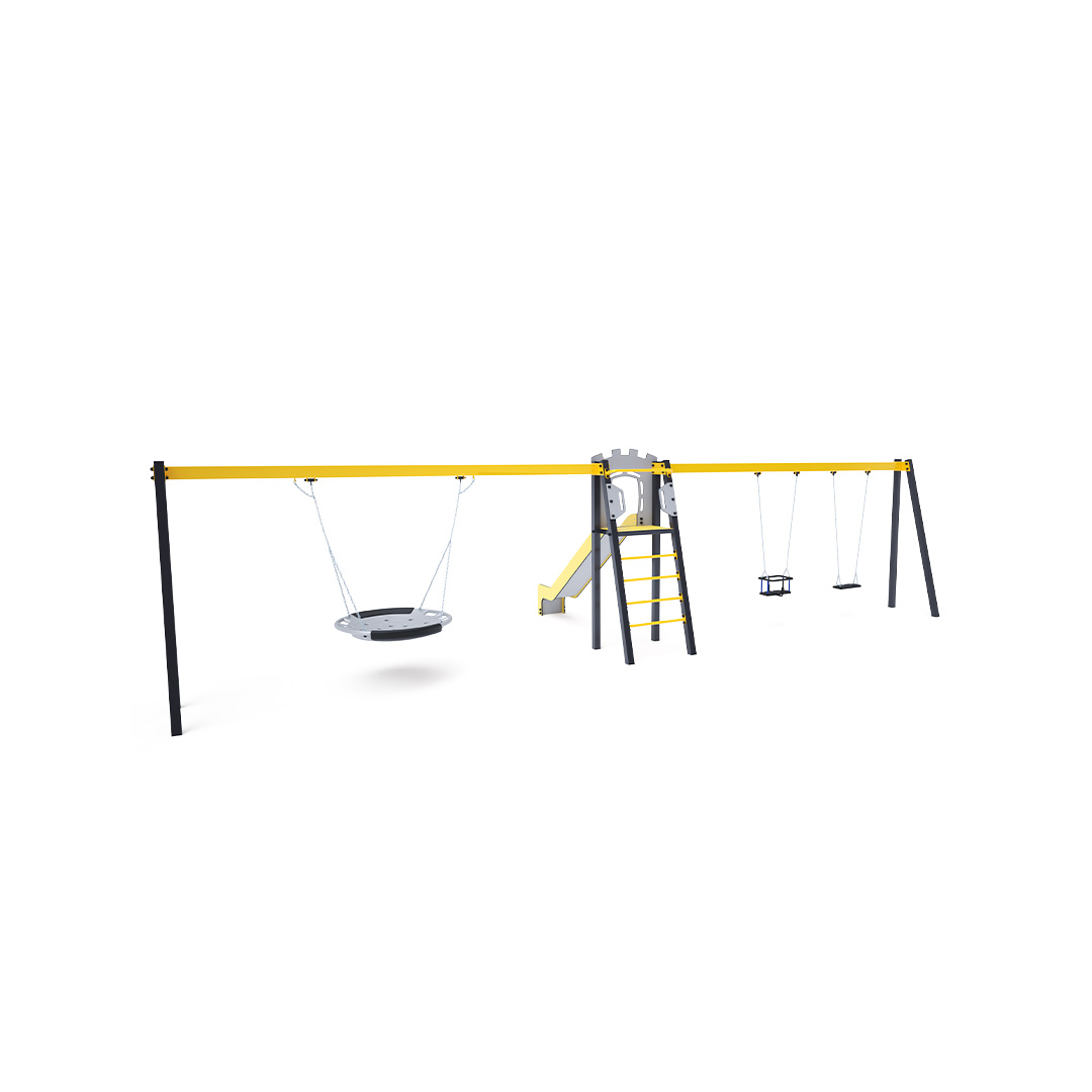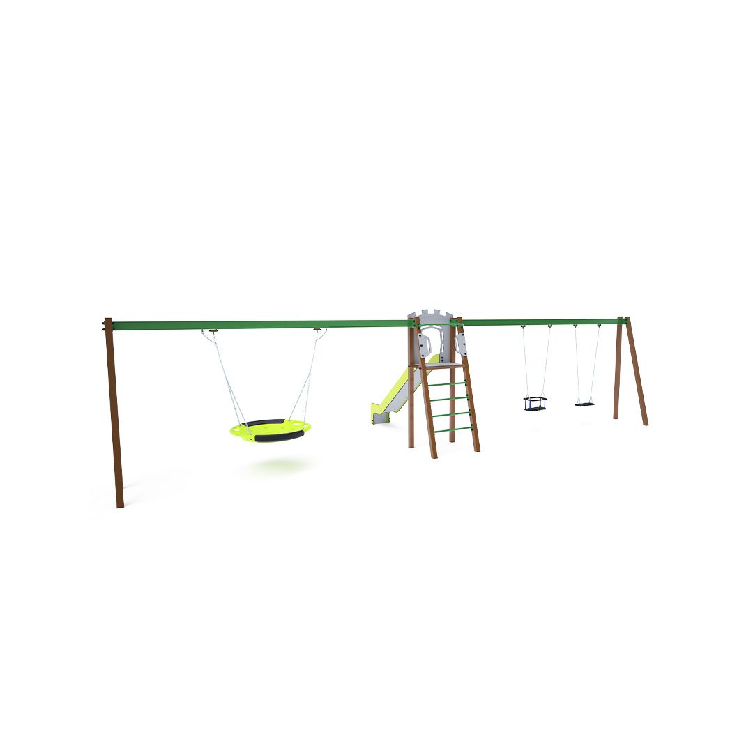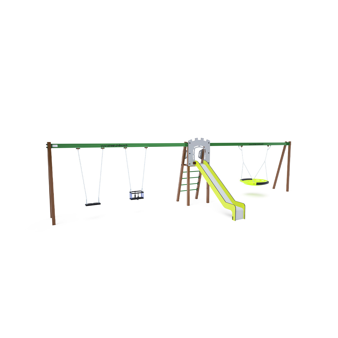 Certified maintenance-free A-shaped tower with ladder and slide, supplemented by two hanging swings. On one side, there are traditional and baby seats; on the other side, there is a swinging nest. The baby seat includes a barrier with a partition between the child's legs, preventing sliding or falling. The nest swing is suitable for swinging small children lying down or for multiple children at once, equipped with a safety suspension and securing chain. The steel construction is weather-resistant due to hot-dip galvanization and powder-coated finish. The HPL material and HDPE plastic used are chemically resistant, UV-stable, colorfast, non-toxic, recyclable, and shatterproof, ensuring no risk of injury from sharp edges or fragments for children.