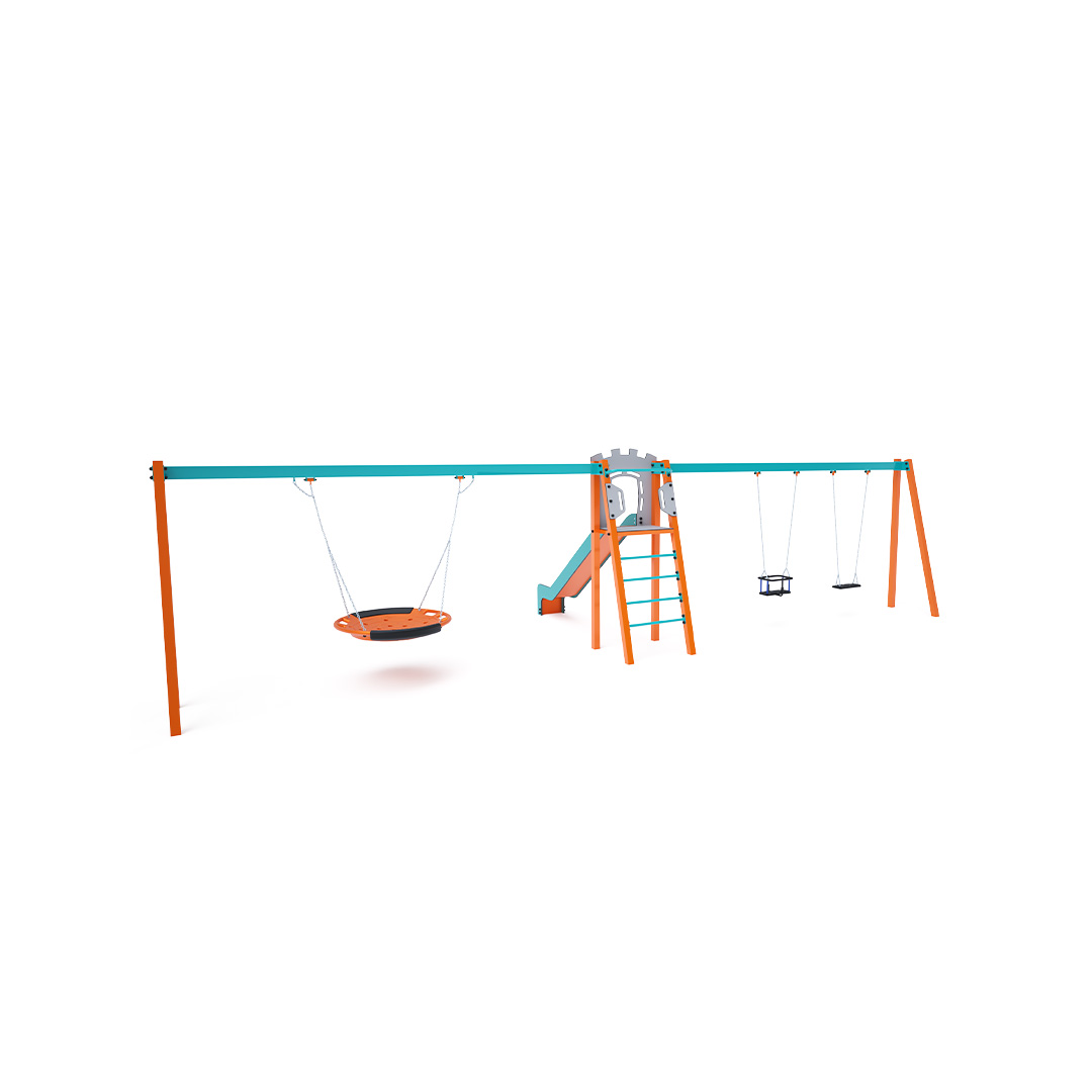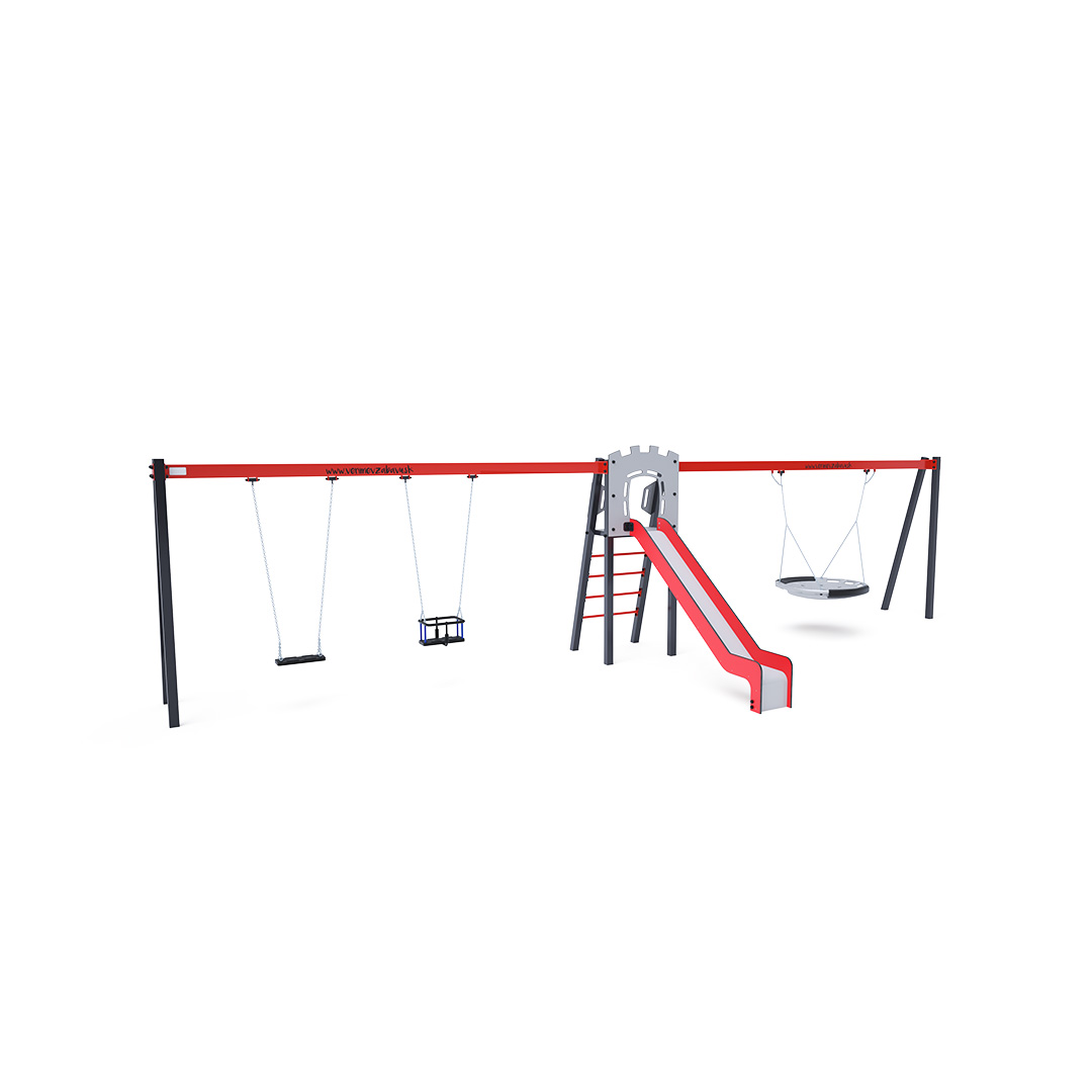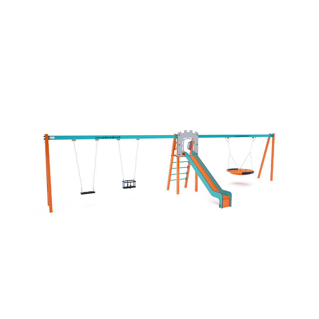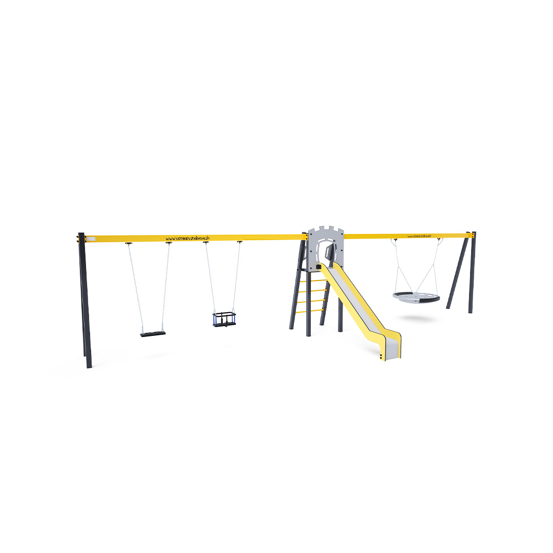Certified maintenance-free A-shaped tower with ladder and slide, supplemented by two hanging swings. On one side, there are traditional and baby seats; on the other side, there is a swinging nest. The baby seat includes a barrier with a partition between the child's legs, preventing sliding or falling. The nest swing is suitable for swinging small children lying down or for multiple children at once, equipped with a safety suspension and securing chain. The steel construction is weather-resistant due to hot-dip galvanization and powder-coated finish. The HPL material and HDPE plastic used are chemically resistant, UV-stable, colorfast, non-toxic, recyclable, and shatterproof, ensuring no risk of injury from sharp edges or fragments for children.