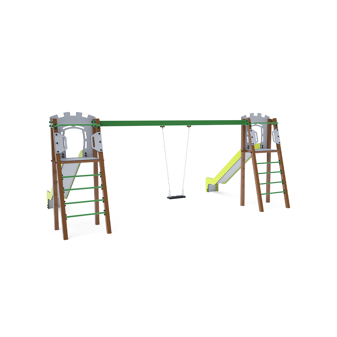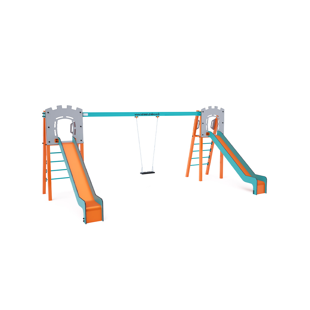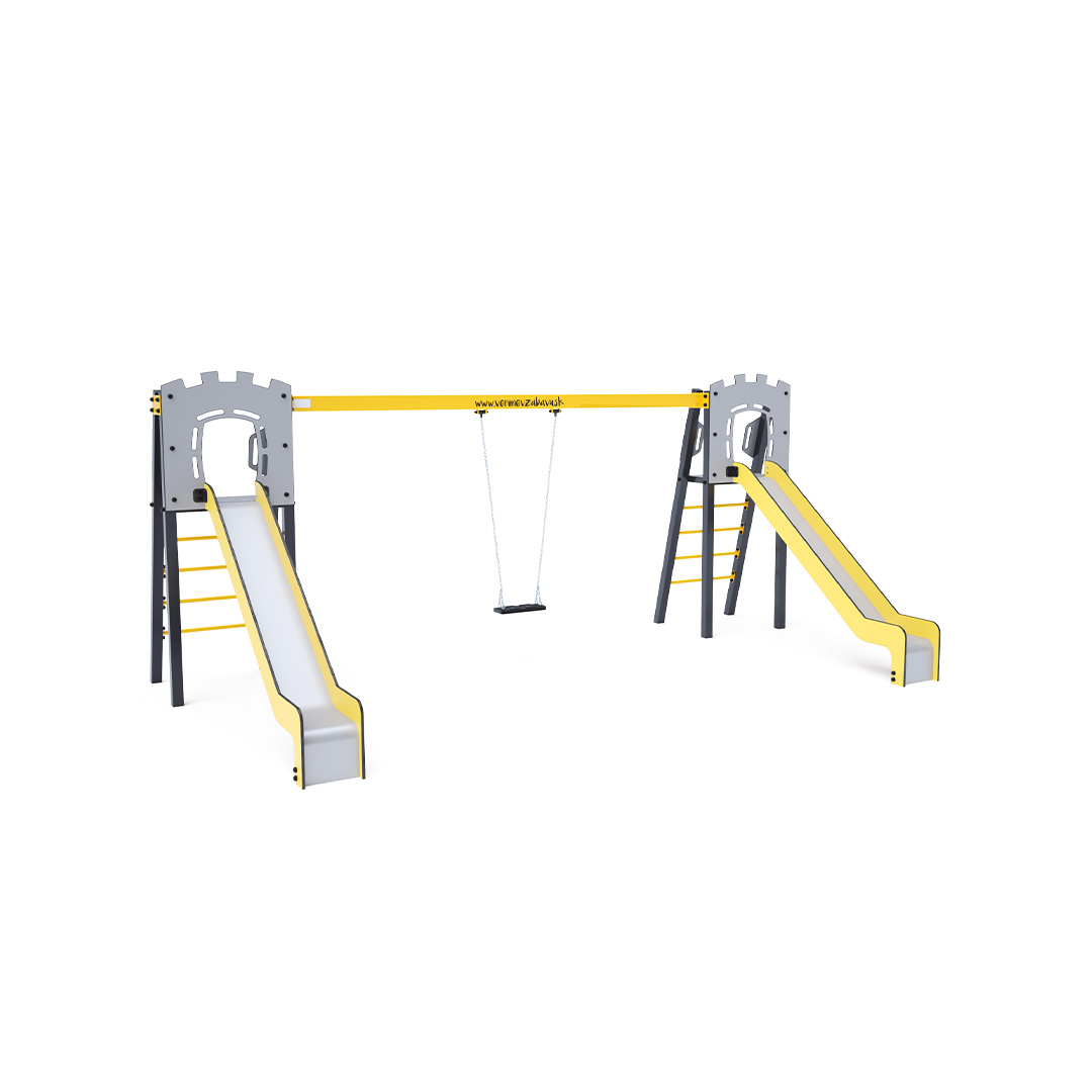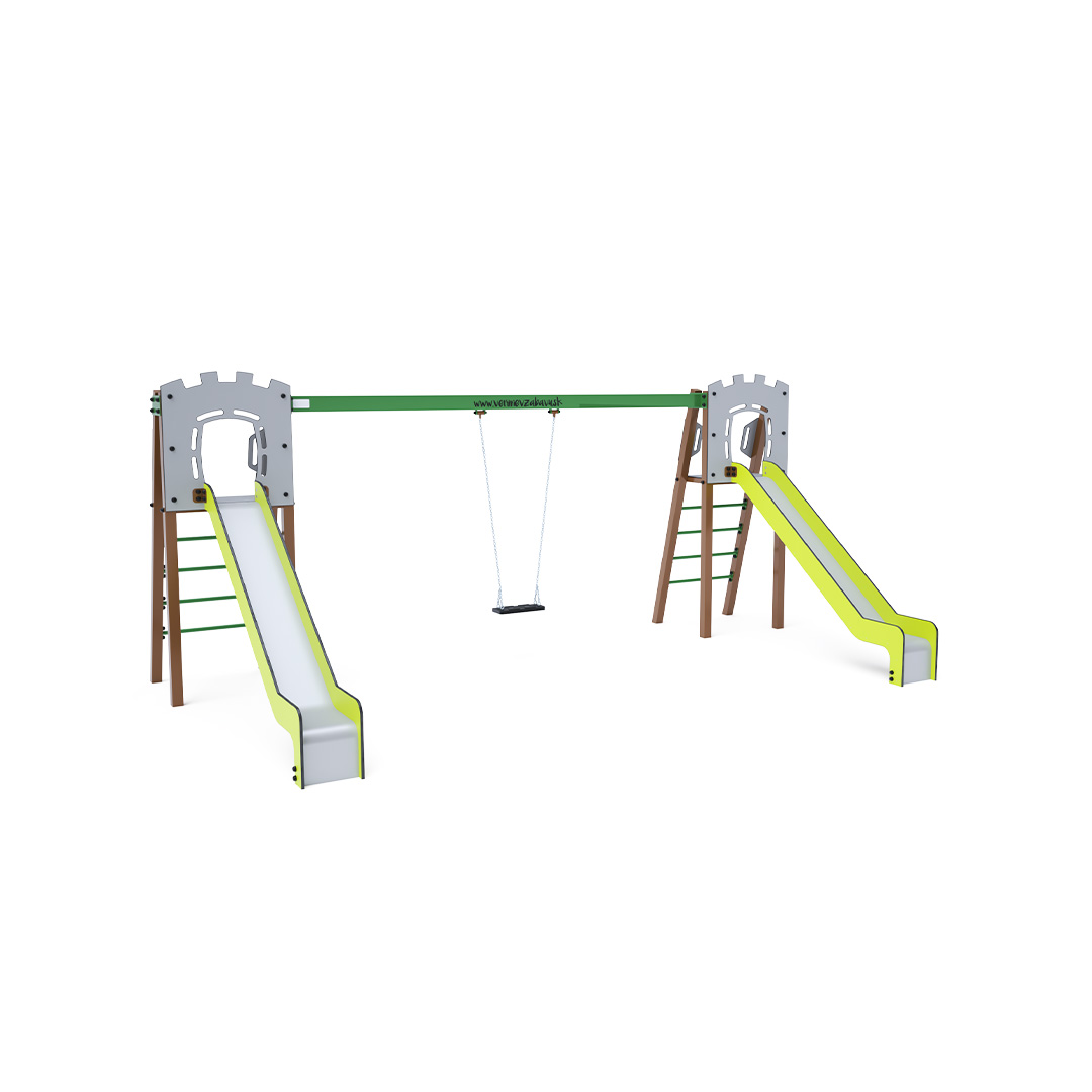 Slide Two certified maintenance-free A-shaped towers with ladder and slide, complemented by a hanging swing. You can choose between a traditional seat or a baby seat. The baby seat includes a barrier with a partition between the child's legs, preventing sliding or falling. It also allows the child to lean comfortably.The steel construction is weather-resistant due to hot-dip galvanization and powder-coated finish. The HPL material and HDPE plastic used are chemically resistant, UV-stable, colorfast, non-toxic, recyclable, and shatterproof, ensuring no risk of injury from sharp edges or fragments for children.