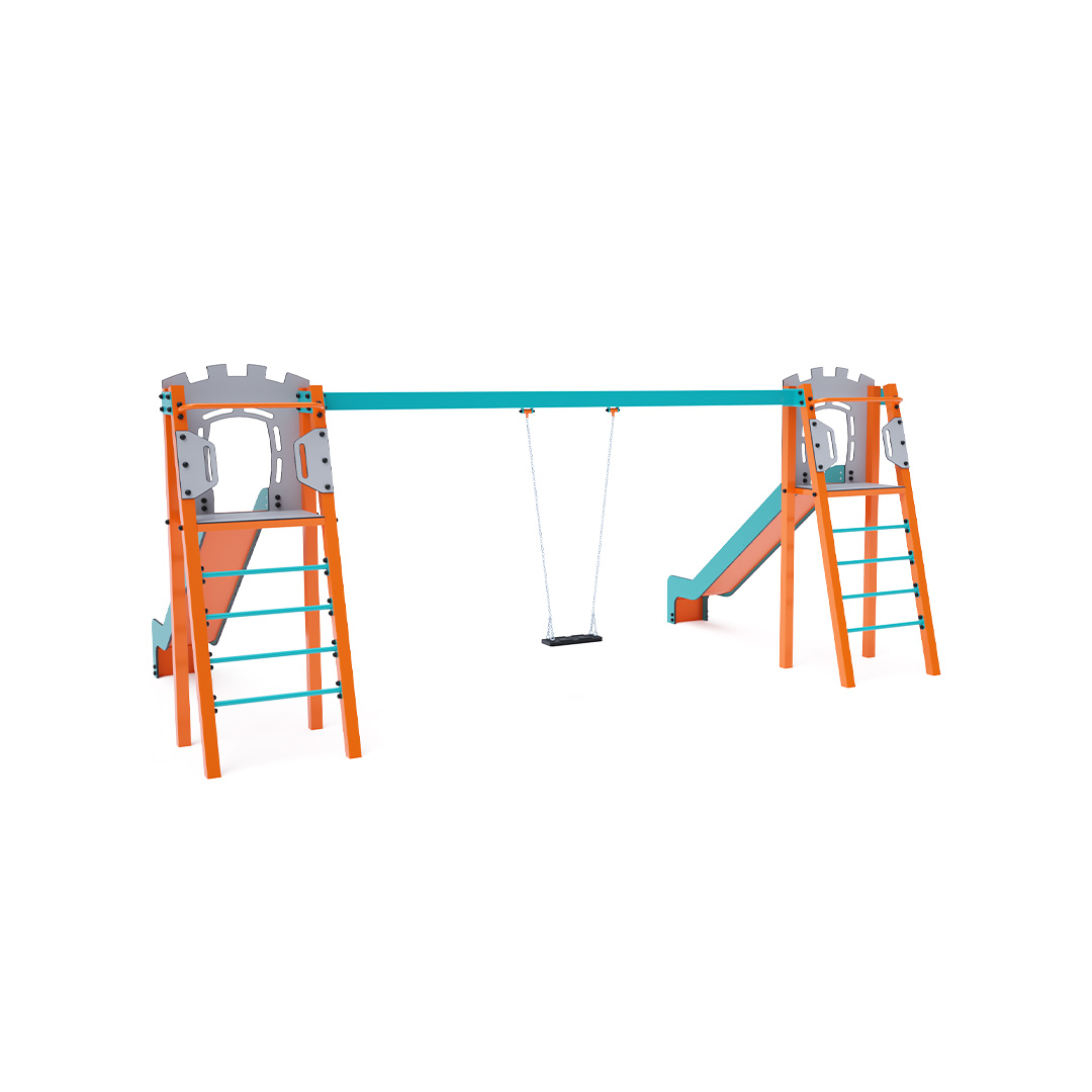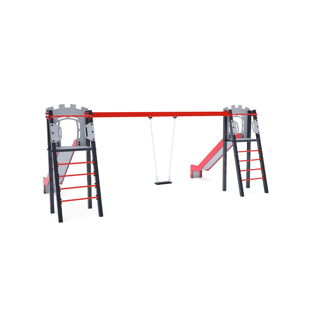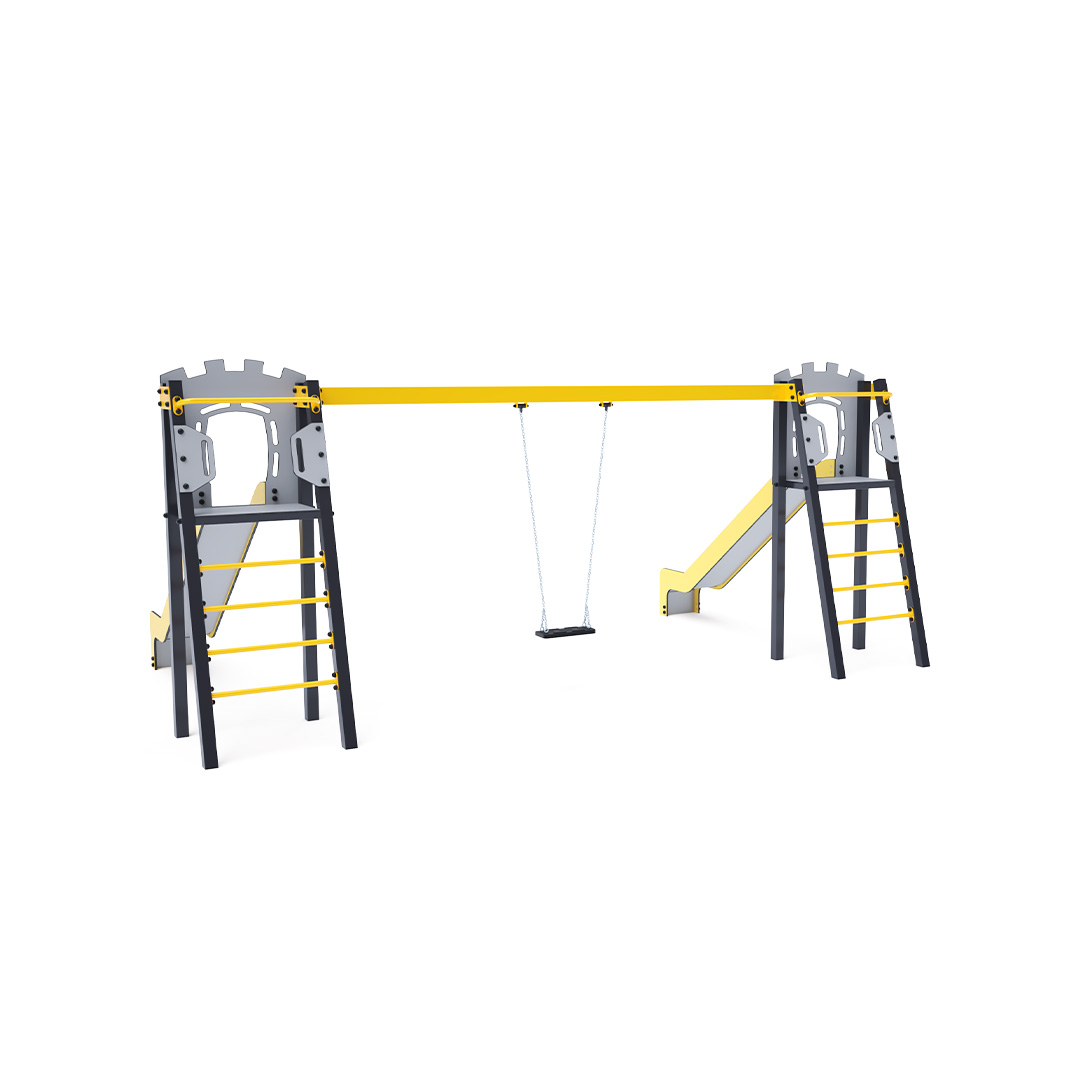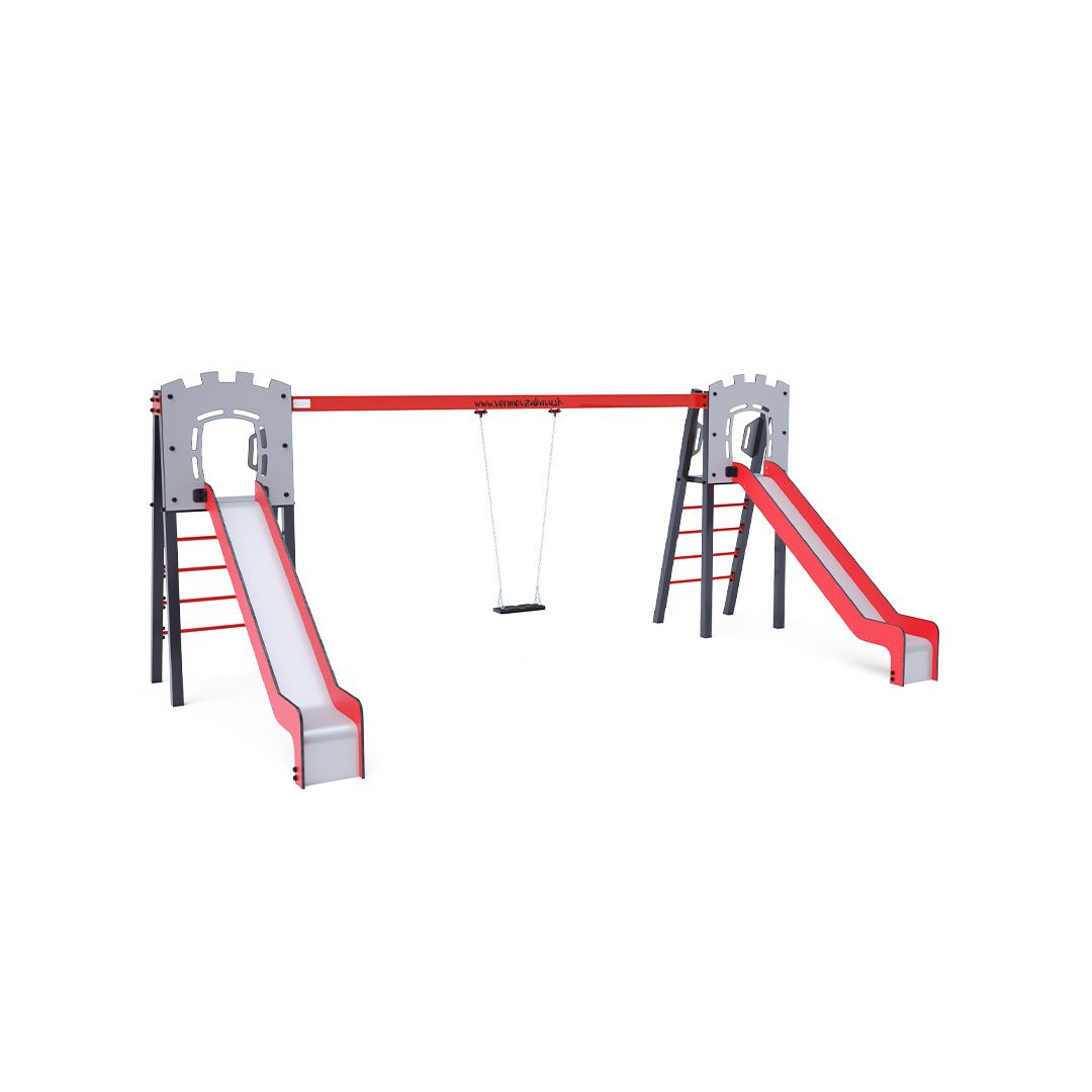Slide Two certified maintenance-free A-shaped towers with ladder and slide, complemented by a hanging swing. You can choose between a traditional seat or a baby seat. The baby seat includes a barrier with a partition between the child's legs, preventing sliding or falling. It also allows the child to lean comfortably.The steel construction is weather-resistant due to hot-dip galvanization and powder-coated finish. The HPL material and HDPE plastic used are chemically resistant, UV-stable, colorfast, non-toxic, recyclable, and shatterproof, ensuring no risk of injury from sharp edges or fragments for children.