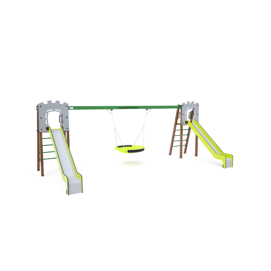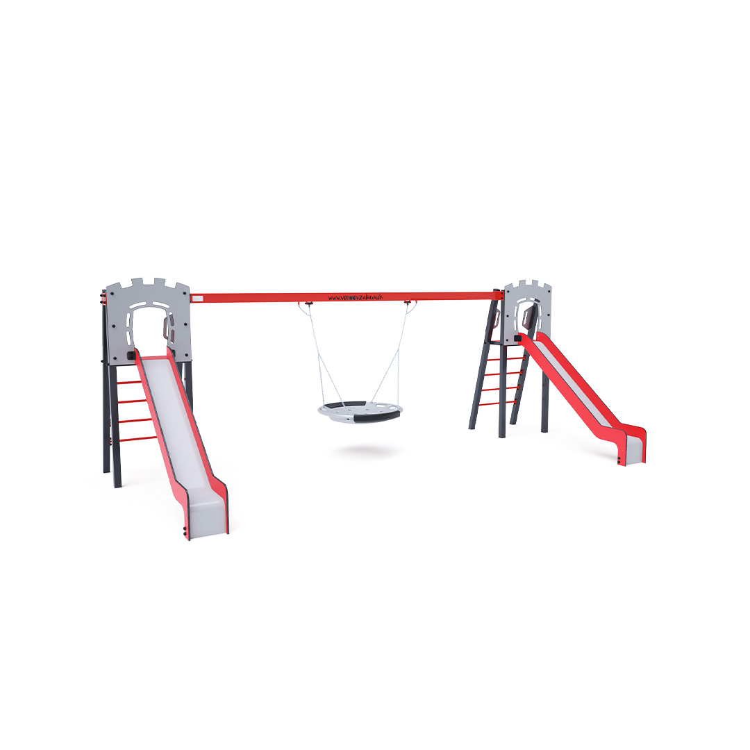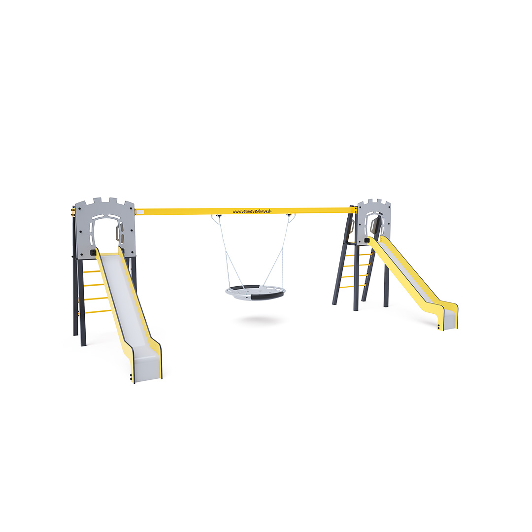 Slide Two certified maintenance-free A-shaped towers with ladder access and a slide, complemented by a swing with a nest swing. The nest swing is suitable for rocking small children while lying down or for several children at once. The nest features a safety suspension with a locking chain. The steel construction is weather-resistant due to hot-dip galvanizing and durable powder coating. The HPL material and HDPE plastic used are chemically resistant, UV-resistant - colorfast, non-toxic, recyclable, and unbreakable. This ensures that there is no risk of injury to children from sharp edges or fragments.