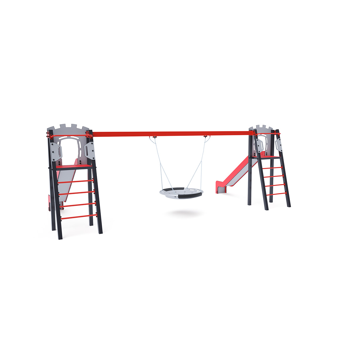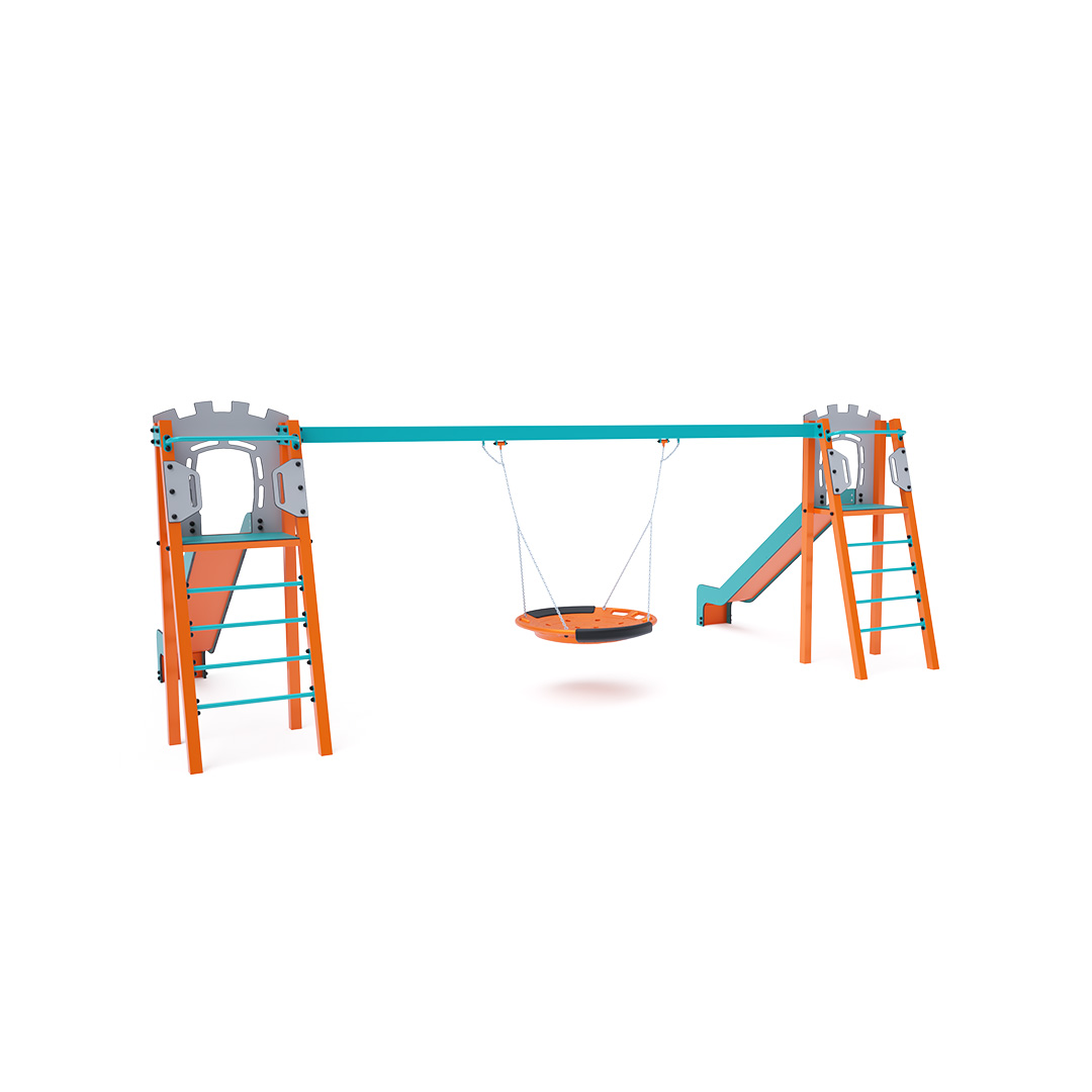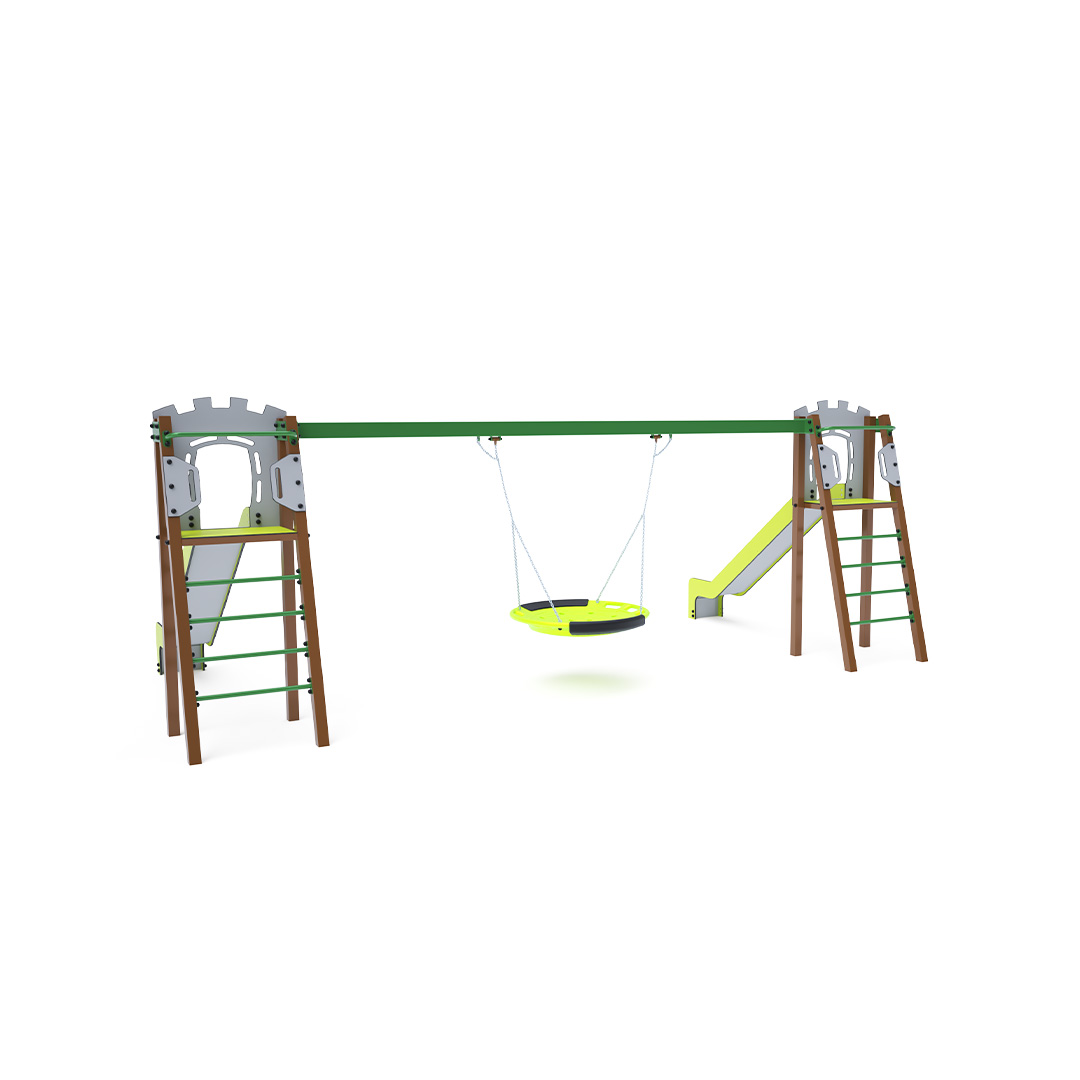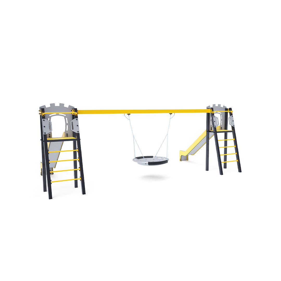 Slide Two certified maintenance-free A-shaped towers with ladder access and a slide, complemented by a swing with a nest swing. The nest swing is suitable for rocking small children while lying down or for several children at once. The nest features a safety suspension with a locking chain. The steel construction is weather-resistant due to hot-dip galvanizing and durable powder coating. The HPL material and HDPE plastic used are chemically resistant, UV-resistant - colorfast, non-toxic, recyclable, and unbreakable. This ensures that there is no risk of injury to children from sharp edges or fragments.