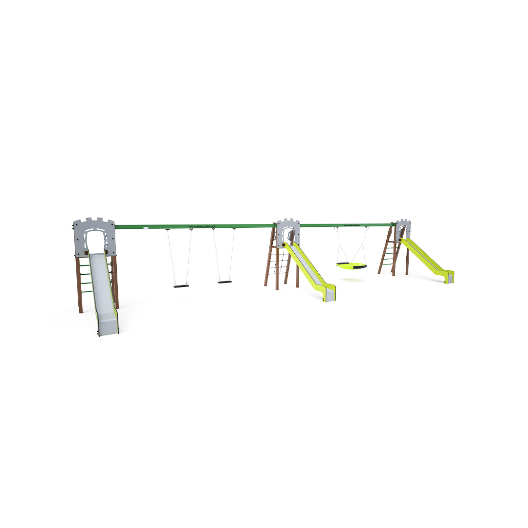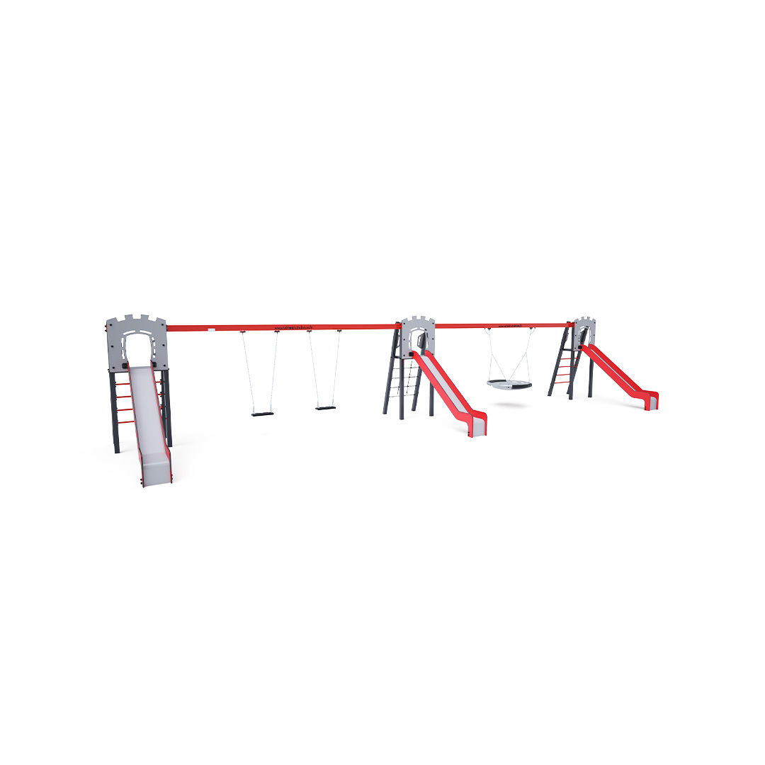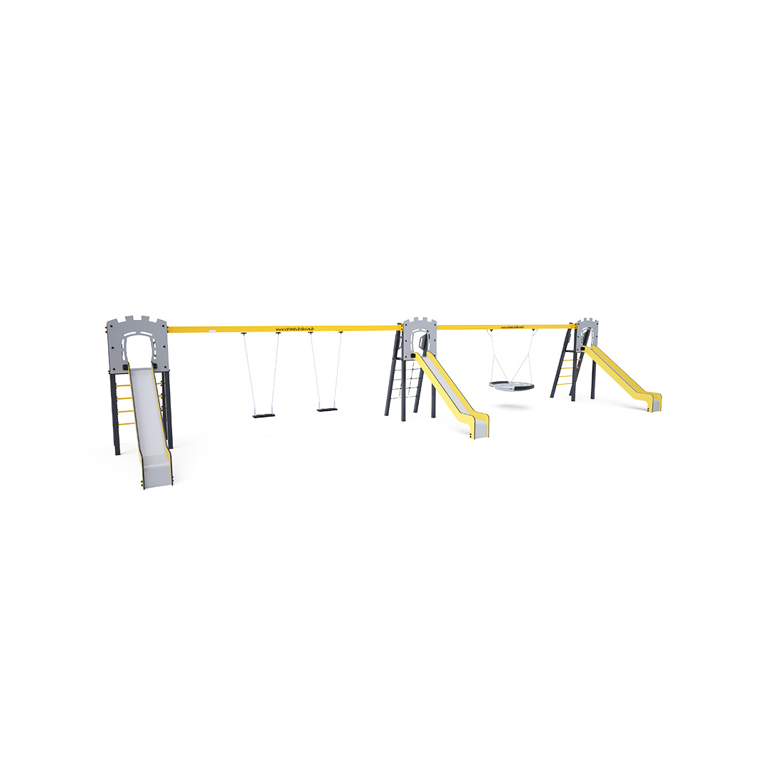 Three certified maintenance-free A-shaped towers. Two with ladder access and slides, and one with a rope net and slide, connected by two hanging swings. One double swing can contain two classic seats, two baby seats, or a combination of both. The second swing is a nest swing. The baby seat for children includes a partition with a bar between the child's legs, preventing slipping or falling. At the same time, the child can lean back. The nest swing is suitable for rocking small children while lying down or for several children at once. The nest features a safety suspension with a locking chain.The steel construction is weather-resistant due to hot-dip galvanizing and durable powder coating. The HPL material and HDPE plastic used are chemically resistant, UV-resistant - colorfast, non-toxic, recyclable, and unbreakable. This ensures there is no risk of injury to children from sharp edges or fragments.