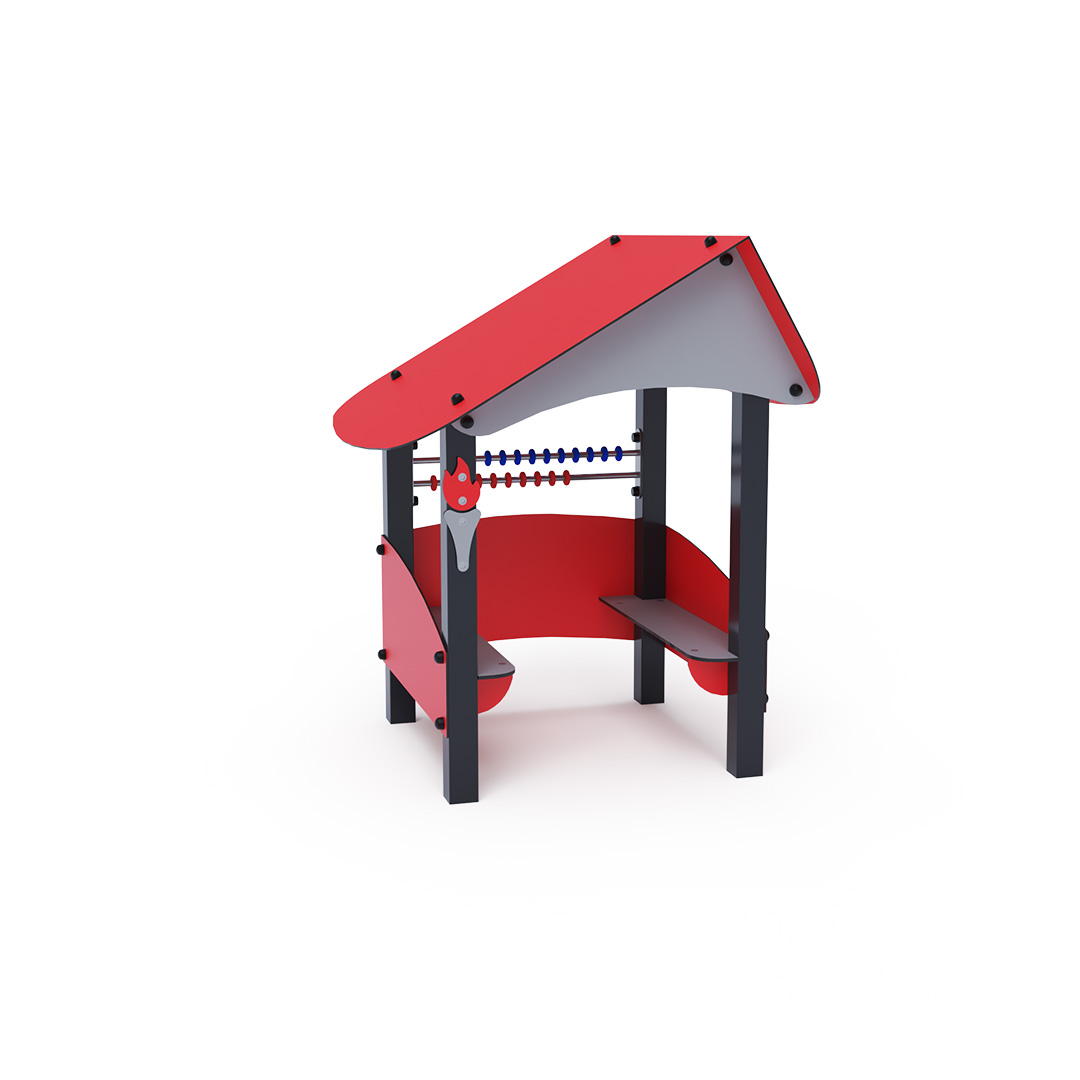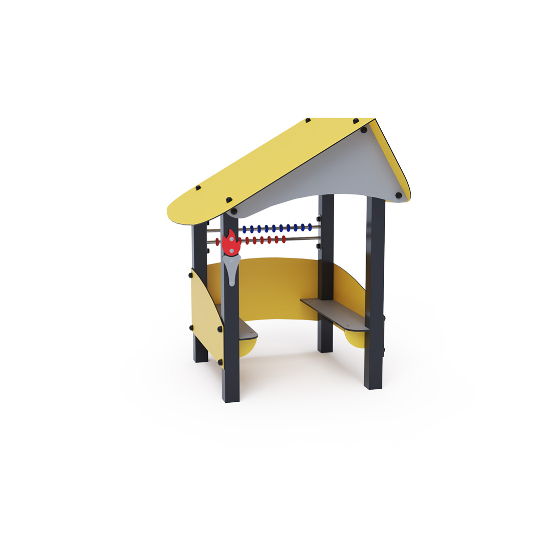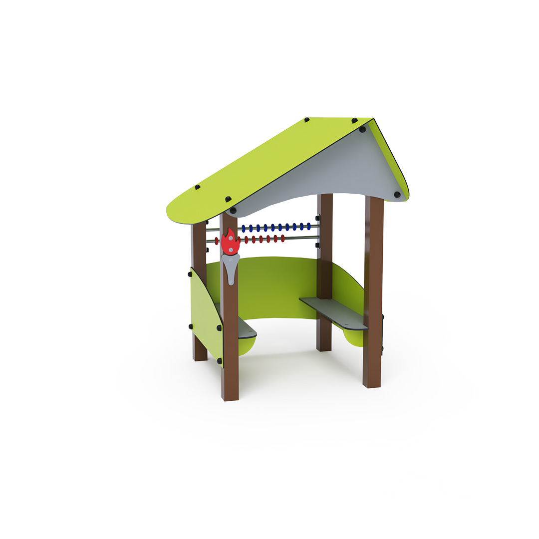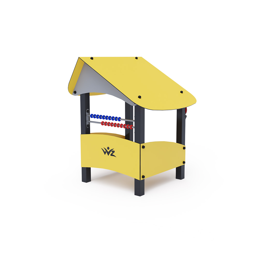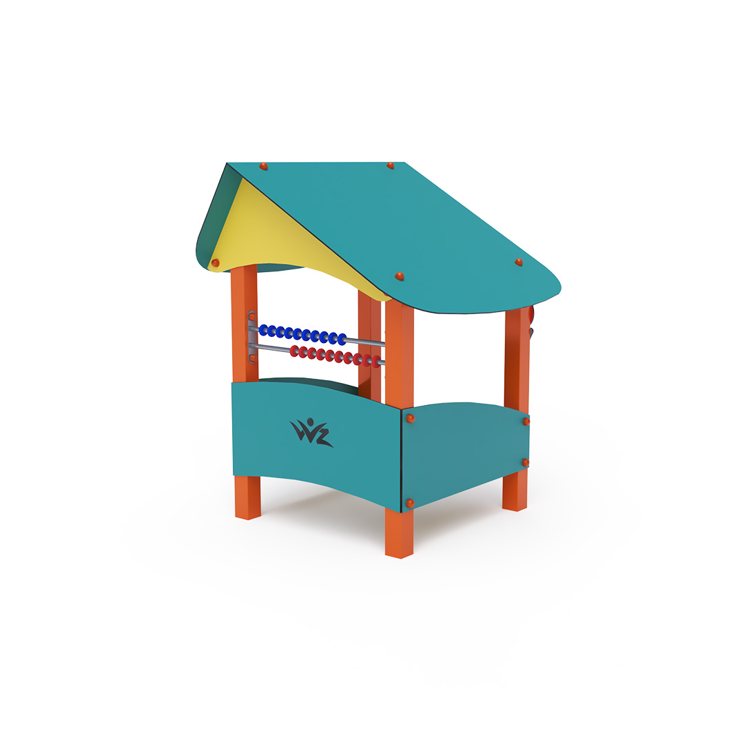 Small house with a sloping roof, complemented by a small abacus, is an ideal playground set for kindergartens.The construction of the house is made of galvanized and powder-coated steel. All boards are made of HPL material with UV protection, which is color-stable, non-toxic, and unbreakable. All joints are stainless steel and covered with plastic caps.