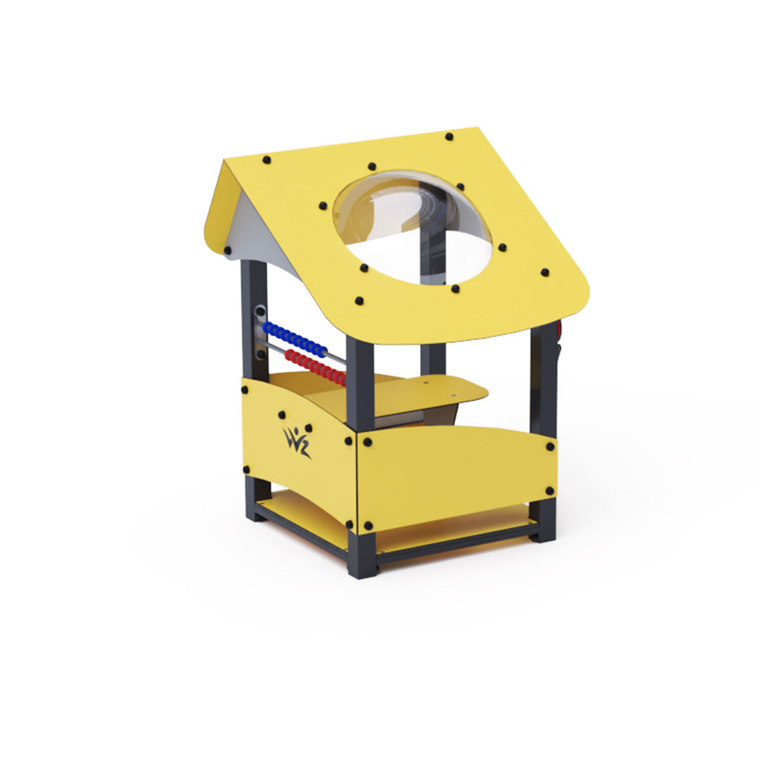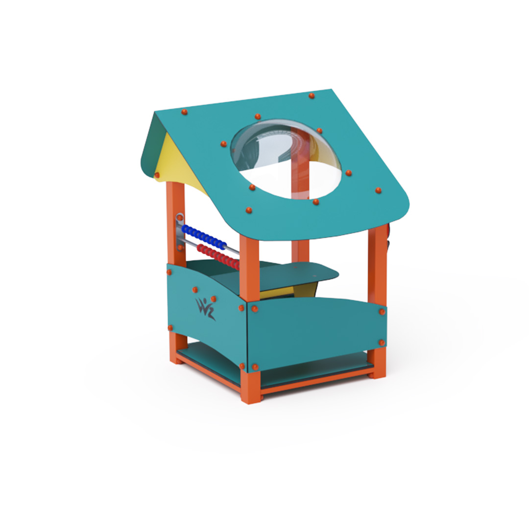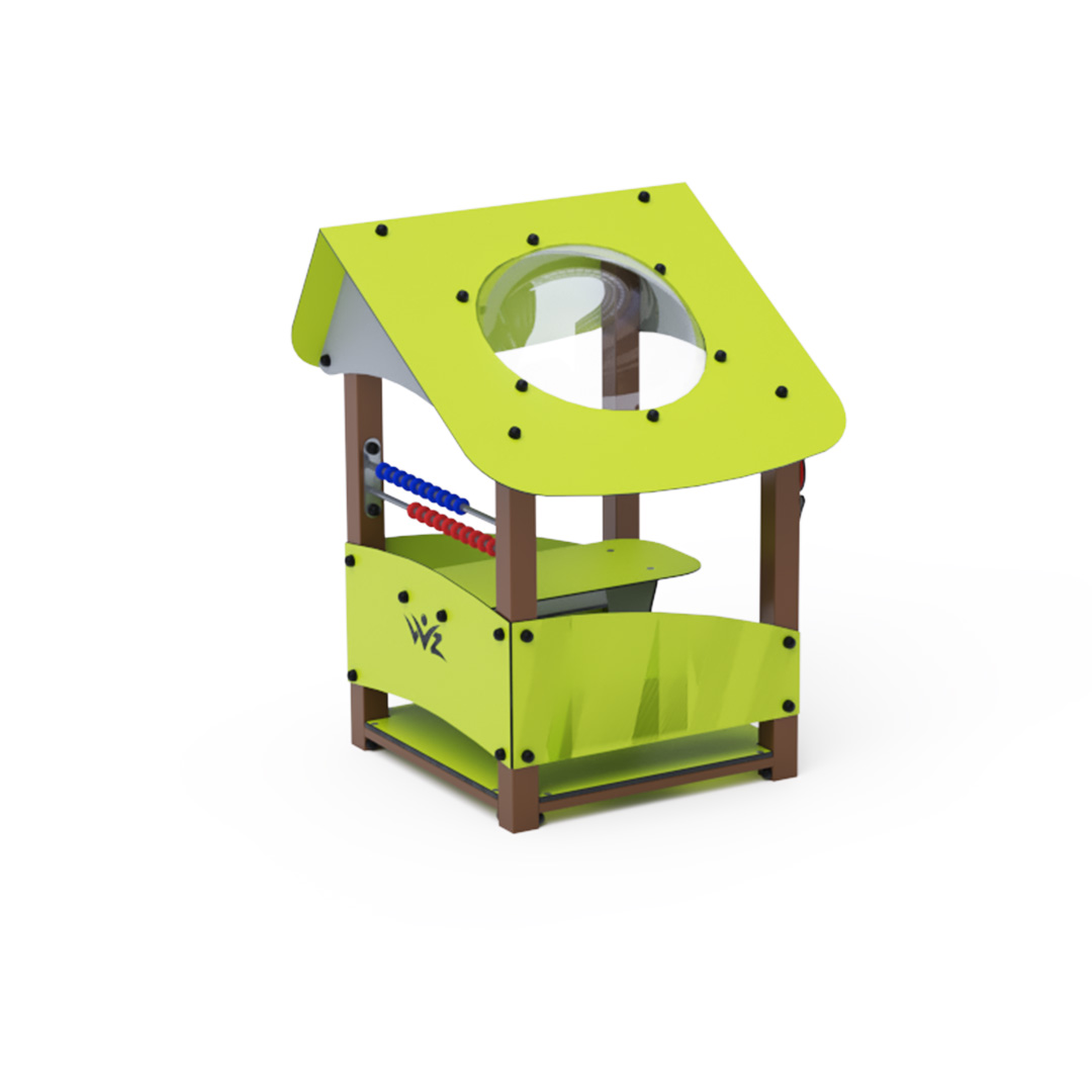 Small house with a sloping roof, complemented by a small abacus, is an ideal playground set for kindergartens.The construction of the house is made of galvanized and powder-coated steel. All boards are made of HPL material with UV protection, which is color-stable, non-toxic, and unbreakable. All joints are stainless steel and covered with plastic caps.