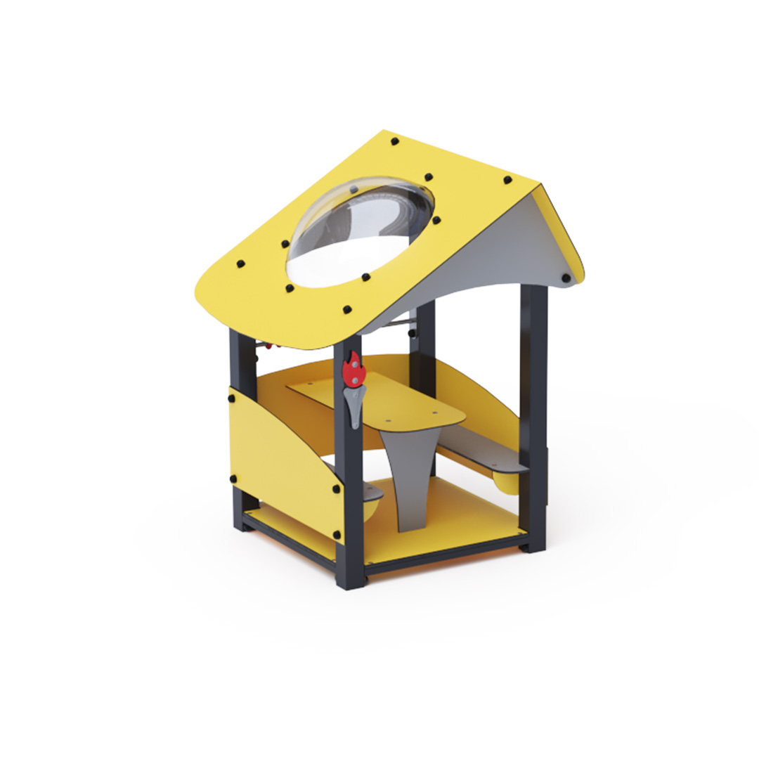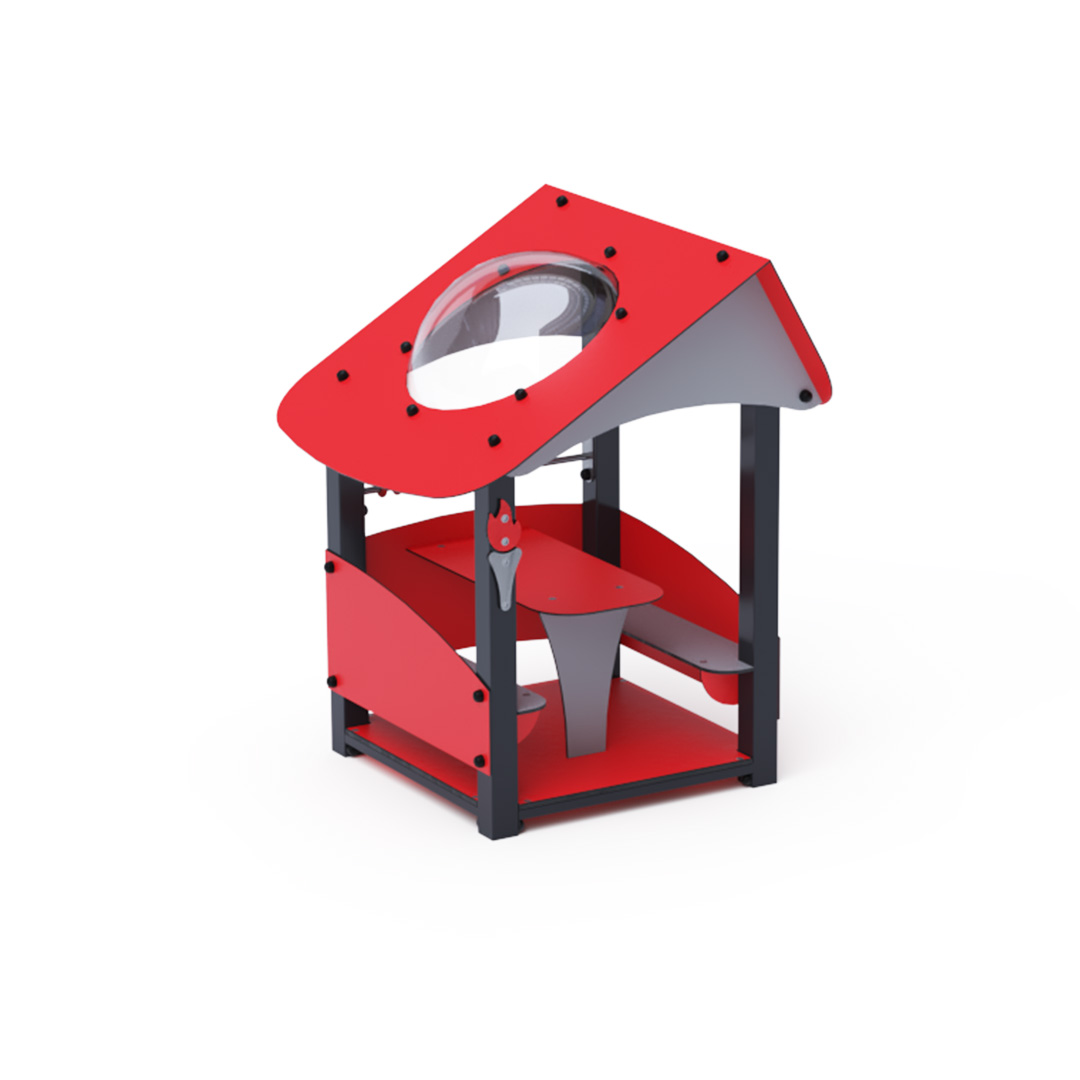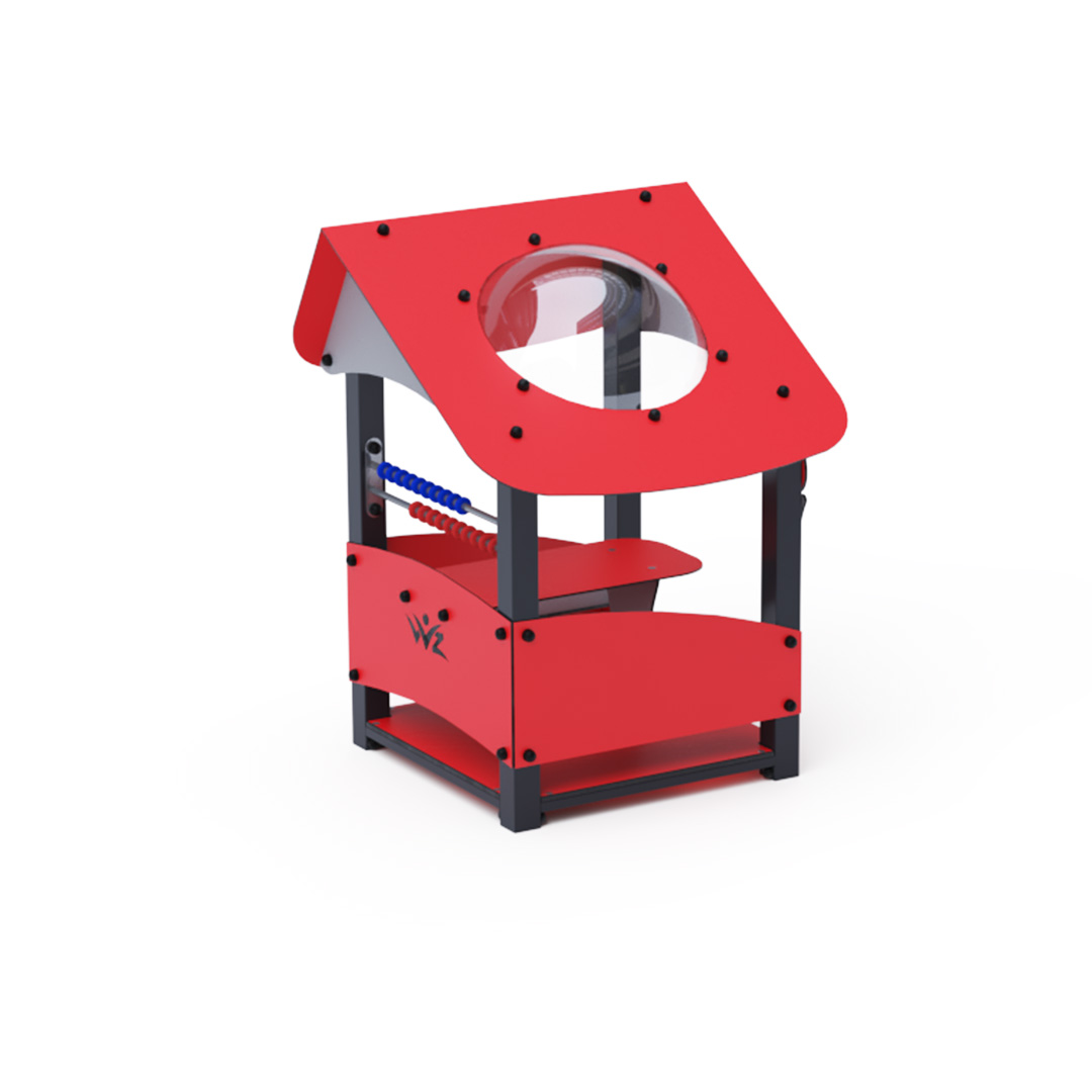 Small house with a sloping roof, complemented by a small abacus, is an ideal playground set for kindergartens.The construction of the house is made of galvanized and powder-coated steel. All boards are made of HPL material with UV protection, which is color-stable, non-toxic, and unbreakable. All joints are stainless steel and covered with plastic caps.