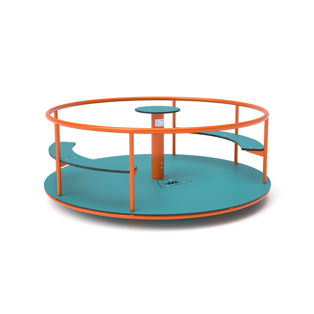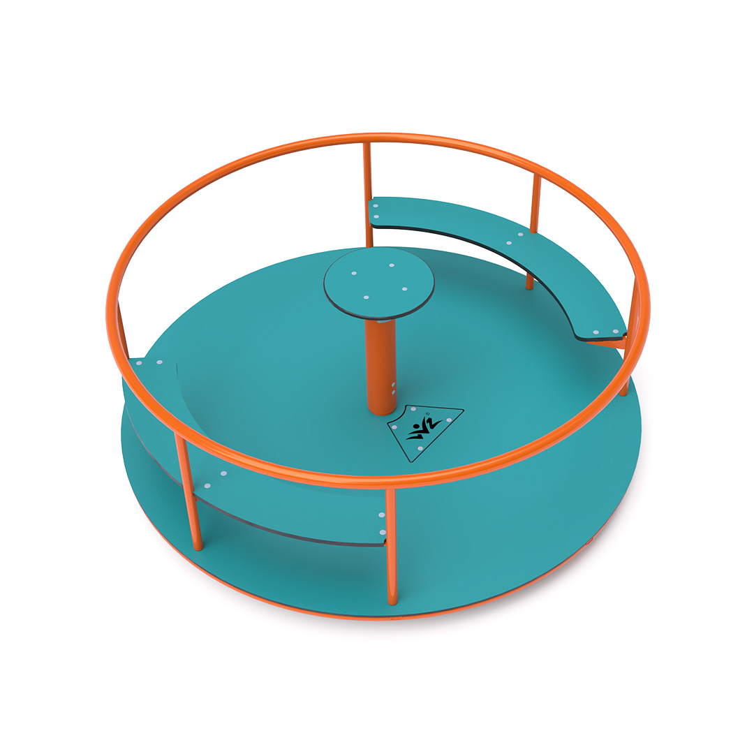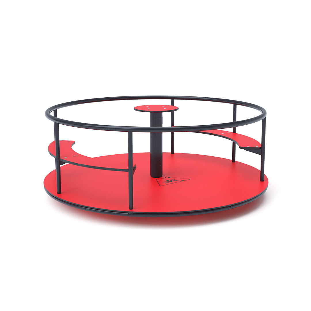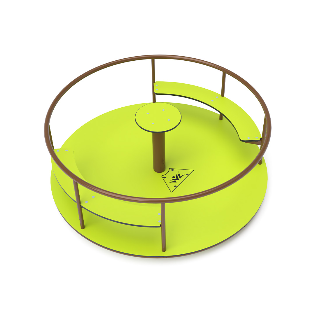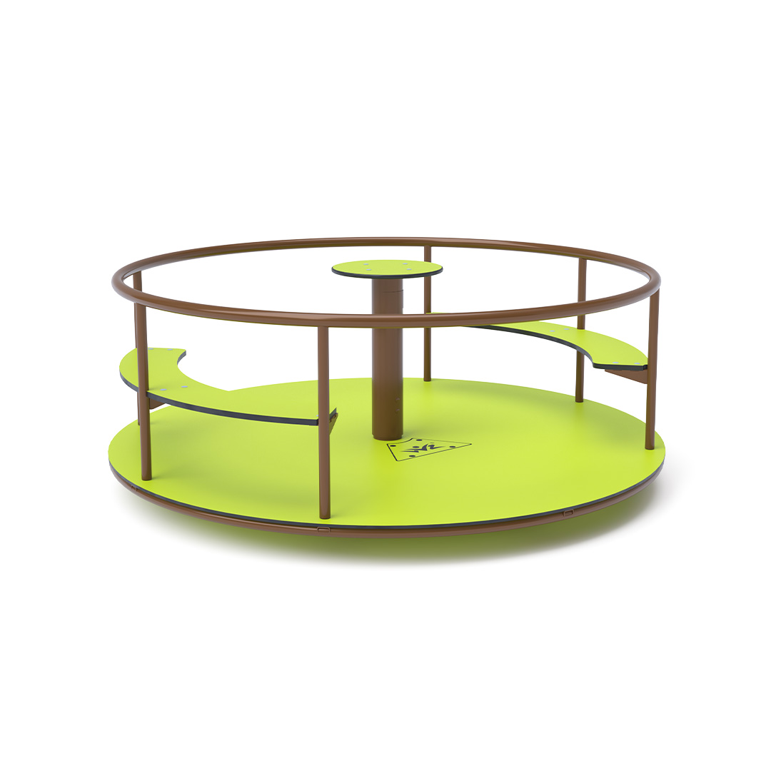 The children's spinning seat carousel with seating is made of hot-dip galvanized steel, coated with powder-coated paint for increased durability and operational safety. It is designed to achieve a long lifespan and ensure operational safety. The central steering wheel, floor, and seats are constructed from eco-friendly HPL material, which is UV-resistant, non-toxic, recyclable, and shatterproof, eliminating the risk of children getting injured by sharp edges or fragments.