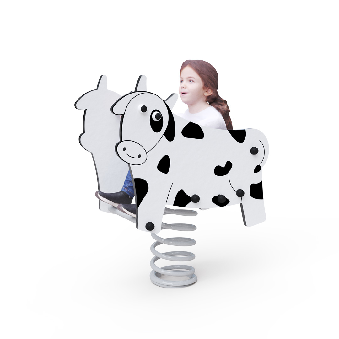 Materials and construction of the spring rocker with a cow motif ensure long life and safety. The steel spring with a durable surface treatment and HPL material guarantee durability, color stability, and safety. HPL material is chemically resistant, UV resistant, non-toxic, recyclable, and shatterproof, ensuring children are protected from sharp edges or fragments. Spring rockers can be placed on grass, playgrounds with gravel or sand, or you can use a grass reinforcement mat, rubber mat, or EPDM underneath. All spring rockers comply with the safety standard STN EN 1176.