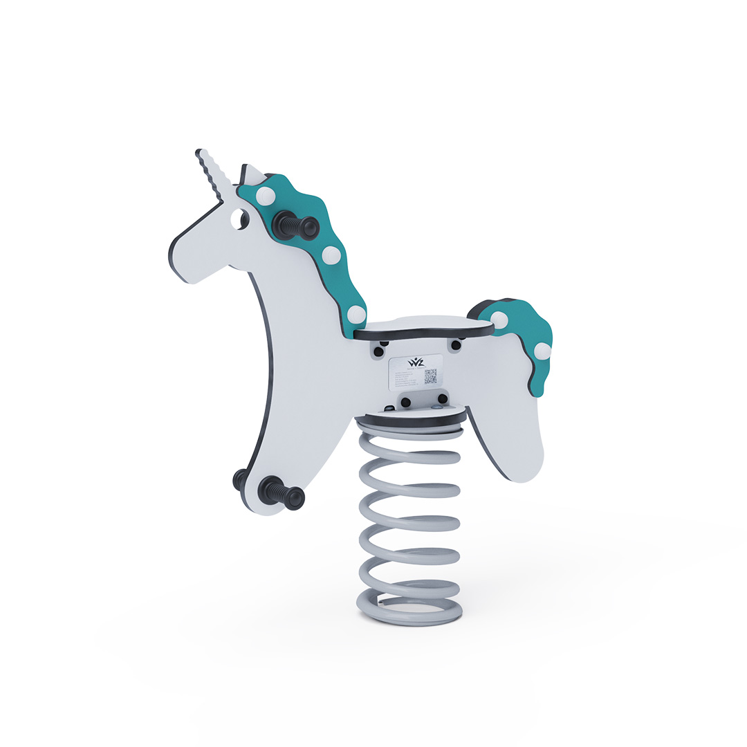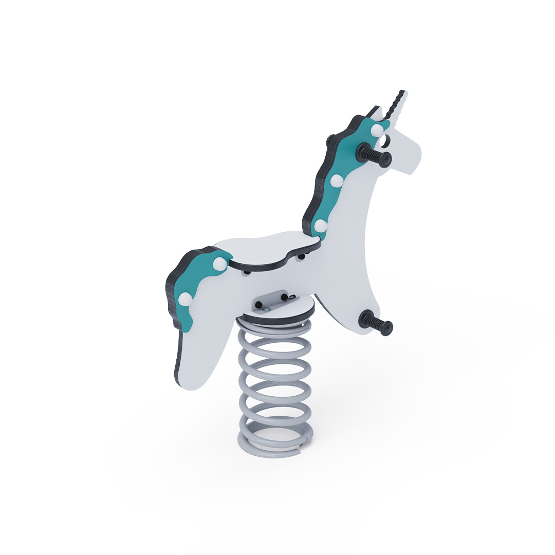 Materials and construction of the spring rocker with a unicorn motif ensure long life and safety. The steel spring with a durable surface treatment and HPL material guarantee durability, color stability, and safety. HPL material is chemically resistant, UV resistant, non-toxic, recyclable, and shatterproof, ensuring children are protected from sharp edges or fragments. Spring rockers can be placed on grass, playgrounds with gravel or sand, or you can use a grass reinforcement mat, rubber mat, or EPDM underneath. All spring rockers comply with the safety standard STN EN 1176.